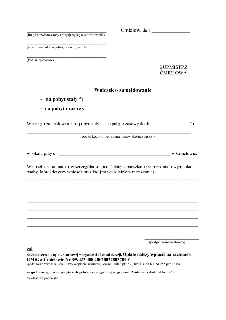 ______________________________ Ćmielów, dnia _________________ (Imię i nazwisko-osoby ubiegającej się o zameldowanie) ______________________________ (adres zamieszkania, ulica, nr domu, nr lokalu) ______________________________ (kod, miejscowość) BURMISTRZ ĆMIELOWA Wniosek o zameldowanie - na pobyt stały *) - na pobyt czasowy Wnoszę o zameldowanie na pobyt stały - na pobyt czasowy do dnia________________*) ________________________________________________________________________ (podać kogo, imię/imiona i nazwisko/nazwiska ) ___________________________________________________________________________ w lokalu przy ul. _________________________________________________ w Ćmielowie. Wniosek uzasadniam: ( w szczególności podać datę zamieszkania w przedmiotowym lokalu osoby, której dotyczy wniosek oraz kto jest właścicielem mieszkania) ___________________________________________________________________________ ___________________________________________________________________________ ___________________________________________________________________________ ___________________________________________________________________________ ___________________________________________________________________________ ___________________________________________________________________________ ___________________________________________________________________________ ________________________ (podpis wnioskodawcy) zał. dowód uiszczenia opłaty skarbowej w wysokości 10 zł. od decyzji. Opłatę należy wpłacić na rachunek UMiGw Ćmielowie Nr 35942300002002002480370001 -podstawa prawna: zał. do ustawy o opłacie skarbowej, część I, rub.2 pkt 53 ( Dz.U. z 2006 r. Nr 255 poz.1635) -wypełnione zgłoszenie pobytu stałego lub czasowego trwającego ponad 3 miesiące ( druk E-1 lub E-3). *) właściwe podkreślić