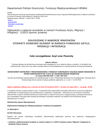Departament Polityki Granicznej i Funduszy Międzynarodowych MSWiA Źródło: http://fundusze.mswia.gov.pl/ue/nabory-projektow/archiwalne/fundusz-azylu-migracji/12493,Ogloszenie-o-naborze-wnioskoww-ramach-Funduszu-Azylu-Migracji-i-Integracji-1201.html Wygenerowano: Wtorek, 7 marca 2017, 22:06 Drukuj Generuj PDF Powiadom znajomego Wstecz Ogłoszenie o naborze wniosków w ramach Funduszu Azylu, Migracji i Integracji - 1/2015 (pomoc prawna) OGŁOSZENIE O NABORZE WNIOSKÓW OTWARTY KONKURS GŁÓWNY W RAMACH FUNDUSZU AZYLU, MIGRACJI I INTEGRACJI Cele szczegółowe: Azyl oraz Powroty Zakres naboru: Poprawa dostępu do poradnictwa prawnego osób ubiegających się o nadanie statusu uchodźcy, w ośrodkach dla cudzoziemców i poza nimi oraz osób w sprawie których trwa postępowanie w sprawie powrotu do kraju pochodzenia. DEPARTAMENT WSPÓŁPRACY MIEDZYNARODOWEJ I FUNDUSZY EUROPEJSKICH OGŁASZA NABÓR WNIOSKÓW W TRYBIE KONKURSOWYM NR 1/2015 NA DOFINANSOWANIE PROJEKTÓW na kwotę 500 000 EUR = 2 087 100 PLN* (liczone wg średniego miesięcznego kursu publikowanego w serii C Oficjalnego Dziennika Unii Europejskiego, liczonego dla 6 miesięcznego okresu sprzed miesiąca publikacji ogłoszenia, tj. 1 euro = 4,1742 PLN) Nabór projektów odbywa się w okresie od dnia 29 kwietnia 2015 r. do dnia 22 maja 2015 r., do godz. 16.00. 2 oryginały wniosku w języku polskim wraz z 2 egzemplarzami załączników (wszystkie dokumenty muszą być podpisane i parafowane na każdej stronie oraz poświadczone za zgodność z oryginałem – jeśli dotyczy) oraz skanami wszystkich dokumentów na płycie CD/DVD powinny być dostarczone w kopercie lub paczce, drogą pocztową, przesyłką kurierską (w tych przypadkach decyduje data stempla pocztowego lub dowodu nadania) lub osobiście do Ministerstwa Spraw Wewnętrznych na adres: Ministerstwo Spraw Wewnętrznych Departament Współpracy Międzynarodowej i Funduszy Europejskich ul. Batorego 5 02-591 Warszawa Koperta lub paczka sformułowaniami: ● zawierająca kompletną dokumentację aplikacyjną powinna być opatrzona następującymi wniosek o dofinansowanie projektu w ramach naboru nr 1/2015 Funduszu Azylu, Migracji i Integracji na działanie Pomoc prawna ● ● ● pełna nazwa Wnioskodawcy adres Wnioskodawcy tytuł projektu Termin dostarczenia wniosku nie może być późniejszy niż 10 dni kalendarzowych następujących po dniu zakończenia naboru. Dodatkowe informacje dot. naboru udzielane są w formie pisemnej. Korespondencja w sprawie złożonych wniosków przekazywana jest wnioskodawcy przez Departament Współpracy Międzynarodowej i Funduszy Europejskich MSW faksem lub pocztą elektroniczną – zgodnie z danymi podanymi przez wnioskodawcę we wniosku aplikacyjnym. Termin wniesienia pisma liczony jest od terminu przekazania wnioskodawcy informacji faksem (data liczona od potwierdzenia przesłania faksu) lub terminu przesłania wiadomości pocztą elektroniczną za potwierdzeniem odbioru. Odpowiedź na zapytanie wnioskodawcy przekazywana jest w terminie 5 dni roboczych. Zapytania należy kierować na adres poczty elektronicznej: [email protected] Załączniki Ogłoszenie o naborze wniosków w ramach Funduszu Azylu, Migracji i Integracji - 1/2015 (Pomoc Prawna) (pdf) 391.98 KB Formularz wniosku o przyznanie dofinansowania w ramach Funduszu Azylu, Migracji i Integracji (doc) 209.5 KB Formularz budżetu projektu w ramach Funduszu Azylu, Migracji i Integracji (xlsx) 26.36 KB Formularz wskaźników projektu w ramach Funduszu Azylu, Migracji i Integracji (xls) 37.5 KB Wzór umowy dotyczącej projektu dofinansowanego ze środków Funduszu Azylu, Migracji i Integracji (doc) 304.5 KB Podręcznik Beneficjenta Funduszu Azylu, Migracji i Integracji (pdf) 1.25 MB Arkusz Oceny Formalnej wniosku o dofinansowanie z Funduszu Azylu, Migracji i Integracji (doc) 73.5 KB Arkusz Oceny Merytorycznej wniosku o dofinansowanie z Funduszu Azylu, Migracji i Integracji (doc) 112 KB Osoba publikująca: Administrator DWMiFE, liczba wejść: 2314