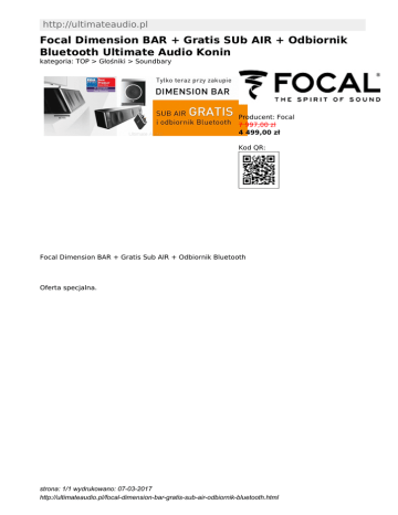http://ultimateaudio.pl Focal Dimension BAR + Gratis SUb AIR + Odbiornik Bluetooth Ultimate Audio Konin kategoria: TOP > Głośniki > Soundbary Producent: Focal 7 997,00 zł 4 499,00 zł Kod QR: Focal Dimension BAR + Gratis Sub AIR + Odbiornik Bluetooth Oferta specjalna. strona: 1/1 wydrukowano: 07-03-2017 http://ultimateaudio.pl/focal-dimension-bar-gratis-sub-air-odbiornik-bluetooth.html