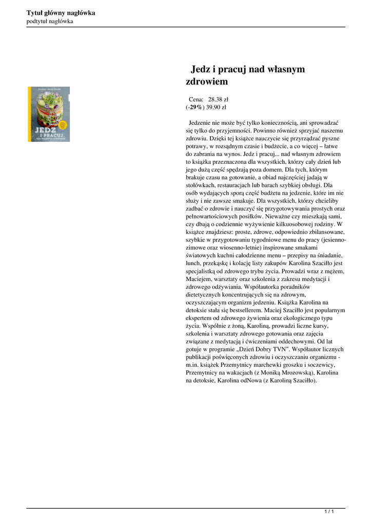 Tytuł główny nagłówka podtytuł nagłówka Jedz i pracuj nad własnym zdrowiem Cena: 28.38 zł (-29%) 39.90 zł Jedzenie nie może być tylko koniecznością, ani sprowadzać się tylko do przyjemności. Powinno również sprzyjać naszemu zdrowiu. Dzięki tej książce nauczycie się przyrządzać pyszne potrawy, w rozsądnym czasie i budżecie, a co więcej – łatwe do zabrania na wynos. Jedz i pracuj... nad własnym zdrowiem to książka przeznaczona dla wszystkich, którzy cały dzień lub jego dużą część spędzają poza domem. Dla tych, którym brakuje czasu na gotowanie, a obiad najczęściej jadają w stołówkach, restauracjach lub barach szybkiej obsługi. Dla osób wydających sporą część budżetu na jedzenie, które im nie służy i nie zawsze smakuje. Dla wszystkich, którzy chcieliby zadbać o zdrowie i nauczyć się przygotowywania prostych oraz pełnowartościowych posiłków. Nieważne czy mieszkają sami, czy dbają o codziennie wyżywienie kilkuosobowej rodziny. W książce znajdziesz: proste, zdrowe, odpowiednio zbilansowane, szybkie w przygotowaniu tygodniowe menu do pracy (jesiennozimowe oraz wiosenno-letnie) inspirowane smakami światowych kuchni całodzienne menu – przepisy na śniadanie, lunch, przekąskę i kolację listy zakupów Karolina Szaciłło jest specjalistką od zdrowego trybu życia. Prowadzi wraz z mężem, Maciejem, warsztaty oraz szkolenia z zakresu medytacji i zdrowego odżywiania. Współautorka poradników dietetycznych koncentrujących się na zdrowym, oczyszczającym organizm jedzeniu. Książka Karolina na detoksie stała się bestsellerem. Maciej Szaciłło jest popularnym ekspertem od zdrowego żywienia oraz ekologicznego typu życia. Wspólnie z żoną, Karoliną, prowadzi liczne kursy, szkolenia i warsztaty zdrowego gotowania oraz zajęcia związane z medytacją i ćwiczeniami oddechowymi. Od lat gotuje w programie „Dzień Dobry TVN”. Współautor licznych publikacji poświęconych zdrowiu i oczyszczaniu organizmu m.in. książek Przemytnicy marchewki groszku i soczewicy, Przemytnicy na wakacjach (z Moniką Mrozowską), Karolina na detoksie, Karolina odNowa (z Karoliną Szaciłło). 1/1 Powered by TCPDF (www.tcpdf.org)