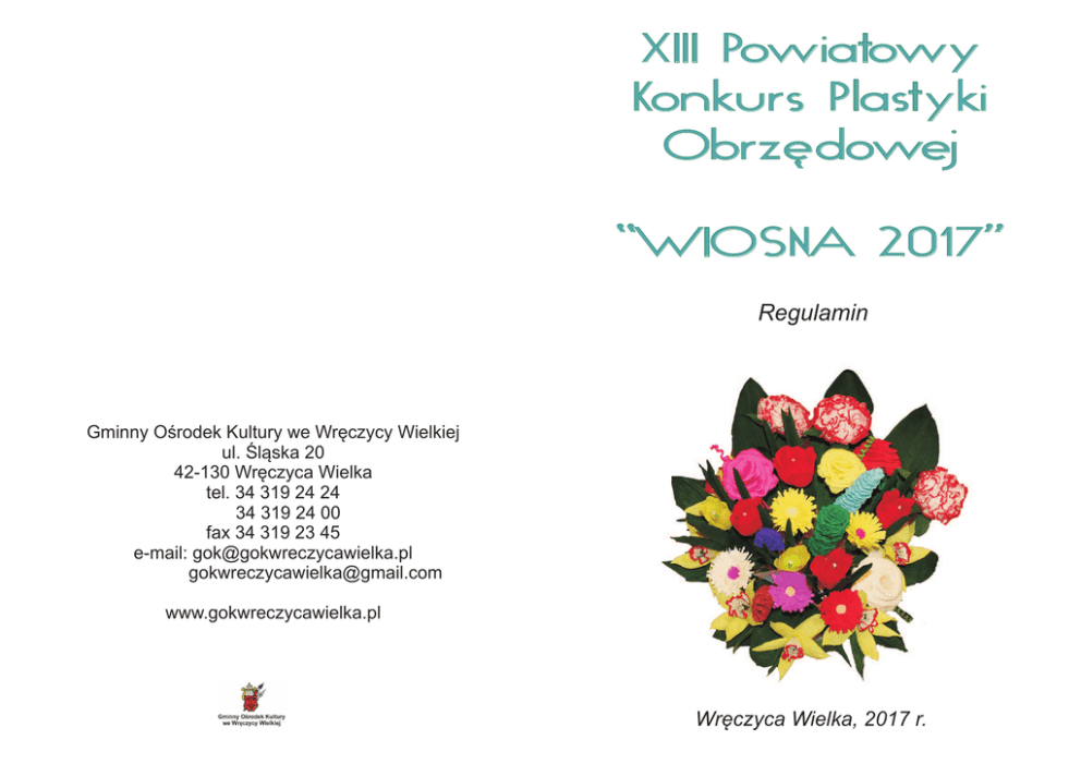 XIII Powiatowy Konkurs Plastyki Obrzêdowej “WIOSNA 2017” Regulamin Gminny Ośrodek Kultury we Wręczycy Wielkiej ul. Śląska 20 42-130 Wręczyca Wielka tel. 34 319 24 24 34 319 24 00 fax 34 319 23 45 e-mail: [email protected] [email protected] www.gokwreczycawielka.pl Wręczyca Wielka, 2017 r. XIII Powiatowy Konkurs Plastyki Obrzędowej „WIOSNA 2017” ORGANIZATORZY: - Gminny Ośrodek Kultury we Wręczycy Wielkiej - Stowarzyszenie „PROM” na Rzecz Rozwoju, Wspierania Kultury, Sportu i Turystyki Gminy Wręczyca Wielka CELE KONKURSU: - powrót do tradycji związanych z okresem Świąt Wielkanocnych i wiosny, - poszerzenie wiedzy wśród dzieci i młodzieży na temat tradycji polskich, - pobudzenie i zainteresowanie uczniów tradycją ludową, - promocja twórczości artystów ludowych, - zainteresowanie młodego pokolenia doroczną obrzędowością ludową i związanymi z nią rekwizytami plastycznymi. PRZEDMIOT KONKURSU: Przedmiotem konkursu jest wykonanie prac plastycznych związanych z doroczną obrzędowością i kultywowanymi nadal zwyczajami ludowymi (Wielkanocnymi), które będą oceniane przez etnografa i plastyków w następujących kategoriach: - gaik - palmy wielkanocne - zdobienie jaj wielkanocnych ( kraszanki, pisanki) - kukły „Marzanny” - kwiaty, bukiety bibułkowe, papierowe - pająki sufitowe - maski obrzędowe (np. Herodów, niedźwiedzi, maski świata) INFORMACJE DODATKOWE: Wszystkie prace powinny być wykonane zgodnie z tradycjami danego regionu. Technika wykonania prac jest dowolna (z materiałów tradycyjnych, naturalnych). Prace powinny być wykonane własnoręcznie, źródłem inspiracji powinny być tradycje rodzinnego domu i terenu własnej „małej ojczyzny”. Prace zakupione, zgłoszone do konkursu, nie będą oceniane! Każdy uczestnik może zgłosić jedną pracę w każdej kategorii! Prace zgłoszone do konkursu nie podlegają odbiorowi, pozostają do dyspozycji Organizatora! Konkurs jest otwarty i dostępny dla wszystkich grup wiekowych. Prace konkursowe, czytelnie opisane (imię i nazwisko autora, klasa, adres), z wypełnioną kartą zgłoszenia należy dostarczyć w dniach 27 i 28 marca 2017 r. (poniedziałek, wtorek), w godzinach 8.00 – 17.00 do GOK we Wręczycy Wielkiej. W dniu 5 kwietnia (środa) 2017 r. o godz. 13.00 zapraszamy uczestników konkursu na ogłoszenie wyników, rozdanie nagród i otwarcie wystawy pokonkursowej. Wszystkie prace biorą udział w wystawie. PO ROZDANIU NAGRÓD ZAPRASZAMY WSZYSTKICH NA UROCZYSTE OTWARCIE DEGUSTACJI STOŁU WIELKANOCNEGO PRZYGOTOWANEGO PRZEZ PANIE Z KOŁA GOSPODYŃ WIEJSKICH NASZEJ GMINY. Organizatorzy zastrzegają sobie prawo do bezpłatnej reprodukcji prac uczestników konkursu w prasie, telewizji, Internecie i katalogu w celu promocji konkursu. Nadesłanie pracy konkursowej jest równoznaczne z uznaniem przez jej autora warunków niniejszego regulaminu. SERDECZNIE ZAPRASZAMY DO UDZIAŁU W KONKURSIE I ŻYCZYMY SUKCESÓW !!!