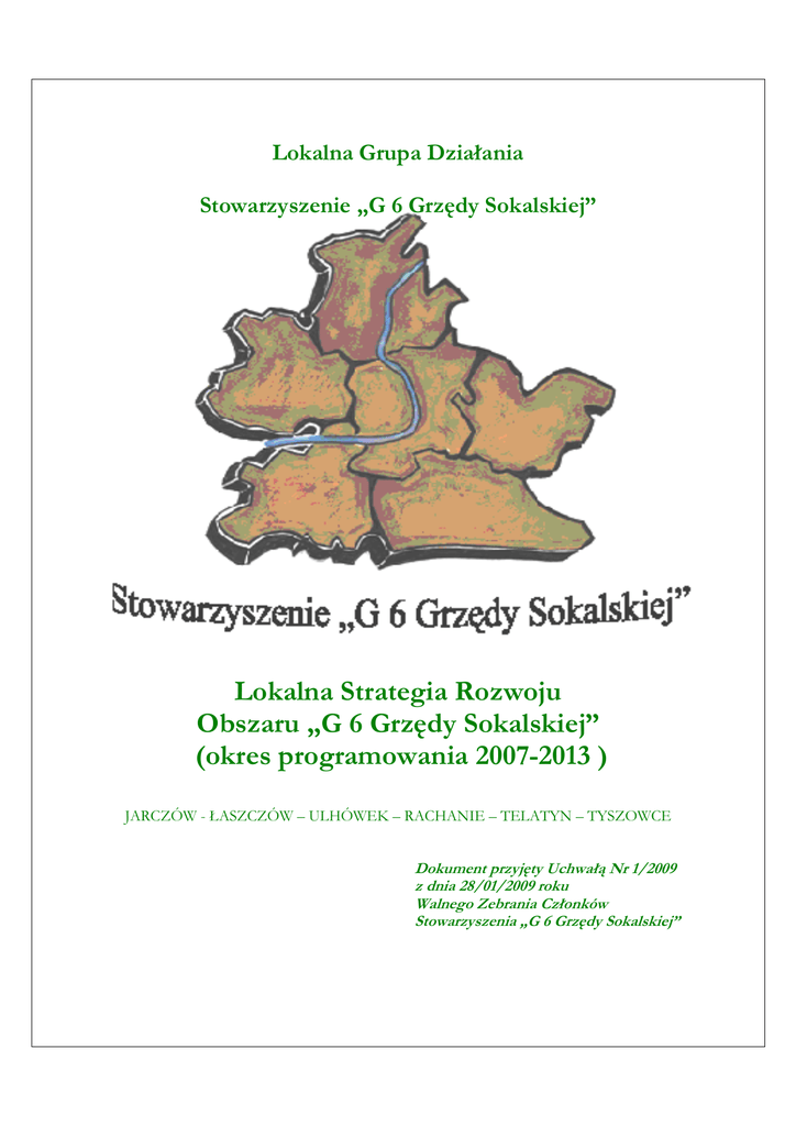 Lokalna Grupa Działania Stowarzyszenie „G 6 Grzędy Sokalskiej” Lokalna Strategia Rozwoju Obszaru „G 6 Grzędy Sokalskiej” (okres programowania 2007-2013 ) JARCZÓW - ŁASZCZÓW – ULHÓWEK – RACHANIE – TELATYN – TYSZOWCE Dokument przyjęty Uchwałą Nr 1/2009 z dnia 28/01/2009 roku Walnego Zebrania Członków Stowarzyszenia „G 6 Grzędy Sokalskiej” Lokalna Strategia Rozwoju Obszaru „G 6 Grzędy Sokalskiej” Spis treści Wprowadzenie..............................................................................................................................4 1. Charakterystyka lokalnej grupy działania (LGD) jako jednostki odpowiedzialnej za realizację lokalnej strategii rozwoju (LSR) ....................................................................................................5 1.1. Nazwa i status prawny LGD oraz data wpisu do Krajowego Rejestru Sądowego i numer w tym rejestrze ..................................................................................................................................5 1.2. Opis procesu budowania partnerstwa......................................................................................5 1.3. Charakterystyka członków LGD albo jej partnerów i sposób rozszerzenia/zmiany składu LGD .............................................................................................................................................7 1.4. Struktura rady lub innego organu LGD, do którego wyłącznej właściwości naleŜy wybór operacji zgodnie z art. 62 ust. 4 rozporządzenia nr 1698/2005, zwanych dalej „organem decyzyjnym” ................................................................................................................................10 1.5. Zasady i procedury funkcjonowania LGD oraz organu decyzyjnego .....................................12 1.5.1. Zasady powołania członków/osób reprezentujących członków organu decyzyjnego LGD, uregulowane zapisami statutowymi................................................................................13 1.5.2. Zasady odwołania poszczególnych członków/osób reprezentujących członków organu decyzyjnego LGD, uregulowane zapisami statutowymi............................................................14 1.5.3. Opis procedury funkcjonowania organu decyzyjnego .....................................................14 1.6. Kwalifikacje i doświadczenie osób wchodzących w skład organu decyzyjnego ..................16 1.7. Doświadczenie LGD i członków LGD albo jej partnerów w realizacji operacji.................16 2. Opis obszaru objętego LSR wraz z uzasadnieniem jego wewnętrznej spójności...................... 17 2.1. Wykaz gmin wchodzących w skład LGD, albo będących jej partnerami................................17 2.2. Uwarunkowania przestrzenne (mapa). Geograficzne, przyrodnicze, historyczne i kulturowe.17 2.3. Ocena społeczno - gospodarcza obszaru (w tym potencjał demograficzny i gospodarczy obszaru oraz poziom aktywności społecznej) ..............................................................................28 Od kilku lat na obszarze G6 występuje zjawisko zamykania małych szkół wiejskich. Przyczyna likwidacji jest pogarszająca się struktura demograficzna ludności w zakresie zmniejszania się liczby dzieci. ............................................................................................................................34 2.4. Specyfika obszaru..................................................................................................................36 3. Analiza SWOT dla obszaru objętego LSR; wnioski wynikające z przeprowadzonej analizy......... 37 3. Analiza SWOT dla obszaru objętego LSR; wnioski wynikające z przeprowadzonej analizy......... 38 4. Określenie celów ogólnych i szczegółowych LSR oraz wskazanie planowanych przedsięwzięć słuŜących osiągnięciu poszczególnych celów szczegółowych, w ramach których będą realizowane operacje ..................................................................................................................................... 40 4.1. Cele ogólne LSR ...................................................................................................................40 4.1. Cele szczegółowe LSR ..........................................................................................................40 4.3. Opis planowanych do realizacji przedsięwzięć.......................................................................42 4.3. Wskaźniki produktu, rezultatu i oddziaływania dla kaŜdego przedsięwzięcia .........................50 5. Określenie misji LGD ......................................................................................................... 65 6. Wykazanie spójności specyfiki obszaru z celami LSR ........................................................... 66 7. Uzasadnienie podejścia zintegrowanego dla przedsięwzięć planowanych w ramach LSR ....... 70 8. Uzasadnienie podejścia innowacyjnego dla przedsięwzięć planowanych w ramach LSR......... 72 9. Określenie procedury oceny zgodności operacji z LSR, procedury wyboru operacji przez LGD, procedury odwołania od rozstrzygnięć organu decyzyjnego w sprawie wyboru operacji w ramach działania „WdraŜanie LSR”, kryteriów, na podstawie których jest oceniana zgodność operacji z LSR, oraz kryteriów wyboru operacji, a takŜe procedury zmiany tych kryteriów...................................... 73 2 Lokalna Strategia Rozwoju Obszaru „G 6 Grzędy Sokalskiej” Procedura oceny zgodności operacji z LSR..................................................................................73 Procedura wyboru operacji przez LGD .......................................................................................74 Procedura odwołania od decyzji Rady Programowej...................................................................75 Procedura zmiany kryteriów ...............