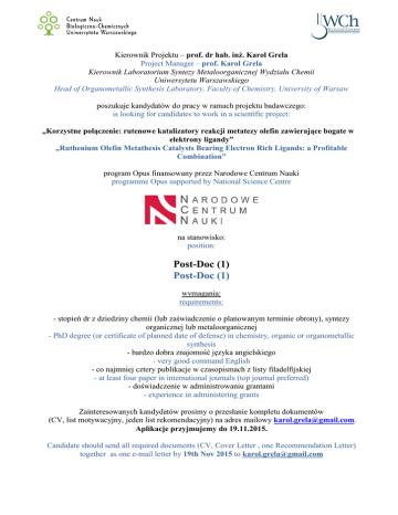 Kierownik Projektu – prof. dr hab. inż. Karol Grela Project Manager – prof. Karol Grela Kierownik Laboratorium Syntezy Metaloorganicznej Wydziału Chemii Uniwersytetu Warszawskiego Head of Organometallic Synthesis Laboratory, Faculty of Chemistry, University of Warsaw poszukuje kandydatów do pracy w ramach projektu badawczego: is looking for candidates to work in a scientific project: „Korzystne połączenie: rutenowe katalizatory reakcji metatezy olefin zawierające bogate w elektrony ligandy” „Ruthenium Olefin Metathesis Catalysts Bearing Electron Rich Ligands: a Profitable Combination” program Opus finansowany przez Narodowe Centrum Nauki programme Opus supported by National Science Centre na stanowisko: position: Post-Doc (1) Post-Doc (1) wymagania: requirements: - stopień dr z dziedziny chemii (lub zaświadczenie o planowanym terminie obrony), syntezy organicznej lub metaloorganicznej - PhD degree (or certificate of planned date of defense) in chemistry, organic or organometallic synthesis - bardzo dobra znajomość języka angielskiego - very good command English - co najmniej cztery publikacje w czasopismach z listy filadelfijskiej - at least four paper in international journals (top journal preferred) - doświadczenie w administrowaniu grantami - experience in administering grants Zainteresowanych kandydatów prosimy o przesłanie kompletu dokumentów (CV, list motywacyjny, jeden list rekomendacyjny) na adres mailowy [email protected]. Aplikacje przyjmujemy do 19.11.2015. Candidate should send all required documents (CV, Cover Letter , one Recommendation Letter) together as one e-mail letter by 19th Nov 2015 to [email protected]