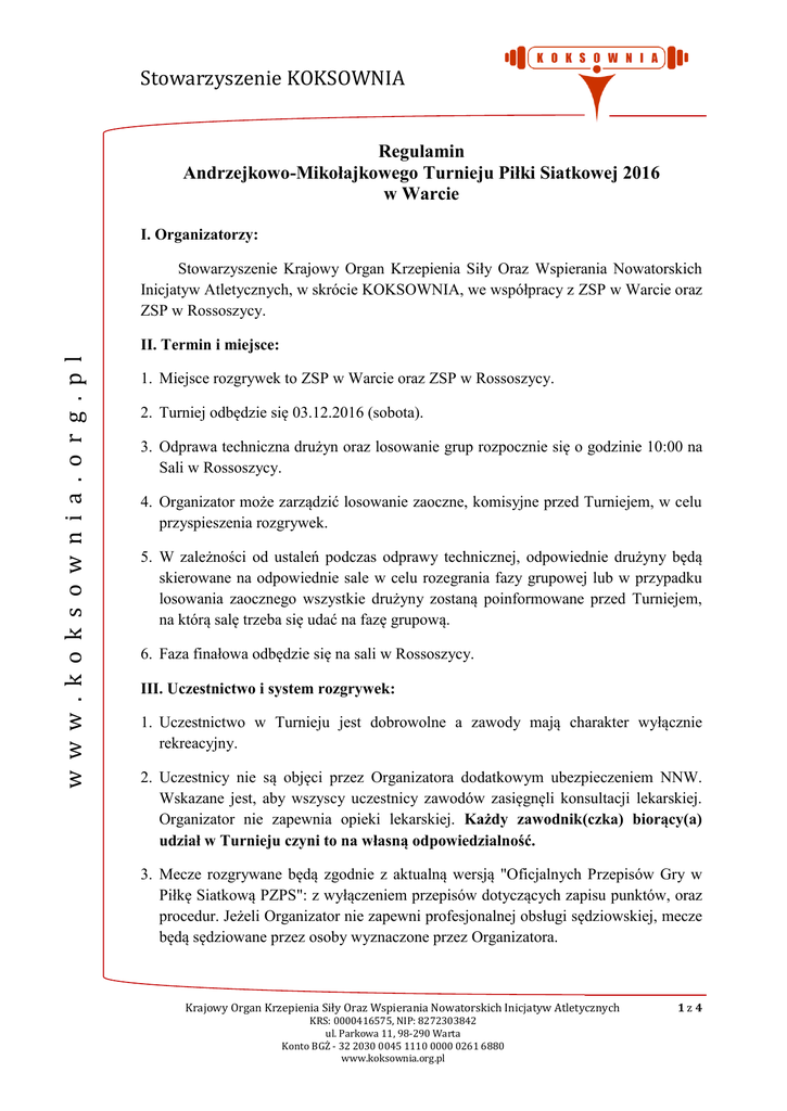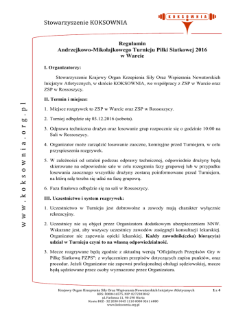 Stowarzyszenie KOKSOWNIA Regulamin Andrzejkowo-Mikołajkowego Turnieju Piłki Siatkowej 2016 w Warcie I. Organizatorzy: Stowarzyszenie Krajowy Organ Krzepienia Siły Oraz Wspierania Nowatorskich Inicjatyw Atletycznych, w skrócie KOKSOWNIA, we współpracy z ZSP w Warcie oraz ZSP w Rossoszycy. w w w . k o k s o w n i a . o r g . p l II. Termin i miejsce: 1. Miejsce rozgrywek to ZSP w Warcie oraz ZSP w Rossoszycy. 2. Turniej odbędzie się 03.12.2016 (sobota). 3. Odprawa techniczna drużyn oraz losowanie grup rozpocznie się o godzinie 10:00 na Sali w Rossoszycy. 4. Organizator może zarządzić losowanie zaoczne, komisyjne przed Turniejem, w celu przyspieszenia rozgrywek. 5. W zależności od ustaleń podczas odprawy technicznej, odpowiednie drużyny będą skierowane na odpowiednie sale w celu rozegrania fazy grupowej lub w przypadku losowania zaocznego wszystkie drużyny zostaną poinformowane przed Turniejem, na którą salę trzeba się udać na fazę grupową. 6. Faza finałowa odbędzie się na sali w Rossoszycy. III. Uczestnictwo i system rozgrywek: 1. Uczestnictwo w Turnieju jest dobrowolne a zawody mają charakter wyłącznie rekreacyjny. 2. Uczestnicy nie są objęci przez Organizatora dodatkowym ubezpieczeniem NNW. Wskazane jest, aby wszyscy uczestnicy zawodów zasięgnęli konsultacji lekarskiej. Organizator nie zapewnia opieki lekarskiej. Każdy zawodnik(czka) biorący(a) udział w Turnieju czyni to na własną odpowiedzialność. 3. Mecze rozgrywane będą zgodnie z aktualną wersją "Oficjalnych Przepisów Gry w Piłkę Siatkową PZPS": z wyłączeniem przepisów dotyczących zapisu punktów, oraz procedur. Jeżeli Organizator nie zapewni profesjonalnej obsługi sędziowskiej, mecze będą sędziowane przez osoby wyznaczone przez Organizatora. Krajowy Organ Krzepienia Siły Oraz Wspierania Nowatorskich Inicjatyw Atletycznych KRS: 0000416575, NIP: 8272303842 ul. Parkowa 11, 98-290 Warta Konto BGŻ - 32 2030 0045 1110 0000 0261 6880 www.koksownia.org.pl 1z4 Stowarzyszenie KOKSOWNIA w w w . k o k s o w n i a . o r g . p l 4. W przypadku liczby uczestniczących zespołów równej 2 lub 3 cały Turniej rozegrany będzie jako jedna grupa, w której każda drużyna zmierzy się z pozostałymi drużynami. Miejsca na podium będą ustalane w zalezności od zdobytych punktów (3 pkty za zwyciestwo 2:0, 2 pkty za zwycięstwo 2:1, 1 pkt za przegraną 1:2 oraz 0 pktów za przegraną 0:2), następnie stosunkiem punktów zdobytych do straconych we wszystkich meczach, a nastepnie w zależności od spotkania bezpośredniego. Wszystkie mecze w systemie z 2 lub 3 drużynami będą rozgrywane do trzech wygranych setów do 25 punktów (tiebreak do 15). 5. W przypadku liczby uczestniczących zespołów równej 4 cały Turniej rozegrany będzie jako jedna grupa, w której każda drużyna zmierzy się z pozostałymi drużynami. Miejsca na podium będą ustalane w zalezności od zdobytych punktów (3 pkty za zwyciestwo 2:0, 2 pkty za zwycięstwo 2:1, 1 pkt za przegraną 1:2 oraz 0 pktów za przegraną 0:2), następnie stosunkiem punktów zdobytych do straconych we wszystkich meczach, a nastepnie w zależności od spotkania bezpośredniego. Wszystkie mecze w systemie z 4 drużynami będą rozgrywane do dwóch wygranych setów do 25 punktów (tiebreak do 15). 6. W przypadku liczby uczestniczących zespołów równej 5 mecze w fazie grupowej będą rozgrywane systemem na dwie grupy maksymalnie 3 zespoły każda. Po zakończeniu meczów grupowych odbędą się dwa półfinały (pierwsze miejsce z grupy A zmierzy się z drugim miejscem z grupy B i na odwrót). W meczu o pierwsze miejsce Turnieju zmierzą się zwycięscy półfinałów, natomiast w meczu o miejsce trzecie zmierzą się przegrani półfinałów. W systemie z 5 drużynami wszystkie mecze będą rozgrywane do dwóch wygranych setów do 25 punktów (tiebreak do 15). 7. W przypadku liczby uczestniczących zespołów równej 6 mecze w fazie grupowej będą rozgrywane systemem na dwie grupy po 3 zespoły każda. Po zakończeniu meczów grupowych odbędą się dwa półfinały (pierwsze miejsce z grupy A zmierzy się z drugim miejscem z grupy B i na odwrót). W meczu o pierwsze miejsce Turnieju zmierzą się zwycięscy półfinałów, natomiast w meczu o miejsce trzecie zmierzą się przegrani półfinałów. W systemie z 6 drużynami wszystkie mecze będą rozgrywane do dwóch wygranych setów do 25 punktów (tiebreak do 15). 8. W przypadku liczby uczestniczących zespołów równej 7 lub 8, mecze w fazie grupowej będą rozgrywane systemem na dwie grupy po 3 lub 4 drużyny na grupę. Po zakończeniu meczów grupowych odbędą się dwa półfinały (pierwsze miejsce z grupy A zmierzy się z drugim miejscem z grupy B i na odwrót). W meczu o pierwsze miejsce Turnieju zmierzą się zwycięscy półfinałów, natomiast w meczu o miejsce trzecie zmierzą się przegrani półfinałów. W grupach czterodrużynowych w fazie grupowej wszystkie mecze będą rozgrywane do jednego wygranego seta do 25 Krajowy Organ Krzepienia Siły Oraz Wspierania Nowatorskich Inicjatyw Atletycznych KRS: 0000416575, NIP: 8272303842 ul. Parkowa 11, 98-290 Warta Konto BGŻ - 32 2030 0045 1110 0000 0261 6880 www.koksownia.org.pl 2z4 Stowarzyszenie KOKSOWNIA punktów (zmiana stron po zdobyciu 15 punktów przez jedną z drużyn). Pozostałe mecze w systemie na 7 lub 8 zespołów będą rozgrywane do dwóch wygranych setów do 25 punktów (tiebreak do 15). IV. Zgłoszenia: w w w . k o k s o w n i a . o r g . p l 1. W Turnieju mogą uczestniczyć zespoły, które zgłoszą wcześniej swój udział Organizatorowi, tzn. poprzez przesłanie zgłoszenia na adres e-mail: [email protected], lub też osobiście u jednego z Członków Stowarzyszenia (www.koksownia.org.pl). 2. Udział w Turnieju mają zagwarantowany zespoły zaproszone przez Organizatora. W pozostałych przypadkach obowiązuje pierwszeństwo zgłoszeń. V. Nagrody 1. Nagrodą za zwycięstwo KOKSOWNIA. jest Puchar ufundo