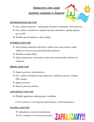 Wakacyjny plan zajęć świetlicy wiejskiej w Rojewie PONIEDZIAŁEK 9.00-13.00 Gry i zabawy sportowo - rekreacyjne dla dzieci i młodzieży- hala sportowa Gry i zabawy świetlicowe: konkurs karaoke, kalambury, zgaduj zgadula, gry na PSP Robótki ręczne (lepienie z masy solnej) WTOREK 11.00-15.00 Mini turnieje wakacyjne dla dzieci ( piłka nożna, tenis stołowy, piłka siatkowa, rowerowy tor przeszkód)-hala sportowa Wspólne czytanie bajek Zajęcia plastyczne- (rysowanie, malowanie, kolorowanki, biżuteria na wakacje), ŚRODA 10.00-13.00 Zajęcia sportowe -hala sportowa Gry i zabawy świetlicowe (gry planszowe: klasówka, puzzle, warcaby, PSP, szachy) Rajdy rowerowe Spacery piesze po okolicy CZWARTEK 15.00-19.00 Pikniki sportowo-rekreacyjne- świetlice 17.07-Liszkowo, 31.07-Rojewo,8.08-Ściborze, 14.08-Wybranowo PIĄTEK 15.00-19.00 Jednodniowe wycieczki autokarowe Gry i konkursy na świeżym powietrzu