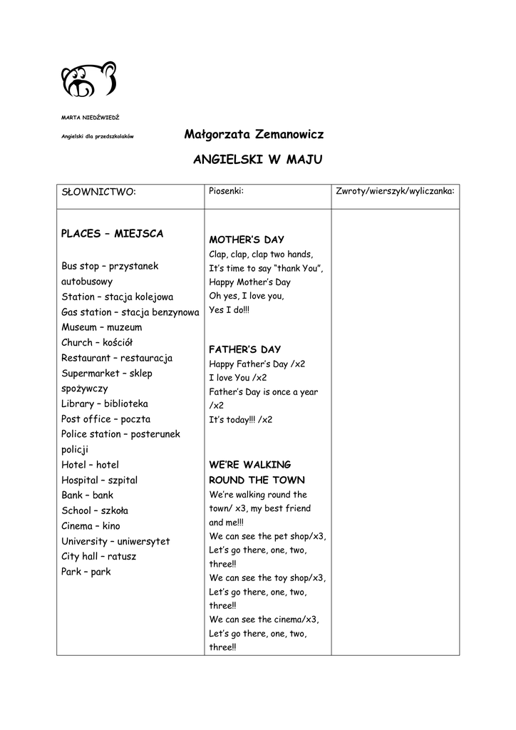 MARTA NIEDŹWIEDŹ Angielski dla przedszkolaków Małgorzata Zemanowicz ANGIELSKI W MAJU SŁOWNICTWO: PLACES – MIEJSCA Piosenki: MOTHER’S DAY Clap, clap, clap two hands, Bus stop – przystanek It’s time to say “thank You”, autobusowy Happy Mother’s Day Station – stacja kolejowa Oh yes, I love you, Gas station – stacja benzynowa Yes I do!!! Museum – muzeum Church – kościół Restaurant – restauracja Supermarket – sklep FATHER’S DAY Happy Father’s Day /x2 I love You /x2 spożywczy Father’s Day is once a year Library – biblioteka /x2 Post office – poczta It’s today!!! /x2 Police station – posterunek policji Hotel – hotel WE’RE WALKING Hospital – szpital ROUND THE TOWN Bank – bank We’re walking round the School – szkoła town/ x3, my best friend Cinema – kino and me!!! University – uniwersytet City hall – ratusz Park – park We can see the pet shop/x3, Let’s go there, one, two, three!! We can see the toy shop/x3, Let’s go there, one, two, three!! We can see the cinema/x3, Let’s go there, one, two, three!! Zwroty/wierszyk/wyliczanka: