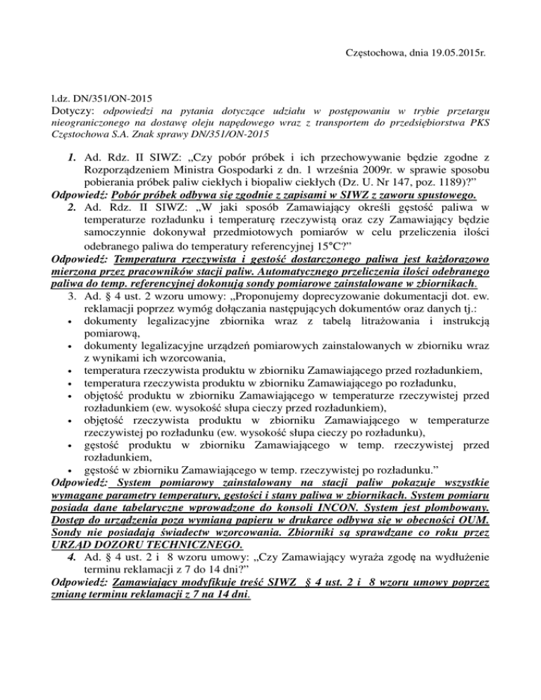 Częstochowa, dnia 19.05.2015r. l.dz. DN/351/ON-2015 Dotyczy: odpowiedzi na pytania dotyczące udziału w postępowaniu w trybie przetargu nieograniczonego na dostawę oleju napędowego wraz z transportem do przedsiębiorstwa PKS Częstochowa S.A. Znak sprawy DN/351/ON-2015 1. Ad. Rdz. II SIWZ: „Czy pobór próbek i ich przechowywanie będzie zgodne z Rozporządzeniem Ministra Gospodarki z dn. 1 września 2009r. w sprawie sposobu pobierania próbek paliw ciekłych i biopaliw ciekłych (Dz. U. Nr 147, poz. 1189)?” Odpowiedź: Pobór próbek odbywa się zgodnie z zapisami w SIWZ z zaworu spustowego. 2. Ad. Rdz. II SIWZ: „W jaki sposób Zamawiający określi gęstość paliwa w temperaturze rozładunku i temperaturę rzeczywistą oraz czy Zamawiający będzie samoczynnie dokonywał przedmiotowych pomiarów w celu przeliczenia ilości odebranego paliwa do temperatury referencyjnej 15°C?” Odpowiedź: Temperatura rzeczywista i gęstość dostarczonego paliwa jest każdorazowo mierzona przez pracowników stacji paliw. Automatycznego przeliczenia ilości odebranego paliwa do temp. referencyjnej dokonują sondy pomiarowe zainstalowane w zbiornikach. 3. Ad. § 4 ust. 2 wzoru umowy: „Proponujemy doprecyzowanie dokumentacji dot. ew. reklamacji poprzez wymóg dołączania następujących dokumentów oraz danych tj.: • dokumenty legalizacyjne zbiornika wraz z tabelą litrażowania i instrukcją pomiarową, • dokumenty legalizacyjne urządzeń pomiarowych zainstalowanych w zbiorniku wraz z wynikami ich wzorcowania, • temperatura rzeczywista produktu w zbiorniku Zamawiającego przed rozładunkiem, • temperatura rzeczywista produktu w zbiorniku Zamawiającego po rozładunku, • objętość produktu w zbiorniku Zamawiającego w temperaturze rzeczywistej przed rozładunkiem (ew. wysokość słupa cieczy przed rozładunkiem), • objętość rzeczywista produktu w zbiorniku Zamawiającego w temperaturze rzeczywistej po rozładunku (ew. wysokość słupa cieczy po rozładunku), • gęstość produktu w zbiorniku Zamawiającego w temp. rzeczywistej przed rozładunkiem, • gęstość w zbiorniku Zamawiającego w temp. rzeczywistej po rozładunku.” Odpowiedź: System pomiarowy zainstalowany na stacji paliw pokazuje wszystkie wymagane parametry temperatury, gęstości i stany paliwa w zbiornikach. System pomiaru posiada dane tabelaryczne wprowadzone do konsoli INCON. System jest plombowany. Dostęp do urządzenia poza wymianą papieru w drukarce odbywa się w obecności OUM. Sondy nie posiadają świadectw wzorcowania. Zbiorniki są sprawdzane co roku przez URZĄD DOZORU TECHNICZNEGO. 4. Ad. § 4 ust. 2 i 8 wzoru umowy: „Czy Zamawiający wyraża zgodę na wydłużenie terminu reklamacji z 7 do 14 dni?” Odpowiedź: Zamawiający modyfikuje treść SIWZ § 4 ust. 2 i 8 wzoru umowy poprzez zmianę terminu reklamacji z 7 na 14 dni.