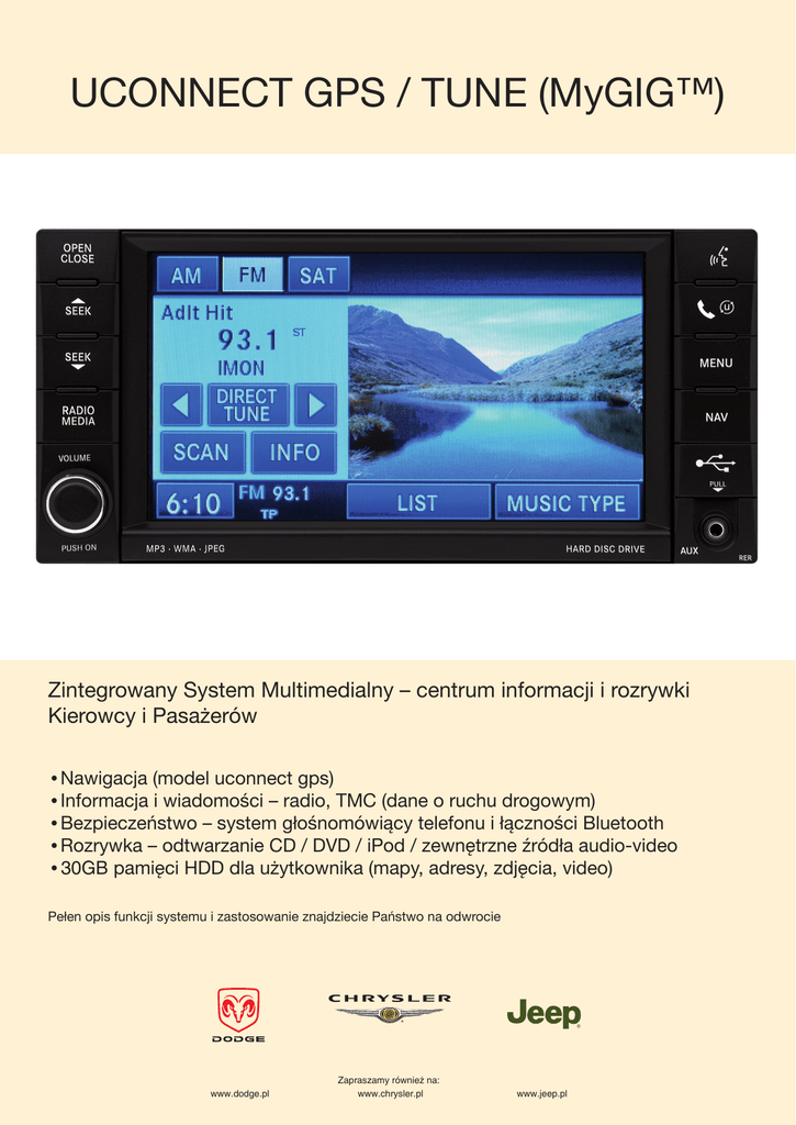 UCONNECT GPS / TUNE (MyGIG™) UCONNECT GPS / TUNE (MyGIG™) Zintegrowany System Multimedialny – centrum informacji i rozrywki Kierowcy i Pasażerów Zintegrowany System Multimedialny – centrum informacji i rozrywki Nawigacja (model uconnect gps) Kierowcy i Pasażerów Informacja i wiadomości – radio, TMC (dane o ruchu drogowym) Bezpieczeństwo – system głośnomówiący telefonu i łączności Bluetooth Rozrywka odtwarzanie CD gps) / DVD / iPod / zewnętrzne źródła audio-video Nawigacja–(model uconnect 20GB pamięci HDD dla użytkownika video) Informacja i wiadomości – radio, TMC(mapy, (dane adresy, o ruchuzdjęcia, drogowym) Bezpieczeństwo – system głośnomówiący telefonu i łączności Bluetooth Rozrywka – odtwarzanie CD / DVD / iPod / zewnętrzne źródła audio-video 30GB pamięci HDD dla użytkownika (mapy, adresy, zdjęcia, video) 20GB Pełen opis funkcji systemu i zastosowanie znajdziecie Państwo na odwrocie Pełen opis funkcji systemu i zastosowanie znajdziecie Państwo na odwrocie www.dodge.pl Zapraszamy również na: www.chrysler.pl www.jeep.pl System multimedialny z nawigacją uconnect gps (wcześniejsza nazwa MyGIG) Multimedia Navigation system uconnect gps (prev. MyGIG) Opis funkcji i właściwości: - nawigacja na twardym dysku z mapą Europy (włączając Polskę) / Hard Disc Drive GPS Navigation - informacja o ruchu drogowym / Traffic Message Channel - pełnokolorowy wyświetlacz z obrazem 3D z lotu ptaka / Full color map screen with 3D Bird’s Eye View - wielokrotna równoczesna kalkulacja trasy podróży / Multiple simultaneous route calculation - zapamiętywanie przebytych tras z możliwością edycji / Trip storage and editing - system odtwarzania nagrań video / Video Entertainment System (VES) - odtwarzanie DVD z panelu centralnego lub zewnętrznego źródła DVD / Play DVD from head-unit or external DVD - odtwarzanie nagrań video na ekranie głównym podczas parkowania / Displays video output on head-unit while in park - sterowanie systemem video z panelu centralnego lub zewnętrznego DVD / Control VES from head-unit or external DVD - równoczesna współpraca z 3-ma źródłami dźwięku / Supports 3 simultaneous audio output sources - równoczesna współpraca z 2-ma źródłami obrazu / Supports 2 simultaneous video sources - 30 GB pamięci dysku dla nawigacji, muzyki, zdjęć / 30 GB HDD for nav, music & photos - możliwość zapisu 1600 utworów muzycznych / memory storage up to 1600 songs - wgrywanie danych na dysk poprzez CD lub USB / Transfer data to HDD via CD/USB - zintegrowany system głośnomówiący telefonu (wymagany mikrofon) / Integrated hands-free phone (microphone required) - nagrywanie wiadomości głosowych - wymagany mikrofon / Voice memo recorder (microphone required) - sterowanie i kontrola systemu audio, nawigacji i telefonu / Command & control functionality for audio, nav, phone - adaptacyjna nauka rozpoznawania głosu / Adaptive voice learning - przyjmowanie komend i pomoc dla języków: angielski, niemiecki, francuski, hiszpański, włoski, holenderski / supports Dutch, English, French, German, Italian & Spanish - kompatybilność USB i Bluetooth / USB & Bluetooth Compatibility - port USB 2.0 do wgrywania plików na dysk twardy / USB 2,0 port for file transfer to HDD - wejście dla sygnału z MP3/iPod / AUX input for MP3/iPod - obraz z kamery parkowania tyłem / Rear Park Assist Camera View System do modeli / System to: Chrysler Voyager (RT) LX (2008 - ) Jeep Commander (XH) Laredo (2008 - ) Chrysler Voyager (RT) Limited (2008 - ) Jeep Commander (XH) Limited (2008 - ) Chrysler Voyager (RT) Touring (2008 - ) Jeep Commander (XH) Overland (2008 - ) Chrysler 300C (LE48) Base (2008 - ) Jeep Grand Cherokee (WH) Laredo (2008 - ) Chrysler 300C (LE48) SRT8 (2008 - ) Jeep Grand Cherokee (WH) Limited (2008 - ) Chrysler 300C Touring (LE49) Base (2008 - ) Jeep Grand Cherokee (WH) Overland (2008 - ) Chrysler 300C Touring (LE49) SRT8 (2008 - ) Jeep Grand Cherokee (WH) SRT8 (2008 - ) Chrysler Sebring (JS-C27) Limited (2007 - ) Jeep Wrangler (JK72) (2007 - ) Chrysler Sebring (JS-C27) Touring (2007 - ) Jeep Wrangler (JK74) (2007 - ) Chrysler Sebring (JS-C41) Limited (2007 - ) Jeep Patriot (MK74) Sports (2009 - ) Chrysler Sebring (JS-C41) Touring (2007 - ) Jeep Patriot (MK74) Limited (2009 - ) Dodge Avenger (JS-D41) SE, SXT (2007 - ) Jeep Compass (MK49) Base (2009 - ) Dodge Caliber (PM49) SE, SXT (2009 - ) Jeep Compass (MK49) Limited (2009 - ) Dodge Nitro (KA) SE, SXT (2007 - ) Jeep Cherokee (KK) (2008 - ) Dla niektórych wersji jest również dostępny powyższy system multimedialny w wersji bez nawigacji - uconnect tunes. Dodatkowych szczegółowych wyjaśnień i informacji udzieli Państwu Dealer lub Autoryzowany Serwis Chrysler Jeep Dodge. Chrysler LLC zastrzega sobie możliwość wprowadzania zmian bez powiadomienia. Informacja przygotowana wg stanu na dzień 2008.06.30. Wszelkie prawa zastrzeżone. Chrysler, Dodge i Jeep są prawnie chronionymi znakami towarowymi korporacji Chrysler LLC.