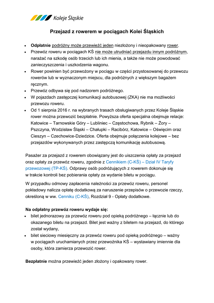 Przejazd z rowerem w pociągach Kolei Śląskich Odpłatnie podróżny może przewieźć jeden niezłożony i nieopakowany rower. Przewóz roweru w pociągach KŚ nie może utrudniać przejazdu innym podróżnym, narażać na szkodę osób trzecich lub ich mienia, a także nie może powodować zanieczyszczenia i uszkodzenia wagonu. Rower powinien być przewożony w pociągu w części przystosowanej do przewozu rowerów lub w wyznaczonym miejscu, dla podróżnych z większym bagażem ręcznym. Przewóz odbywa się pod nadzorem podróżnego. W pojazdach zastępczej komunikacji autobusowej (ZKA) nie ma możliwości przewozu roweru. Od 1 sierpnia 2016 r. na wybranych trasach obsługiwanych przez Koleje Śląskie rower można przewozić bezpłatnie. Powyższa oferta specjalna obejmuje relacje: Katowice – Tarnowskie Góry – Lubliniec – Częstochowa, Rybnik – Żory – Pszczyna, Wodzisław Śląski – Chałupki – Racibórz, Katowice – Oświęcim oraz Cieszyn – Czechowice-Dziedzice. Oferta obejmuje połączenia kolejowe – bez przejazdów wykonywanych przez zastępczą komunikację autobusową. Pasażer za przejazd z rowerem obowiązany jest do uiszczenia opłaty za przejazd oraz opłaty za przewóz roweru, zgodnie z Cennikiem (C-KŚ) – Dział IV Taryfy przewozowej (TP-KŚ). Odprawy osób podróżujących z rowerem dokonuje się w trakcie kontroli bez pobierania opłaty za wydanie biletu w pociągu. W przypadku odmowy zapłacenia należności za przewóz roweru, personel pokładowy nalicza opłatę dodatkową za naruszenie przepisów o przewozie rzeczy, określoną w ww. Cenniku (C-KŚ), Rozdział 9 - Opłaty dodatkowe. Na odpłatny przewóz roweru wydaje się: bilet jednorazowy za przewóz roweru pod opieką podróżnego – łącznie lub do okazanego biletu na przejazd. Bilet jest ważny z biletem na przejazd, do którego został wydany, bilet sieciowy miesięczny za przewóz roweru pod opieką podróżnego – ważny w pociągach uruchamianych przez przewoźnika KŚ – wystawiany imiennie dla osoby, która zamierza przewozić rower. Bezpłatnie można przewieźć jeden złożony i opakowany rower.
