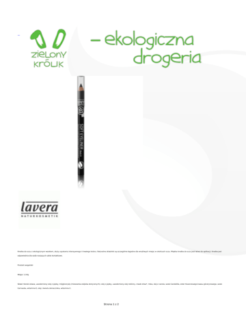 Kredka do oczu z ekologicznym woskiem, służy uzyskaniu intensywnego i trwałego koloru. Naturalne składniki są szczególnie łagodne dla wrażliwych miejsc w okolicach oczu. Miękka kredka do oczu jest łatwa do aplikacji. Kredka jest odpowiednia dla osób noszących szkła kontaktowe. Produkt wegański Waga: 1,14g Skład: tlenek żelaza, uwodorniony olej z jojoby, trójglicerydy (mieszanka olejków eterycznych), olej z jojoby, uwodorniony olej roślinny, masło shea*, mika, olej z canola, wosk Candelilla, ester tłuszczowego kwasu glicerynowego, wosk Carnauba, witamina E, olej z kwiatu słonecznika, witamina C. Strona 1 z 2 *składniki pochodzące z upraw ekologicznych Strona 2 z 2