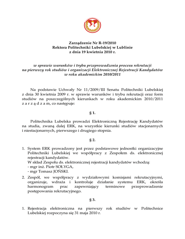 Zarządzenie Nr R-19/2010 Rektora Politechniki Lubelskiej w Lublinie z dnia 19 kwietnia 2010 r. w sprawie warunków i trybu przeprowadzenia procesu rekrutacji na pierwszy rok studiów i organizacji Elektronicznej Rejestracji Kandydatów w roku akademickim 2010/2011 Na podstawie Uchwały Nr 11/2009/III Senatu Politechniki Lubelskiej z dnia 30 kwietnia 2009 r. w sprawie warunków i trybu rekrutacji oraz form studiów na poszczególnych kierunkach w roku akademickim 2010/2011 z a r z ą d z a m, co następuje: § 1. Politechnika Lubelska prowadzi Elektroniczną Rejestrację Kandydatów na studia, zwaną dalej ERK, na wszystkie kierunki studiów stacjonarnych i niestacjonarnych, pierwszego i drugiego stopnia. § 2. 1. System ERK prowadzony jest przez podstawowe jednostki organizacyjne Politechniki Lubelskiej we współpracy z Zespołem ds. elektronicznej rejestracji kandydatów. W skład Zespołu ds. elektronicznej rejestracji kandydatów wchodzą: - mgr inż. Piotr SOŁYGA, - mgr Tomasz JOŃSKI. 2. Zespół, we współpracy z wydziałowymi komisjami rekrutacyjnymi, organizuje, wdraża i kontroluje działanie systemu ERK, określa harmonogram prac zapewniający terminowe przeprowadzenie postępowania rekrutacyjnego. § 3. 1. Rejestracja elektroniczna na pierwszy rok studiów w Politechnice Lubelskiej rozpoczyna się 31 maja 2010 r. 2. Kandydaci rejestrują się na poszczególne kierunki studiów poprzez stronę systemu ERK z komputera podłączonego do Internetu. System umożliwia wydruk: ankiety osobowej, druku przelewu na opłatę wnoszoną przez osoby ubiegające się o przyjęcie na studia oraz skierowania na badania lekarskie (wykaz kierunków studiów, na których wymagane będą orzeczenia lekarskie zostanie określony odrębnym pismem). 3. Kandydatom, którzy nie mają dostępu do Internetu, komisje wydziałowe umożliwiają dokonanie rejestracji na przygotowanych stanowiskach komputerowych w terminach ustalonych przez wydziałowe komisje rekrutacyjne. § 4. 1. Wydziałowe komisje rekrutacyjne zobowiązane są do weryfikacji danych wprowadzonych przez kandydatów zakwalifikowanych do przyjęcia. 2. Wydziałowe komisje rekrutacyjne są zobowiązane do utrzymania we wszystkich systemach informacyjnych (strony www, tablice informacyjne) aktualnych informacji dotyczących rekrutacji i systemu ERK. 3. Wydziałowe komisje rekrutacyjne prowadzą ERK w funkcjonującym w Uczelni systemie e-HMS Kala Soft. § 5. 1. Podczas ERK kandydat wprowadza niezbędne dane do ankiety osobowej, wymagane informacje niezbędne w procesie kwalifikacji i dokonuje opłaty za postępowanie kwalifikacyjne związane z przyjęciem na studia. Pełną wymaganą dokumentację na pierwszy rok studiów kandydat składa we właściwej wydziałowej komisji rekrutacyjnej dopiero po zakwalifikowaniu go do przyjęcia na studia. 2. Kandydat będzie podlegał procesowi rekrutacji na dany kierunek studiów po wpłynięciu opłaty rekrutacyjnej za ten kierunek na konto Politechniki Lubelskiej. 3. W przypadku, gdy dokonanie przez kandydata opłaty nie zostało odnotowane w systemie ERK, kandydat zobowiązany jest, najpóźniej w dniu zakończenia ERK, dostarczyć do komisji rekrutacyjnej dowód wpłaty. 4. Wprowadzenie przez kandydata niezbędnych informacji (wyniki ze świadectwa dojrzałości, ze świadectwa ukończenia szkoły oraz ocen z dyplomów ukończenia studiów wyższych) i wniesienie opłaty rekrutacyjnej stanowi podstawę do uwzględniania go w dalszym postępowaniu kwalifikacyjnym. 5. Kandydaci, którzy zdają egzamin lub egzaminy wstępne na Uczelni, muszą sprawdzić termin i miejsce egzaminu. Informacje te znajdować się będą na stronie internetowej właściwego wydziału. 6. Kandydat jest zobligowany do kontrolowania swojego konta. Poprzez system ERK będzie informowany o przebiegu procesu rekrutacji. Politechnika Lubelska nie ponosi odpowiedzialności za skutki niezapoznania się kandydata z wiadomościami umieszczanymi na jego osobistym koncie rekrutacyjnym. 7. Politechnika Lubelska nie ponosi odpowiedzialności za niemożność rejestracji lub dokonywania zmian, spowodowaną awariami sieci internetowej niezależnymi od Uczelni. W takich przypadkach kandydat powinien zgłosić się osobiście do komisji rekrutacyjnej. § 6. Po przeprowadzeniu postępowania kwalifikacyjnego komisje rekrutacyjne prezentują jego wyniki w formie z Uczelnianą Komisją Rekrutacyjną. wydziałowe uzgodnionej § 7. 1. Kandydaci zakwalifikowani do przyjęcia na studia, poprzez system ERK, przesyłają plik zawierający elektroniczną wersję fotografii do elektronicznej legitymacji studenckiej. 2. Zdjęcie to powinno być identyczne z fotografiami dostarczonymi do komisji wydziałowej w komplecie dokumentów. § 8. Przyjęcie na studia tych, którzy spełnili kryteria kwalifikacji następuje wtedy, gdy kandydat dostarczy, w terminie wyznaczonym przez komisję rekrutacyjną, wymagane dokumenty określone w warunkach rekrutacji, po uprzedniej weryfikacji wprowadzonych danych i dokona obowiązujących opłat. Niedostarczenie dokumentów w określonym terminie jest równoznaczne z rezygnacją i spowoduje skreślenie z listy osób zakwalifikowanych do przyjęcia na pierwszy rok studiów. § 9. 1. Proces rekrutacji realizowany jest w systemie rekrutacji postępującej, prowadzonej etapami studiów. 2. Osobom zakwalifikowanym do przyjęcia wydziałowa komisja rekrutacyjna, w systemie ERK, określa termin dostarczenia kompletu wymaganych dokumentów na studia, co stanowi potwierdzenie rejestracji kandydata na studia. 3. W przypadku braku potwierdzeń rejestracji, w następnym etapie rekrutacji zamieszczana jest w systemie ERK informacja u kolejnych osób o możliwości przyjęcia na studia. 4. Powstałe wolne miejsca na listach osób zakwalifikowanych do przyjęcia będą uzupełniane z list rezerwowych, zgodnie z liczbą punktów kwalifikacyjnych, po czym osoby nowo zakwalifikowane poprzez system ERK zostaną powiadomione o terminie zło