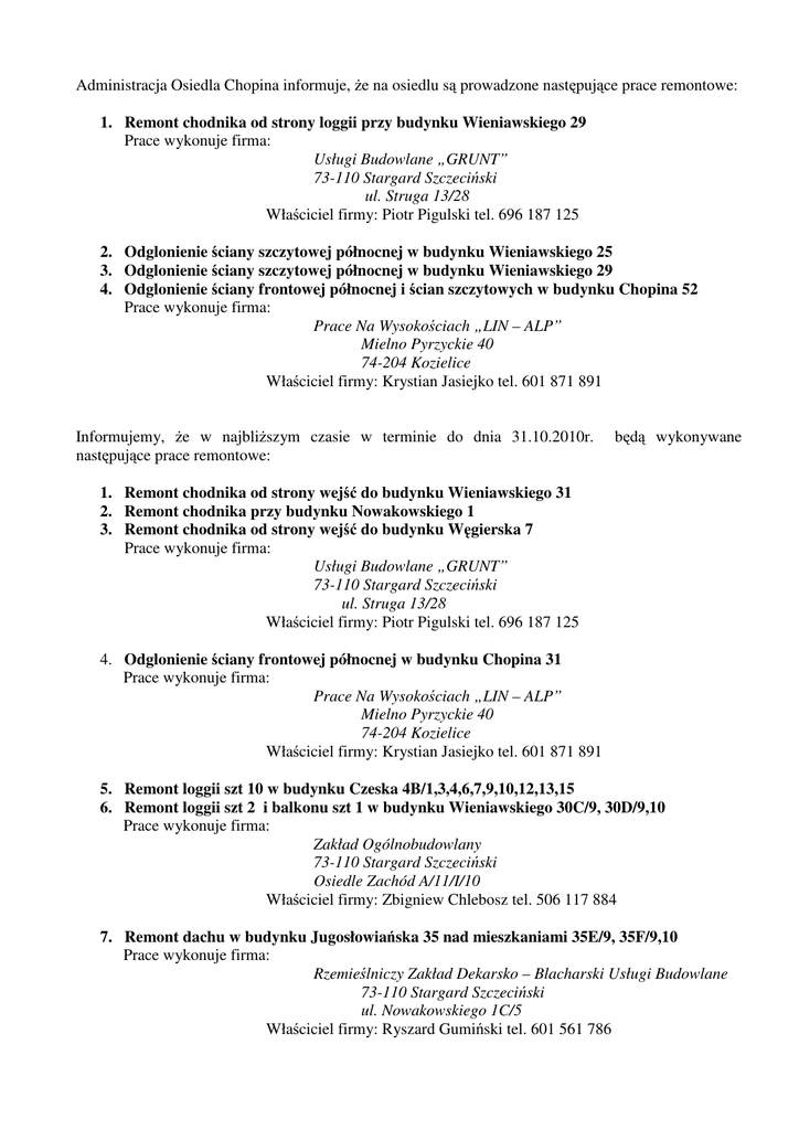 Administracja Osiedla Chopina informuje, że na osiedlu są prowadzone następujące prace remontowe: 1. Remont chodnika od strony loggii przy budynku Wieniawskiego 29 Prace wykonuje firma: Usługi Budowlane „GRUNT” 73-110 Stargard Szczeciński ul. Struga 13/28 Właściciel firmy: Piotr Pigulski tel. 696 187 125 2. Odglonienie ściany szczytowej północnej w budynku Wieniawskiego 25 3. Odglonienie ściany szczytowej północnej w budynku Wieniawskiego 29 4. Odglonienie ściany frontowej północnej i ścian szczytowych w budynku Chopina 52 Prace wykonuje firma: Prace Na Wysokościach „LIN – ALP” Mielno Pyrzyckie 40 74-204 Kozielice Właściciel firmy: Krystian Jasiejko tel. 601 871 891 Informujemy, że w najbliższym czasie w terminie do dnia 31.10.2010r. następujące prace remontowe: będą wykonywane 1. Remont chodnika od strony wejść do budynku Wieniawskiego 31 2. Remont chodnika przy budynku Nowakowskiego 1 3. Remont chodnika od strony wejść do budynku Węgierska 7 Prace wykonuje firma: Usługi Budowlane „GRUNT” 73-110 Stargard Szczeciński ul. Struga 13/28 Właściciel firmy: Piotr Pigulski tel. 696 187 125 4. Odglonienie ściany frontowej północnej w budynku Chopina 31 Prace wykonuje firma: Prace Na Wysokościach „LIN – ALP” Mielno Pyrzyckie 40 74-204 Kozielice Właściciel firmy: Krystian Jasiejko tel. 601 871 891 5. Remont loggii szt 10 w budynku Czeska 4B/1,3,4,6,7,9,10,12,13,15 6. Remont loggii szt 2 i balkonu szt 1 w budynku Wieniawskiego 30C/9, 30D/9,10 Prace wykonuje firma: Zakład Ogólnobudowlany 73-110 Stargard Szczeciński Osiedle Zachód A/11/I/10 Właściciel firmy: Zbigniew Chlebosz tel. 506 117 884 7. Remont dachu w budynku Jugosłowiańska 35 nad mieszkaniami 35E/9, 35F/9,10 Prace wykonuje firma: Rzemieślniczy Zakład Dekarsko – Blacharski Usługi Budowlane 73-110 Stargard Szczeciński ul. Nowakowskiego 1C/5 Właściciel firmy: Ryszard Gumiński tel. 601 561 786 8. Wymiana drzwi wejściowych wewnętrznych do budynki Wieniawskiego 29 9. Wymiana drzwi wejściowych wewnętrznych do budynki Wieniawskiego 23 10. Wymiana drzwi wejściowych wewnętrznych do budynki Węgierska 7 11. Wymiana drzwi wejściowych wewnętrznych do budynki Jugosłowiańska 35AB Prace wykonuje firma: BEM Brudniccy Sp. z o.o. Mirosław 26a/k Płocka 09-472 Słupno Kierownik robót: Krzysztof Szałański tel. 668 839 969 Administracja informuje, że w/w firmy dołożą wszelkich starań, aby prace wykonywane były w sposób nieuciążliwy dla lokatora, natomiast w przypadku wykonywania prac remontowych na balkonach i loggiach prosimy lokatorów o zabranie wszelkich rzeczy i przedmiotów w celu udostępnienia wolnego balkonu i loggii.