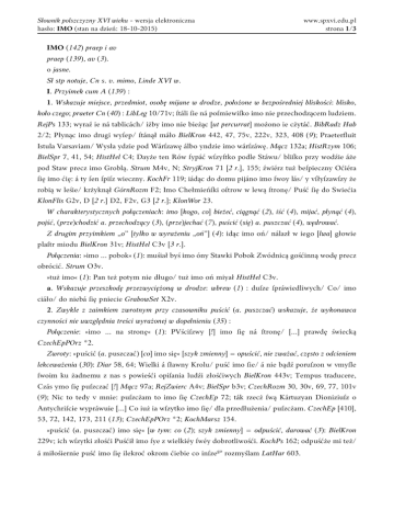 Słownik polszczyzny XVI wieku - wersja elektroniczna hasło: IMO (stan na dzień: 18-10-2015) www.spxvi.edu.pl strona 1/3 IMO (142) praep i av praep (139), av (3). o jasne. Sł stp notuje, Cn s. v. mimo, Linde XVI w. I. Przyimek cum A (139) : 1. Wskazuje miejsce, przedmiot, osobę mijane w drodze, położone w bezpośredniej bliskości: blisko, koło czego; praeter Cn (40) : LibLeg 10/71v; ſtáli ſie ná poſmiewiſko imo nie przechodzącem ludziem. RejPs 133; wyraź ie ná tablicách/ iżby imo nie bieżąc [ut percurrat] możono ie cżytáć. BibRadz Hab 2/2; Płynąc imo drugi wyſep/ ſtánął máło BielKron 442, 47, 75v, 222v, 323, 408 (9); Praeterfluit Istula Varsaviam/ Wysła ydzie pod Wárſzawę álbo yndzie imo wárſzáwę. Mącz 132a; HistRzym 106; BielSpr 7, 41, 54; HistHel C4; Dayże ten Rów ſypáć wſzyſtko podle Stáwu/ bliſko przy wodźie áże pod Staw precz imo Groblą. Strum M4v, N; StryjKron 71 [2 r.], 155; źwiérz tuż beſpieczny Oćiéra ſię imo ćię: á ty ſen ſpiſz wieczny. KochFr 119; iádąc do domu pijáno imo ſwoy lás/ y vſłyſzawſzy że robią w leśie/ krżyknął GórnRozm F2; Imo Chełmieńſki oſtrow w lewą ſtronę/ Puść ſię do Swiećia KlonFlis G2v, D [2 r.] D2, F2v, G3 [2 r.]; KlonWor 23. W charakterystycznych połączeniach: imo [kogo, co] bieżeć, ciągnąć (2), iść (4), mijać, płynąć (4), pojść, (prze)chodzić a. przechodzący (3), (prze)jechać (7), puścić (się) a. puszczać (4), wędrować. Z drugim przyimkiem „o” [tylko w wyrażeniu „oń”] (4): idąc imo oń/ nálazł w iego [lwa] głowie plaſtr miodu BielKron 31v; HistHel C3v [3 r.]. Połączenia: »imo ... pobok« (1): muśiał byś imo óny Stawki Pobok Zwódnicą gośćinną wodę precz obrócić. Strum O3v. »tuż imo« (1): Pan też potym nie długo/ tuż imo oń miyał HistHel C3v. a. Wskazuje przeszkodę przezwyciężoną w drodze: wbrew (1) : duſze ſpráwiedliwych/ Co/ imo ciáło/ do niebá ſię pniecie GrabowSet X2v. 2. Zwykle z zaimkiem zwrotnym przy czasowniku puścić (a. puszczać) wskazuje, że wykonawca czynności nie uwzględnia treści wyrażonej w dopełnieniu (35) : Połączenie: »imo ... na stronę« (1): PVściſzwy [!] imo ſię ná ſtronę/ [...] prawdę świecką CzechEpPOrz *2. Zwroty: »puścić (a. puszczać) [co] imo się« [szyk zmienny] = opuścić, nie zważać, często z odcieniem lekceważenia (30): Diar 58, 64; Wielki á ſławny Krolu/ puść imo ſie/ á nie bądź poruſzon w vmyſle ſwoim ku żadnemu z nas s powieśći opiſania ludźi złośćiwych BielKron 443v; Tempus traducere, Czás ymo ſię puſzczać [!] Mącz 97a; RejZwierc A4v; BielSpr b3v; CzechRozm 30, 30v, 69, 77, 101v (9); Nic to tedy v mnie: puſzcżam to imo ſię CzechEp 72; ták rzecż ſwą Kártuzyan Dioniziuſz o Antychriſcie wypráwuie [...] Co iuż ia wſzytko imo ſię/ dla przedłużenia/ puſzcżam. CzechEp [410], 53, 72, 142, 173, 211 (13); CzechEpPOrz *2; KochMarsz 154. »puścić (a. puszczać) imo się« [w tym: co (2); szyk zmienny] = odpuścić, darować (3): BielKron 229v; ich wſzytki złośći Puśćił imo ſye z wielkiéy ſwéy dobrotliwośći. KochPs 162; odpuśćże mi też/ á miłośiernie puść imo ſię ilekroć okrom ćiebie co inſzego rozmyślam LatHar 603. Słownik polszczyzny XVI wieku - wersja elektroniczna hasło: IMO (stan na dzień: 18-10-2015) www.spxvi.edu.pl strona 2/3 peryfr. »puszczać [kogo] imo uszy« = nie słuchać, lekceważyć (1): Kto go [Boga] puſzcża imo vſzy/ Iuż temu káżdy zle tuſzy BielKom F3. 3. Wskazuje osobę lub fakt, który należało uwzględnić (40) : a. Wskazuje osobę, która powinna być uwzględniona, ale została pominięta lub zagrożona pominięciem: na niekorzyść, wbrew (17) : Almus (iáko cnotliwy brát) nie chćiał wźiąć korony imo ſtárſzego brátá. BielKron 301v, 15, 100v, 105v, 170, 204 (12); StryjKron 385, 427; żeby temu przyſzło [...] Chriſtiáńſtwá ſię wyrzeć [!] ktoryby ſię imo Chriſtuſá chćiał práwy Moiżeſzowſkimi rządźić CzechEp 33; SarnStat 1051. Powtórzenie przyimków: imo oń (1): co zá niegodność do niego bacżyli/ iż imo oń práwego krolewicá dáli bráńcowi kroleſtwo BielKron 103v. b. Wskazuje osobę, do której powinna się wyłącznie ograniczać treść zdania: poza, oprócz (4) : abi [...] nyedvpvſczyl [!] abi ktho ynſchi. wthem wladzam abo roſkazowanye yakye myecz myal ymo yey mcz. LibLeg 11/187v, 11/188; ná tym ſrodze żydowie błądzą/ gdy przedſię imo Iezuſá Páná inſzego Meſyaſzá cżekáią. CzechRozm 169v, 252. c. Wskazuje fakt, który powinien być uwzględniony, ale został pominięty lub zagrożony pominięciem: wbrew, niezgodnie z czym (11) : Ksiądz o poczciwość moję sądzi mię imo prawo moje prawem cudzem Diar 34, 36, 87, 88; S tey theż przycżyny był podwiod Ceſarz Moſkiewſkiego Kſiędzá przećiw krolowi/ iż imo przymierze Smoleńſk wzyął. BielKron 416; Imo prawdę kłam powiádaſz KochPs 78; KochFrag 51; A ktoby imo tę vchwałę [contra eiusmodi statutum; mimo tę uchwałę Jan Stat 600] chodźił z nią [rusznicą] w mieśćie/ vrząd Stárośći ma ią wźiąć SarnStat 500, 738. Wyrażenie przyimkówe: »imo to wszy(s)tko« (2): iednák oni ná to nic dbáć niechćieli: ále przedſię imo to wſzyſtko wiárę ſwą zálecáli CzechRozm 67v; KochPs 116. d. Wskazuje fakt, od którego powinna być wyłącznie uzależniona treść zdania: bez (8) : A wthem abi nygd wladzey y roſkazanya nyemyal ymo Volyam Krolyowey yey mczi. LibLeg 11/187v; a co za szkodliwa sequella, aby Krol imo wiadomość szlachty miał, co chciał, na nie stawić. Diar 61, 40, 88; BielKron 301; Cżwarty ſpoſob mężoboyſtwá ieſt przygodny/ ktory ſię z iákiey nagłey przygody á ſkwápliwie przytrefia/ imo wolą y myśl [praeter voluntatem omnem et cogitationem] tego kto ſię tego dopuſzcża. ModrzBaz 78v; O Woynie/ álbo Ruſzeniu poſpolitym/ nic záczynáć nie m