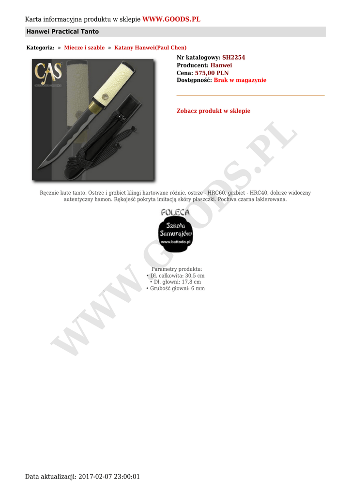 Karta informacyjna produktu w sklepie WWW.GOODS.PL Hanwei Practical Tanto Kategoria: » Miecze i szable » Katany Hanwei(Paul Chen) Nr katalogowy: SH2254 Producent: Hanwei Cena: 575,00 PLN Dostępność: Brak w magazynie S. PL Zobacz produkt w sklepie W .G O O D Ręcznie kute tanto. Ostrze i grzbiet klingi hartowane różnie, ostrze - HRC60, grzbiet - HRC40, dobrze widoczny autentyczny hamon. Rękojeść pokryta imitacją skóry płaszczki. Pochwa czarna lakierowana. W W Parametry produktu: • Dł. całkowita: 30,5 cm • Dł. głowni: 17,8 cm • Grubość głowni: 6 mm Data aktualizacji: 2017-02-07 23:00:01