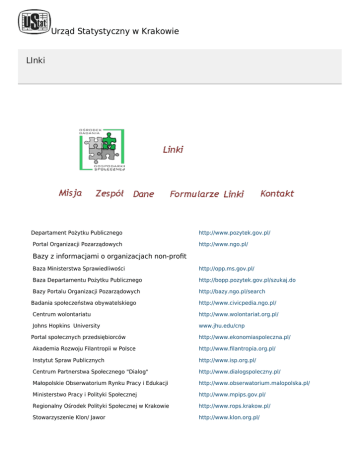 Urząd Statystyczny w Krakowie LInki Departament Pożytku Publicznego http://www.pozytek.gov.pl/ Portal Organizacji Pozarządowych http://www.ngo.pl/ Bazy z informacjami o organizacjach non-profit Baza Ministerstwa Sprawiedliwości http://opp.ms.gov.pl/ Baza Departamentu Pożytku Publicznego http://bopp.pozytek.gov.pl/szukaj.do Bazy Portalu Organizacji Pozarządowych http://bazy.ngo.pl/search Badania społeczeństwa obywatelskiego http://www.civicpedia.ngo.pl/ Centrum wolontariatu http://www.wolontariat.org.pl/ Johns Hopkins University www.jhu.edu/cnp Portal społecznych przedsiębiorców http://www.ekonomiaspoleczna.pl/ Akademia Rozwoju Filantropii w Polsce http://www.filantropia.org.pl/ Instytut Spraw Publicznych http://www.isp.org.pl/ Centrum Partnerstwa Społecznego "Dialog" http://www.dialogspoleczny.pl/ Małopolskie Obserwatorium Rynku Pracy i Edukacji http://www.obserwatorium.malopolska.pl/ Ministerstwo Pracy i Polityki Społecznej http://www.mpips.gov.pl/ Regionalny Ośrodek Polityki Społecznej w Krakowie http://www.rops.krakow.pl/ Stowarzyszenie Klon/ Jawor http://www.klon.org.pl/ Urząd Statystyczny w Krakowie Ośrodek Badania Gospodarki Społecznej 31-223 Kraków, ul. K. Wyki 3 tel. 12 36 10 113; 12 36 10 146, fax. 12 36 10 192 e-mail: mailto:[email protected]