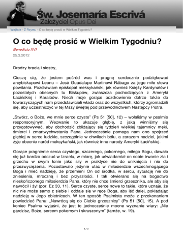 Wejście - Z Rzymu - O co będę prosić w Wielkim Tygodniu? O co będę prosić w Wielkim Tygodniu? Benedicto XVI 25.3.2012 Drodzy bracia i siostry, Cieszę się, że jestem pośród was i pragnę serdecznie podziękować arcybiskupowi Leonu – José Guadalupe Martinowi Rábago za jego miłe słowa powitania. Pozdrawiam episkopat meksykański, jak również Księży Kardynałów i pozostałych obecnych tu Biskupów, zwłaszcza pochodzących z Ameryki Łacińskiej i Karaibów. Niech moje gorące pozdrowienie dotrze także do towarzyszących nam przedstawicieli władz oraz do wszystkich, którzy zgromadzili się, aby uczestniczyć w tej Mszy świętej pod przewodnictwem Następcy Piotra. „Stwórz, o Boże, we mnie serce czyste” (Ps 51 [50], 12) – wołaliśmy w psalmie responsoryjnym. Wezwanie to ukazuje głębię, z jaką winniśmy się przygotowywać, aby obchodzić zbliżający się tydzień wielkiej tajemnicy męki, śmierci i zmartwychwstania Pana. Jednocześnie pomaga nam ono spojrzeć głębiej w serce ludzkie, szczególnie w chwilach bólu, a zarazem nadziei, jakimi żyje obecnie naród meksykański, jak również inne narody Ameryki Łacińskiej. Gorące pragnienie serca czystego, szczerego, pokornego, miłego Bogu, dawało się już bardzo odczuć w Izraelu, w miarę, jak uświadamiał on sobie trwanie zła i grzechu w swym łonie jako siły w praktyce nie do uniknięcia i nie do przezwyciężenia. Pozostawało jedynie ufać w miłosierdzie wszechmogącego Boga i mieć nadzieję, że przemieni On od środka, w sercu, sytuację nie do zniesienia, mroczną i bez przyszłości. I tak otwierano się na bogactwo nieskończonego miłosierdzia Pana, który nie chce śmierci grzesznika, ale aby się nawrócił i żył (por. Ez 33, 11). Serce czyste, serce nowe to takie, które uznaje, że nic nie może samo z siebie i oddaje się w ręce Boga, aby iść dalej, pokładając nadzieję w Jego obietnicach. W ten sposób Psalmista może z przekonaniem powiedzieć Panu: „Nawrócą się do Ciebie grzesznicy” (Ps 51 [50], 15). A pod koniec Psalmu wyjaśni, że jest to jednocześnie mocne wyznanie wiary: „Nie gardzisz, Boże, sercem pokornym i skruszonym” (tamże, w. 19). 1/4 Dzieje Izraela mówią też o wielkich czynach i walkach, ale w godzinie zmierzenia się z życiem bardziej prawdziwym, ze swym ostatecznym przeznaczeniem, zbawienie, bardziej niż na własnych siłach, spoczywa na ufności w Bogu, który może ponownie stworzyć nowe serce, zamiast nieczułego i pyszniącego się. Może to przypominać dzisiaj nam i naszym narodom, że gdy chodzi o życie osobiste i wspólnotowe w najgłębszym jego wymiarze, nie wystarczą strategie ludzkie, aby nas zbawić. Należy również uciec się do tego jedynego, który może dać pełnię życia, gdyż On sam jest istotą życia i jego twórcą i uczynił nas jego uczestnikami przez swego Syna Jezusa Chrystusa. Ewangelia dzisiejsza w dalszej części pozwala nam zauważyć, jak to starożytne pragnienie pełnego życia wypełniło się naprawdę w Chrystusie. Wyjaśnia to św. Jan w urywku, w którym krzyżują się pragnienie Greków ujrzenia Jezusa i chwila, w której Pan ma być uwielbiony. Na pytanie Greków, reprezentujących świat pogański, Jezus odpowiada słowami: „Nadeszła godzina, aby został otoczony chwałą Syn Człowieczy” (J 12, 23). Dziwna to odpowiedź, która wydaje się być niespójna z pytaniem Greków. Co ma wspólnego uwielbienie Jezusa z prośbą o spotkanie się z Nim? Ale przecież istnieje pewien związek. Ktoś mógłby pomyśleć – zauważa św. Augustyn – że Jezus poczuł się otoczony chwałą, gdyż przyszli do Niego poganie. Coś podobnego do aplauzu tłumu, który „chwali” wielkich tego świata, jak byśmy dzisiaj powiedzieli. Ale to nie tak. „Należało, aby wywyższenie uwielbienia poprzedziło uniżenie męki” (Kom. do Ewangelii św. Jana, 51, 9; PL 35, 1766). Odpowiedź Jezusa, zapowiadająca Jego nieuchronną mękę, oznacza, że przypadkowe spotkanie w tamtym czasie byłoby zbyteczne i może nawet szkodliwe. Zamiast tego, co Grecy chcą w rzeczywistości zobaczyć, ujrzą Go wyniesionego na krzyżu, z którego przyciągnie wszystkich do siebie (por. J 12, 32). Tam rozpocznie się Jego „chwała” dzięki Jego ofierze odkupienia za wszystkich, niczym ziarno pszenicy wrzucone w ziemię, które – obumierając – kiełkuje i przynosi owoc obfity. Spotkają Tego, którego – z pewnością nie wiedząc o tym – poszukiwali w czasie swej wędrówki w swych sercach, prawdziwego Boga, który daje się rozpoznać wszystkim ludom. Jest to także sposób, w jaki Matka Boża z Guadalupe ukazała swego boskiego Syna św. Janowi Diego. Nie jako niezwykłego bohatera z legendy, ale jako najprawdziwszego Boga, dla którego się żyje, Stwórcę osób, bliskości i bezpośredniości, Nieba i Ziemi (por. Nican Mopohua, w. 33). Uczyniła w owej chwili to, czego już doświadczyła w czasie godów w Kanie. Wobec braku wina wskazała jasno służącym, że mają iść za Jej Synem: „Zróbcie wszystko, cokolwiek wam powie” (J 2, 5). 2/4 Drodzy bracia, przybywając tutaj, mogłem zbliżyć się do pomnika Chrystusa Króla na szczycie Cubilete. Mój czcigodny poprzednik, błogosławiony papież Jan Paweł II, chociaż gorąco tego pragnął, nie mógł odwiedzić tego symbolicznego miejsca wiary ludu meksykańskiego w czasie swych wizyt na tej umiłowanej ziemi. Z pewnością ucieszy się dzisiaj z nieba, że Pan obdarzył mnie tą łaską, iż mogę obecnie przebywać z wami, a także pobłogosławi milionom Meksykanów, którzy zechcieli ostatnio uczcić jego relikwie we wszystkich zakątkach kraju. A zatem ten pomnik przedstawia Chrystusa Króla. Ale korony, które nosi – jedna jako władca, druga cierniowa – wskazują, że Jego królewskość nie jest taka, jak to wielu rozumiało i rozumie. Jego panowanie nie polega na sile Jego wojsk, aby ujarzmić innych siłą lub przemocą, 