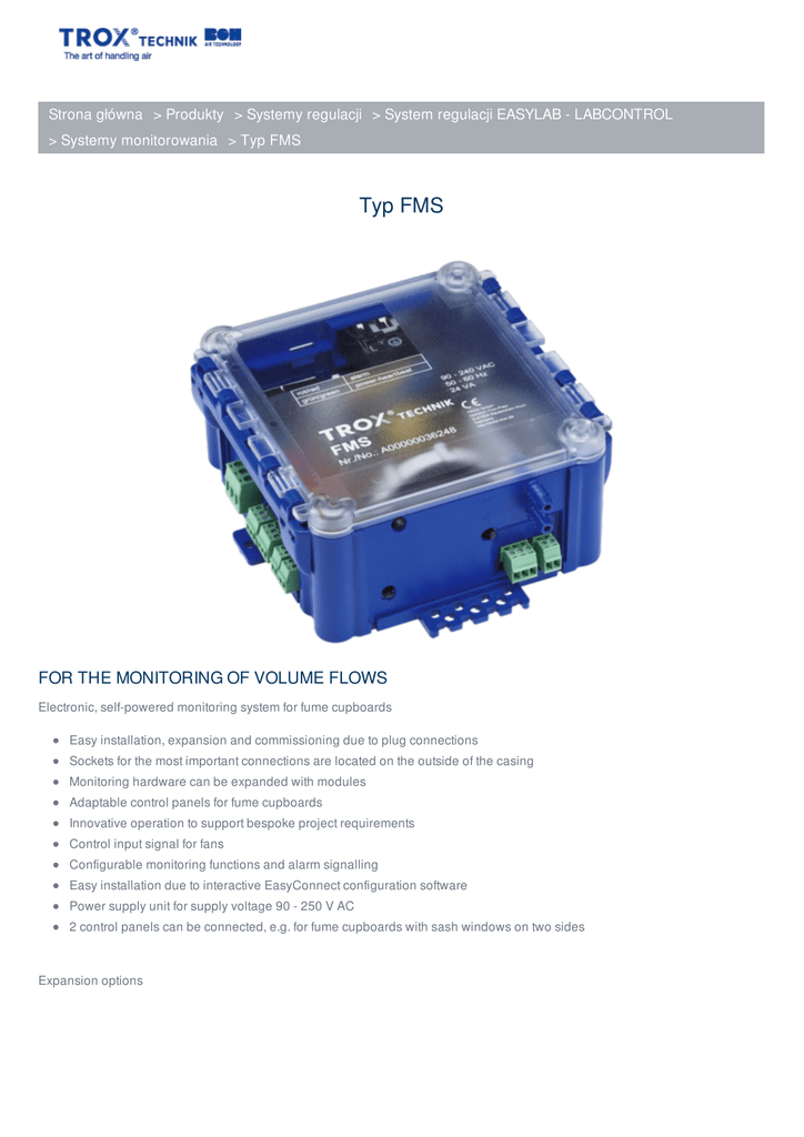 Strona główna > Produkty > Systemy regulacji > System regulacji EASYLAB - LABCONTROL > Systemy monitorowania > Typ FMS Typ FMS FOR THE MONITORING OF VOLUME FLOWS Electronic, self-powered monitoring system for fume cupboards Easy installation, expansion and commissioning due to plug connections Sockets for the most important connections are located on the outside of the casing Monitoring hardware can be expanded with modules Adaptable control panels for fume cupboards Innovative operation to support bespoke project requirements Control input signal for fans Configurable monitoring functions and alarm signalling Easy installation due to interactive EasyConnect configuration software Power supply unit for supply voltage 90 - 250 V AC 2 control panels can be connected, e.g. for fume cupboards with sash windows on two sides Expansion options Expansion modules, to be mounted into or onto the base casing Easy installation and electric connection of the monitoring system Expansion modules can be factory mounted or fitted at a later stage Optional monitoring of supportive flow in fume cupboards APPLICATION Application Monitoring system type FMS for the electronic, self-powered monitoring of volume flow rate or face velocity in fume cupboards, fume hoods and similar components. Easy and safe to use, providing maximum energy efficiency and data transparency For use within enclosed rooms Simple solution for fume cupboards with a constant volume flow rate Equipment functions Differential pressure monitoring Volume flow rate monitoring Face velocity monitoring Monitoring of supportive flow fans, and of volume flow or differential pressure signals from external units or devices Optical and acoustic alarms as well as alarm signalling to higher-level systems (central BMS) with BE-SEG-02 or BE-SEG-03 Complete configuration, commissioning and diagnosis with interactive software for personal computers; the computer can be connected either directly to the unit or to the room control panel For use in laboratories, clean rooms in the pharmaceutical and semiconductor industries, operating theatres, intensive care units and offices For new installations, retrofit and refurbishment projects Monitoring of the sash window opening to EN 14175 Special characteristics Extremely fast actual value measurement Monitoring of the differential pressure or volume flow rate; face velocity monitoring as an option (only with the optional face velocity transducer VS-TRD) Monitoring and signalling of the maximum sash opening according to EN 14175; acoustic signalling can be switched off or the duration can be limited Connection of one or two adaptable EASYLAB control panels Type BE-SEG-03 or BE-SEG-02; suitable also for fume cupboards with sash windows on two sides Operating mode default setting by an external unit or device using digital inputs Monitoring functions: Monitoring value 1, monitoring value 2, deactivate monitoring function Alarms and alarm signalling are configurable, e.g. suppressing alarms for certain operating modes DESCRIPTION Variants FMS-1: Monitoring system with integral diaphragm pressure transducer and measuring probe FMS-2: Monitoring system for external signals of 0 (2) to 10 V DC, e.g. from a face velocity transducer, volume flow controller or external differential pressure transducer Parts and characteristics Power supply unit for supply voltage 90 - 240 V AC 2 control panels can be connected, e.g. for fume cupboards with sash windows on two sides Interactive EasyConnect software for configuration, commissioning and diagnosis of the monitoring system Bluetooth module (BlueCON) that can be connected to the monitoring system, for wireless connection to the configuration computer Attachments Expansion modules are factory mounted or can be fitted at a later stage S: EM-LIGHT-F – The monitoring system allows for switching a light on/off using the control panel. This expansion module is a wired socket for the connection of lighting. Maximum switch rating: 230 V AC 500 W. G: EM-CPL – Mating connector for the EM-LIGHT module. If EM-LIGHT is installed, a mating connector can be supplied to allow for plugging in the lighting. V: EM-VENT – Combined insulation piece and wire clamping bracket for digital output DO1, fan activation. The monitoring system can be used to activate or deactivate a fan. In case of 230 V AC power supply, this combined insulation piece and wire clamping bracket is provided. D: EM-DDT – Differential pressure transducer for monitoring a supportive flow. This expansion module may be used as an additional differential pressure transducer to monitor a supportive flow fan. Optional transducers for FMS-2 VS-TRD: Face velocity transducer PT699: Differential pressure transducer, –100 to 100 Pa Construction features Electronic monitoring system with optional factory mounted expansion modules Control electronics using a microprocessor, with configuration settings stored in EEPROM memory and hence safe in case of a power failure Permanent function monitoring of the system and the connected sensors Sockets for the most important connections are located on the outside of the casing Connections for expansion modules Differential pressure transducer with room air induction to protect the measurement point Materials and surfaces Casing in ABS plastic; RAL 5002 INFORMACJE TECHNICZNE FUNCTION Functional description For fume cupboard monitoring, the electronic EASYLAB monitoring system FMS is typically installed on the roof or on the side of the fume cupboard. The supplied control panel is typically mounted on the fume cupboard side frame. Principal functions: Fume cupboard monitoring by internal or external differential pressure measurement, including optical or acoustic signalling, to EN 14175 The monitoring system meets the requirements of EN 14175 and is hence suitable for all fume cupboards tested to EN 14175 Monitoring strategies: FMS-1 Equipment function – differential pressure, internal m