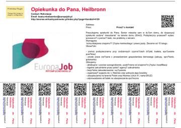 Opiekunka do Pana, Heilbronn Contact: Rekrutacja Email: [email protected] http://anonse.wirtualnyostrowiec.pl/index.php?page=item&id=4129 Address: Price: Prosz? o kontakt Poszukujemy opiekunki do Pana. Senior mieszka sam w du?ym domu, do dyspozycji opiekunki osobne” mieszkanie” na terenie domu (50m2). Podopieczny przeszed? wylew, porusza si? z pomoc? laski, ma problemy z sercem. Wymagana komunikatywna znajomo?? j?zyka niemieckiego i prawo jazdy. Zlecenie od 15 lutego. Obowi?zki: - pomoc podopiecznemu przy codziennych czynno?ciach (k?piel, toaleta, spo?ywanie posi?ków) - proste prace zwi?zane z prowadzeniem gospodarstwa domowego (zakupy, sprz?tanie, gotowanie) Oferujemy: - atrakcyjne i uczciwe wynagrodzenie, uzale?nione od znajomo?ci j?zyka i kwalifikacji - legalne zatrudnienie przez polsk? agencj? zatrudnienia - bezp?atne zakwaterowanie i wy?ywienie - organizacj? wyjazdu do i z Niemiec oraz pokrycie jego kosztów - ubezpieczenie na terenie Polski oraz Niemiec (druk A1, karta EKUZ) - odprowadzenie sk?adek na ubezpieczenie spo?eczne Opiekunka Heilbronn do do Pana, Pana, Pana, Rekrutacja [email protected] http://tinyurl.com/jtrs6nj Opiekunka Heilbronn do Pana, Rekrutacja [email protected] http://tinyurl.com/jtrs6nj Opiekunka Heilbronn do Pana, Rekrutacja [email protected] http://tinyurl.com/jtrs6nj Opiekunka Heilbronn do Pana, Rekrutacja [email protected] http://tinyurl.com/jtrs6nj Opiekunka Heilbronn do Pana, Rekrutacja [email protected] http://tinyurl.com/jtrs6nj Opiekunka Heilbronn do Pana, Rekrutacja [email protected] http://tinyurl.com/jtrs6nj Opiekunka Heilbronn do Pana, Rekrutacja [email protected] http://tinyurl.com/jtrs6nj Opiekunka Heilbronn do Pana, Rekrutacja [email protected] http://tinyurl.com/jtrs6nj Opiekunka Heilbronn do Rekrutacja [email protected] http://tinyurl.com/jtrs6nj Opiekunka Heilbronn Rekrutacja [email protected] http://tinyurl.com/jtrs6nj Powered by TCPDF (www.tcpdf.org)