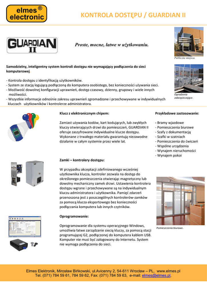 KONTROLA DOSTĘPU / GUARDIAN II Proste, mocne, łatwe w uŜytkowaniu. Publiczne miejsca. Samodzielny, inteligentny system kontroli dostępu nie wymagający podłączenia do sieci komputerowej. - Kontrola dostępu z identyfikacją użytkowników. - System ze stacją logującą podłączoną do komputera osobistego, bez konieczności używania sieci. - Możliwość dowolnej konfiguracji uprawnień, dostęp czasowy, dzienny, grupowy i wiele innych możliwości. - Wszystkie informacje odnośnie zakresu uprawnień zgromadzone i przechowywane w indywidualnych kluczach użytkowników i kontrolerze administratora. Ogrodzenia zabezpieczające. Klucz z elektronicznym chipem: Przykładowe zastosowanie: Zamiast używania kodów, kart kodujących, lub zwykłych kluczy otwierających drzwi do pomieszczeń, GUARDIAN II oferuje zaszyfrowane indywidualne klucze dostępu. Wykonane z trwałego materiału gwarantują niezawodne działanie w całym systemie przez wiele lat. - Bramy wjazdowe - Pomieszczenia biurowe - Szafy z dokumentacją - Szafki w szatniach - Pomieszczenia do ćwiczeń - Wspólne urządzenia - Wynajem nieruchomości - Wynajem pokoi Zamki – kontrolery dostępu: W przypadku akceptacji zdefiniowanego wcześniej użytkownika klucza, kontroler zezwala na dostęp do określonego pomieszczenia otwierając magnetyczny lub dowolny mechaniczny zamek drzwi. Ustawienia kontrolera dostępu wgrane i przechowywane są na indywidualnym kluczu administratora i użytkownika. Pamięć zdarzeń przenoszona jest z poszczególnych kontrolerów-zamków za pomocą klucza eksportowego bez konieczności podłączania komputera lub innych czytników. Oprogramowanie: Oprogramowanie dla systemu operacyjnego Windows, umożliwia łatwe zarządzanie siecią kluczy, za pomocą stacji programującej G2, podłączonej do komputera kablem USB. Komputer nie musi być zalogowany do Internetu. System nie wymaga podłączenia do sieci. Pomieszczenia biurowe. Elmes Elektronik, Mirosław Bińkowski, ul.Avicenny 2, 54-611 Wrocław – PL, www.elmes.pl Tel. (071) 784 59 61, 784 59 62, Fax: (071) 784 59 63, e-mail: [email protected], GUARDIAN II – proste, mocne , łatwe w uŜytkowaniu. Prosta instalacja: Sprawdza się w miejscach trudno dostępnych, oddalonych, tam gdzie nie zawsze kontrola za pomocą sieci komputerowej zdaje egzamin. Lepsza kontrola: Trwałe wszechstronne narzędzia dla administratorów, umożliwiają sprawny dostęp do wszystkich punktów w systemie kontroli dostępu. Wysoka jakość za rozsądną cenę: Atrakcyjna cena za wysoką jakość. Konkurencyjna alternatyw dla innych urządzeń tego typu dostępnych na rynku. Szybki dostęp, użytkownik w łatwy sposób uzyskuje zezwolenie na wejście do określonego miejsca ,bez koniczności uprzedniego wgrywania klucza do kontrolera. Łatwość w zarządzaniu: Nie-sieciowy system kontroli dostępu w łatwy sposób umożliwia dodawanie dodatkowych użytkowników, lub zmianę stanowiska administracyjnego. Lepsza ochrona: Alternatywa dla tradycyjnego systemu kontroli dostępu. Innowacyjne rozwiązanie bazujące na kodowany systemie. Jeszcze lepsza kontrola dostępu: Administrator posiada czytelny wgląd w historię zdarzeń poszczególnych kontrolerów. Klucz eksportowy w łatwy sposób umożliwia przenoszenie danych z kontrolerów do komputera. Modele kontrolerów: G-50 Łatwy do zastosowania w przypadku już istniejących drzwi, bram. (wymiary zewnętrzne 25,4mm x 25,4mm ) G-150 Przeznaczony do montażu na ościeżnicę drzwi o wymiarach 50,8 mm (44,5mm x 133,35mm rozmiar zewnętrzny od frontu ) G-250 – do instalacji w pojedynczej puszce elektrycznej (69,85mm x 114,3mm rozmiar zewnętrzny od frontu ) G-450 - przeznaczony do ciężkich bram, szlabanów, drzwi pracujących w trudnych warunkach (79,375mm x 123,825mm x 57,15mm) Zestaw startowy zawiera: Narzędzia administratora ( dla jednego systemu, komputera): - oprogramowanie i stacja dokująca G2 dla kluczy. - klucz typu admin i eksport - 5 programowalnych kluczy użytkownika Kontroler ( bez elektrozaczepu) z jednym kluczem użytkownika. Zgubiony klucz może być w łatwy sposób usunięty z systemu kontroli za pomocą oprogramowania dla administratora. Poniesiony koszt, to wartość nowego klucza. Specyfikacja: Zalecane napiecie zasilanie 9-12VAC* lub DC(0,3A) ---------------------------------------------------------------Temperatura pracy – 40 ºC do + 85 ºC ------------------------------------------------------------------------ Obciążalność styków przekaźnika 2A/30VDC ---------------------------------------------------------------Buzzer ( poziom hałasu 80 dBA ) ---------------------------------------------------------------Rzeczywisty trwałości baterii zegara - zmienna zależna od baterii i warunków działania. ---------------------------------------------------------------Pamięć zdarzeń 1500 ---------------------------------------------------------------Elektrozaczep sprzedawany osobno. *12VAC – maksymalne napięcie zasilania. ---------------------------------------------------------------- Elmes Elektronik, Mirosław Bińkowski, ul.Avicenny 2, 54-611 Wrocław – PL, www.elmes.pl Tel. (071) 784 59 61, 784 59 62, Fax: (071) 784 59 63, e-mail: [email protected],