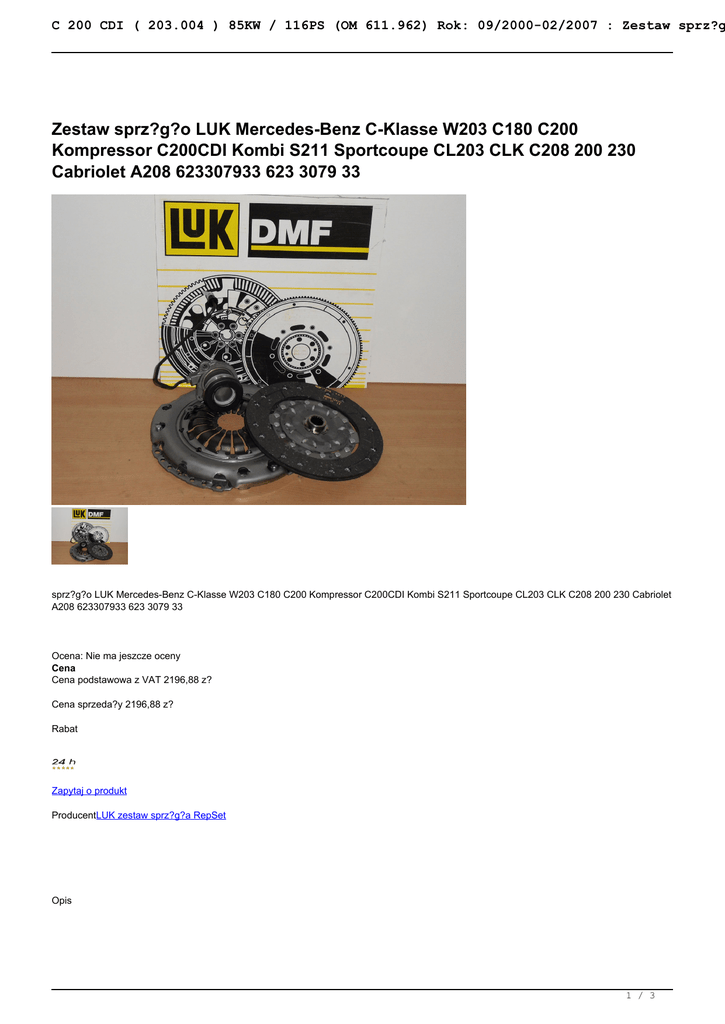 C 200 CDI ( 203.004 ) 85KW / 116PS (OM 611.962) Rok: 09/2000-02/2007 : Zestaw sprz?g Zestaw sprz?g?o LUK Mercedes-Benz C-Klasse W203 C180 C200 Kompressor C200CDI Kombi S211 Sportcoupe CL203 CLK C208 200 230 Cabriolet A208 623307933 623 3079 33 sprz?g?o LUK Mercedes-Benz C-Klasse W203 C180 C200 Kompressor C200CDI Kombi S211 Sportcoupe CL203 CLK C208 200 230 Cabriolet A208 623307933 623 3079 33 Ocena: Nie ma jeszcze oceny Cena Cena podstawowa z VAT 2196,88 z? Cena sprzeda?y 2196,88 z? Rabat Zapytaj o produkt ProducentLUK zestaw sprz?g?a RepSet Opis 1 / 3 C 200 CDI ( 203.004 ) 85KW / 116PS (OM 611.962) Rok: 09/2000-02/2007 : Zestaw sprz?g LUK Kupplung clutch kit Mercedes-Benz C-Klasse W203 C180 C200 Kompressor C200CDI Kombi S211 Sportcoupe CL203 CLK C208 200 230 Cabriolet A208 623 3079 33 !!! Schaltgetriebe sequentiell !!! passend für nachfolgende Modelle / Motoren Mercedes-Benz C-Klasse (W203, S203, CL203) C 180 95KW / 129PS Mercedes-Benz C-Klasse (W203, S203, CL203) C 200 Kompressor 120KW / 163PS Mercedes-Benz C-Klasse (W203, S203) C 200 CDI 85KW / 116PS Mercedes-Benz C-Klasse (W203, S203, CL203) C 200 CDI 90KW / 122PS (bis Fgst.Nr.: A 634008 oder: bis Fgst.Nr.: F 539249 oder: bis Fgst.Nr.: R 139447) Mercedes-Benz CLK (C208, A208) 200 Kompressor 120KW / 163PS Mercedes-Benz CLK (C208, A208) 230 Kompressor 145KW / 197PS Gewicht/weight: - Durchmesser: 240 mm mit Zentralausrücker mit automatischer Nachstellung Spezialwerkzeug zur Montage notwendig für Motoren mit Zweimassenschwungrad Zweimassenschwungrad prüfen und ggf. erneuern orig. Teilenummer: 2 / 3 C 200 CDI ( 203.004 ) 85KW / 116PS (OM 611.962) Rok: 09/2000-02/2007 : Zestaw sprz?g - 3 / 3 Powered by TCPDF (www.tcpdf.org)