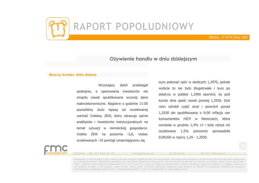RAPORT POPOŁUDNIOWY ŚRODA, 17 STYCZNIA 2007 Ożywienie handlu w dniu dzisiejszym Mocny koniec dnia dolara Wczorajszy spokojnie, a opanowania dzień przebiegał inwestorów nie zmąciły nawet opublikowane wczoraj dane makroekonomiczne. Najpierw o godzinie 11:00 poznaliśmy dużo lepszą od oczekiwanej wartość Indeksu ZEW, który obrazuje opinie analityków i inwestorów instytucjonalnych na temat sytuacji Indeks ZEW w na niemieckiej poziomie gospodarce. -3,6, wobec oczekiwanych -10 pomógł umacniającemu się management euro pokonać opór w okolicach 1,2970, jednak wybicie to nie było długotrwałe i kurs po dotarciu w pobliże 1,2990 zawrócił, by pod koniec dnia spaść nawet poniżej 1,2930. Dziś rano odrobił część strat i powrócił ponad 1,2930 ale opublikowana o 8:00 inflacja cen konsumentów HICP w Niemczech, która wyniosła w grudniu 1,4% r/r i była niższa niż oczekiwane 1,5% ponownie sprowadziła EURUSD w rejony 1,29 - 1,2930. 1 Telefon: +48 (22) 860 65 10 [email protected] Ul.Stawki2 00-193 Warszawa Przedstawione, w raporcie, poglądy, oceny i wnioski są wyrazem osobistych poglądów autorów i nie mają charakteru rekomendacji autora lub serwisu www.fmcm.pl do nabycia lub zbycia albo powstrzymania się od dokonania transakcji w odniesieniu do jakichkolwiek walut lub papierów wartościowych. Poglądy te jak i inne treści raportów nie stanowią" lub "doradztwa" w rozumieniu ustawy z dnia 21 sierpnia 1997r. Prawo o publicznym obrocie papierami wartościowymi (Dz. U. Nr 118, poz. 754, z późn. zm.) Wyłączną odpowiedzialność za decyzje inwestycyjne, podjęte lub zaniechane na podstawie raportu lub z wykorzystaniem wniosków w nim zawartych, ponosi inwestor. Autorzy serwisu są również właścicielem majątkowych praw autorskich do raportów. W szczególności zabronione jest kopiowanie, przedrukowywanie, udostępnianie osobom trzecim i rozpowszechnianie raportów w całości lub we fragmentach bez zgody autorów serwisu. Ś RO DA , 17 STYCZN IA 2007 wobec euro osiągnąć poziom 3,01. W tych Sentyment do dolara okolicach utrzymuje się również dziś rano. Po zachowaniu inwestorów w Co nas dzisiaj czeka? dniu wczorajszym i zwiększonym popycie na dolary widać, że rynek nastawiony jest na dalsze spadki EURUSD, tym bardziej, że Dzisiejsza sesja będzie na pewno umocnieniu dolara sprzyja taniejąca ropa, która dużo ciekawsza niż wczorajszy dzień, a wpływ wczoraj kolejny raz potaniała, tym razem o na ok.3%. Ważnym wsparciem dla EURUSD są publikacje. Rano poznaliśmy już wysokość poziomy 1,29 a następnie 1,2870 a opór inflacji HICP w Niemczech a o godzinie 11:00 powinien zadziałać w rejonie 1,2970-1,30. poznamy jej wartość dla całej Strefy Euro. to będą miały zaplanowane na dziś Rynek oczekuje, że ceny konsumentów wzrosły USDPLN atakuje opór Jeśli chodzi o rynek polski, to wczoraj kurs złotego podążał za główną parą w grudniu o 1,9% r/r a wartości niższe będą osłabiać euro. Następnie, walut, i o ile EURPLN pozostawał w miarę stabilny w przedziale 3,86-3,88, o tyle USDPLN poznamy rano testował wsparcie w okolicach 2,98, by gospodarki. popołudniu, dzięki umacniającemu się dolarowi publikacja dane już makro Na 14:30 inflacji PPI z popołudniu, amerykańskiej zaplanowana w grudniu, jest której wysokość rynek szacuje na poziomie 0,5% 2 Telefon: +48 (22) 860 65 10 [email protected] Ul.Stawki2 00-193 Warszawa Ś RO DA , 17 STYCZN IA 2007 m/m. O 15:15 poznamy dynamikę produkcji presji inflacyjnej będą umacniać dolara. Na przemysłowej czym wieczór zaplanowana jest również publikacja oczekiwania rynkowe kształtują się na poziomie tzw. Beżowej Księgi, czyli raportu o stanie 0,1% od gospodarki USA, z której inwestorzy będą danych, próbowali wyczytać jakiego nastawienia mogą w oczekiwanych w skali grudniu, miesiąca. wartości przy Wyższe tych świadczące o dobrej sytuacji w gospodarce i oczekiwać po FED. Krzysztof Gąska Wskaźnik Inflacja HICP r/r Kraj Niemcy Wartość oczekiwana 1,50% Poprzednia wartość 0 11:00 Inflacja HICP r/r Strefa Euro 1,90% 1,90% 14:30 Inflacja PPI m/m USA 0,50% 2,00% 15:15 Produkcja przemysłowa Industrial Production USA 0,10% 0,20% Data 17.01.2007 Śr Godzina publikacji 08:00 17.01.2007 Śr 17.01.2007 Śr 17.01.2007 Śr 3 Telefon: +48 (22) 860 65 10 [email protected] Ul.Stawki2 00-193 Warszawa
