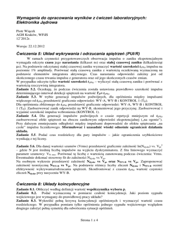 Wymagania do opracowania wyników z ćwiczeń laboratoryjnych: Elektronika Jądrowa Piotr Wiącek AGH Kraków, WFiIS 12’2012r. Wersja: 22.12.2012 Ćwiczenia 5: Układ wykrywania i odrzucania spiętrzeń (PUI/R) W ramach czynności przygotowawczych obserwacja impulsu o zaniku ekspotencjalnym wymagała odczytu czasu jego narastania (kilkaset ns) oraz stałej czasowej zaniku (kilkadziesiąt µs). Na podstawie odczytanej stałej czasowej zaniku wyznaczyć wartość szerokości t(1%) impulsu na poziomie 1% amplitudy. Porównać stałą czasową zaniku z wartością oczekiwaną wyznaczoną na podstawie elementów integratora aktywnego. Czas narastania odpowiedzi zależny jest od skończonego czasu trwania impulsu z generatora oraz od jego skończonych czasów zmian. W przypadku odczytu tylko wartość szerokości t(1%) – wyliczyć stałą czasową zaniku i porównać z wartością rzeczywistą integratora. Zadanie 5.2. Oczekuję, że podczas ćwiczenia została ustawiona prawidłowo szerokość impulsu determinującego interwał detekcji spiętrzeń na wartość TD= t(1%) Zadanie 5.3. W trybie generacji impulsów podwójnych, dla opóźnienia między impulsami większego od t(1%) przedstawić graficznie odpowiedzi: WY-A, WY-B i KONTROL 1 (TD). Dla opóźnienia zbliżonego do t(1%) przedstawić graficznie odpowiedzi: WY-A, WY-B i KONTROL 1 (TD). Zaobserwować zanik odpowiedzi na WY-B, skomentować jego przyczynę. Zaobserwować i wyjaśnić szerokość impulsu wzbronienia (KONTROL 1). Zadanie 5.4. Dla generacji impulsów podwójnych o czasie repetycji mniejszym od t(1%) zaobserwować efekt spiętrzeń na zboczu zanikowym odpowiedzi ekspotencjalnej („na ogonie”). Przy dalszym zmniejszaniu odległości między impulsami doprowadzić do efektu spiętrzania „na czole” impulsu licznikowego. Sformułować i uzasadnić wioski odnośnie ograniczeń działania układu. Zadanie 5.5. Podać czas rozdzielczy dla pary impulsów – jakie ograniczenia szybkościowe wynikają z tej liczny. Zadanie 5.6. Dla danej wartości szumów (Vrms) przedstawić graficznie zależność ln(Ndyskr) vs. Vpr2 – gdzie N jest średnią liczbą impulsów na wyjściu dyskryminatora. Z fitu liniowego wyznaczyć parametr szumowy: VN rms. Porównać tę liczbę z wartością zanotowaną podczas ćwiczenia: Vrms. Ewentualnie dokonać stosowny fit do zależności Ndyskr vs Vpr. Na osobnym wykresie przedstawić zależność Ndyskr vs Vpr oraz NWY-B vs Vpr. Zaproponować zależność teoretyczną NWY-B vs Vpr. Na podstawie różnicy liczby zliczeń Ndyskr i NWY-B ocenić efektywność wykrywania/odrzucania spiętrzeń. Skonfrontować z czasem t(1%) wartość częstości zliczeń Ndyskr przy nasyceniu WY-B. Ćwiczenia 8: Układy koincydencyjne Zadanie 8.1. Obliczyć według definicji wartość współczynnika wyboru ρ. Zadanie 8.2. Podać wyznaczoną w pomiarze czułość koincydencji. Jaki poziom sygnału wejściowego jest wymagany do prawidłowej pracy układu? Zadanie 8.3. Wykreślić pełną krzywą koincydencji opóźnionych i wyznaczyć wartość czasu rozdzielczego. W przypadku pomiaru tylko opóźnienia jednego sygnału wejściowego względem drugiego założyć pełną symetrię dla odwrócenia sytuacji opóźnień. Strona 1 z 4 Zadanie 8.4. Podać odczytany czas martwy układu – jakie ograniczenie układowe wynika z tej liczby? Zadanie 8.5. Przedstawić odpowiedz czasową dla układu koincydencji 2-wejściowej ze wzbronieniem antykoincydencyjnym. Opisać poprawność działania układu. Ćwiczenia 12: Układy odbioru informacji czasowej - dyskryminacja Dyskryminator progowy Efekt wędrowania (time walk effect): Zadanie12.1. W trakcie pomiarów notować czas przesunięcia ∆t odpowiedzi dyskryminatora na wymuszenie impulsem wejściowym o regulowanym czasie narastania i amplitudzie. W opracowaniu wykreślić rodzinę zależności ∆t vs czas narastania|amp=const oraz ∆t vs amplituda|czas_narast.=const. Udowodnić poprawność uzyskanego wyniku. Wyznaczyć dodatkowe opóźnienie ∆T związane ze skończoną czułością ładunkową dyskryminatora jako różnicę między czasem ∆t a teoretycznym czasem odpowiedzialnym za przekroczenie napięciem wejściowym założonego progu dyskryminacji. Wykreślić ∆T vs t n |amp=const, gdzie tn – czas narastania – wyznaczyć parametr AQ proporcjonalny do ładunku warunkującego wzbudzenie procesu regeneracyjnego w dyskryminatorze. Wykreślić ∆T vs 1 |czas_narast.=const, gdzie amp – amp amplituda – wyznaczyć parametr AQ proporcjonalny do ładunku warunkującego wzbudzenie procesu regeneracyjnego w dyskryminatorze. Porównać wyniki na AQ – skomentować spostrzeżenia. Efekt „drżenia” (jitter effect): Zadanie 12.2. Wykreślić zależność σt vs tn |amp=const – z odpowiedniego fitu wyznaczyć σV – porównać z wartością VRMS zanotowaną w trakcie ćwiczenia. Wykreślić zależność σt vs 1 | – z odpowiedniego fitu wyznaczyć σV – porównać z amp czas narast.=const wartością VRMS zanotowaną w trakcie ćwiczenia. Wnioski. Dyskryminator stałofrakcyjny: Efekt wędrowania (time walk effect): Wykreślić czas_przejścia_przez_zero vs tn |amp=const – wyciągnąć wnioski, czy wynik powinien zależeć od tn? Wykreślić czas_przejścia_przez_zero vs amp |czas_narast.=const – wyciągnąć wnioski, czy wynik powinien zależeć od amp? Efekt „drżenia” (jitter effect): Wykreślić zależność σt vs tn |amp=const – z odpowiedniego fitu wyznaczyć σV – porównać z wartością VRMS zanotowaną w trakcie ćwiczenia. UWAGA – przy analizie teoretycznej pomijamy nieznaczną autokorelację sygnałów z dwu torów formujących. Wykreślić zależność σt vs 1 | – z odpowiedniego fitu wyznaczyć σV – porównać z amp czas narast.=const wartością VRMS zanotowaną w trakcie ćwiczenia. Wnioski. Strona 2 z 4 Ćwiczenia 18: Badanie modułu krzemowych detektorów pozycyjnych do detekcji promieniowania X Na podstawie kalibracyjnych