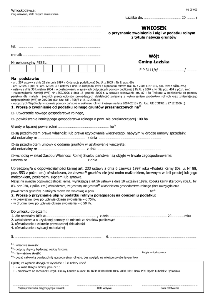 Wnioskodawca: 01 05 003 imię, nazwisko, stałe miejsce zamieszkania Łaziska dn. ……………………………………………… 20 …………………………………………………………………………………………………………………… …………………………………………………………………………………………………………………… …………………………………………………………………………………………………………………… …………………………………………………………………………………………………………………… tel: ………………… e-mail: ………… r WNIOSEK o przyznanie zwolnienia i ulgi w podatku rolnym z tytułu nabycia gruntów ………………………………………………………………………………… Wójt Gminy Łaziska …………………………………………………………………………………………………… Nr ewidencyjny PESEL: F-P 3111/c/ ……………………………… / …………… Na podstawie: - art. 207 ustawy z dnia 29 sierpnia 1997 r. Ordynacja podatkowa( Dz. U. z 2005 r. Nr 8, poz. 60) - art. 12 ust. 1 pkt. 4 i art. 12 ust. 3-8 ustawy z dnia 15 listopada 1984 r. o podatku rolnym (Dz. U. z 2006 r. Nr 136, poz. 969 z późn. zm.) - ustawy z dnia 30 kwietnia 2004 r. o postępowaniu w sprawach dotyczących pomocy publicznej ( Dz.U. z 2007 r. Nr 59, poz. 404 z późn. zm.) - rozporządzenia Komisji (WE) Nr 1857/2006 z dnia 15 grudnia 2006 r. w sprawie stosowania art. 87 i 88 Traktatu w odniesieniu do pomocy państwa dla małych i średnich przedsiębiorstw prowadzących działalność związaną z wytwarzaniem produktów rolnych oraz zmieniającego rozporządzenie (WE) nr 70/2001 (Dz. Urz. UE L 358/3 z 16.12.2006 r.) - wytycznych Wspólnoty w sprawie pomocy państwa w sektorze rolnym i leśnym na lata 2007-2013 ( Dz. Urz. UE C 319/1 z 27.12.2006 r.) 1. Proszę o zwolnienie od podatku rolnego gruntów przeznaczonych na1) □- utworzenie nowego gospodarstwa rolnego, □- powiększenie istniejącego gospodarstwa rolnego o pow. nie przekraczającej 100 ha Grunty o łącznej powierzchni ………………………………………………………………… ha1) □-są przedmiotem prawa własności lub prawa użytkowania wieczystego, nabytym w drodze umowy sprzedaży: akt notarialny nr …………………………………………………………… z dnia ……………………………………………………………………………… □-są przedmiotem umowy o oddanie gruntów w użytkowanie wieczyste: akt notarialny nr …………………………………………………………… z dnia ………………………………………………………………………………… □-wchodzą w skład Zasobu Własności Rolnej Skarbu państwa i są objęte w trwałe zagospodarowanie: umowa nr ………………………………………………………………………… z dnia ……………………………………………………………………………… Uprzedzony/a o odpowiedzialności karnej art. 233 ustawy z dnia 6 czerwca 1997 roku –Kodeks Karny (Dz. u. Nr 88, poz. 553 z późn. zm.) oświadczam, że zbywca 2) gruntów nie jest moim małżonkiem, krewnym w linii prostej lub jego małżonkiem, pasierbem, zięciem lub synową. Mając na uwadze odpowiedzialność karną, wynikającą z art.56 ustawy z dnia 10 września 1999r. Kodeks karny skarbowy (Dz.U. Nr 83, poz.930, z późn. zm.) oświadczam, że jestem/ nie jestem3) właścicielem gospodarstwa rolnego (bez uwzględnienia powierzchni gruntów, o których mowa we wniosku) o pow. …………………………………………………………………….ha 4) . 2. Proszę o przyznanie ulgi w podatku rolnym polegającej na obniżeniu podatku: - w pierwszym roku po upływie okresu zwolnienia – o 75%, - w drugim roku po upływie okresu zwolnienia – o 50 %. Do wniosku dołączam: 1. Akt notarialny REP. A:………………………… …………………………………… , z dnia ………………………………………………………………………… 20……………… roku 2. zaświadczenia o uzyskanej pomocy de minimis ze środków publicznych 3. oświadczenie o zakresie prowadzonej działalności 4. oświadczenie o sytuacji materialnej 5. ……………………………………………………………………………………………………………… 6. ……………………………………………………………………………………………………………… 1) - właściwe zakreślić ……………………………………………………………………………………………………………… - dotyczy zbywcy będącego osobą fizyczną . 3) Podpis wnioskodawcy - niewłaściwe skreślić 4) - podać całkowitą powierzchnię gospodarstwa rolnego, bez względu na miejsce położenia gruntów 2) Opłatę, za wydanie decyzji, w wysokości 10 zł należy uiścić - w kasie Urzędu Gminy, pok. nr 15 - przelewem na rachunek Urzędu Gminy Łaziska numer: 02 8734 0008 0030 1036 2000 0010 Bank PBS Opole Lubelskie O/Łaziska ……………………………………………………………………… Podpis pracownika przyjmującego wniosek ……………………………………………………………………… Data wpływu ……………………………………………………………………… Data załatwienia