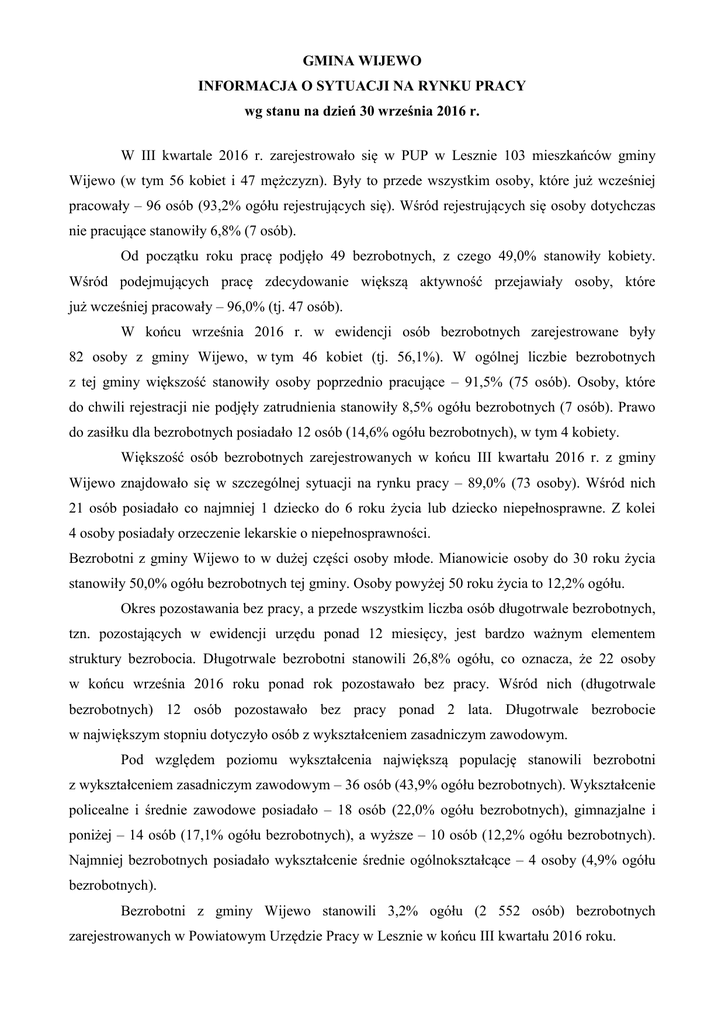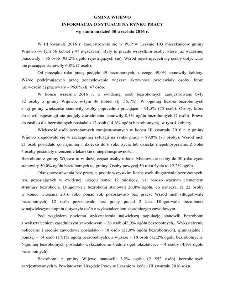 Gmina Wijewo - Informacja o sytuacji na rynku pracy wg stanu na
