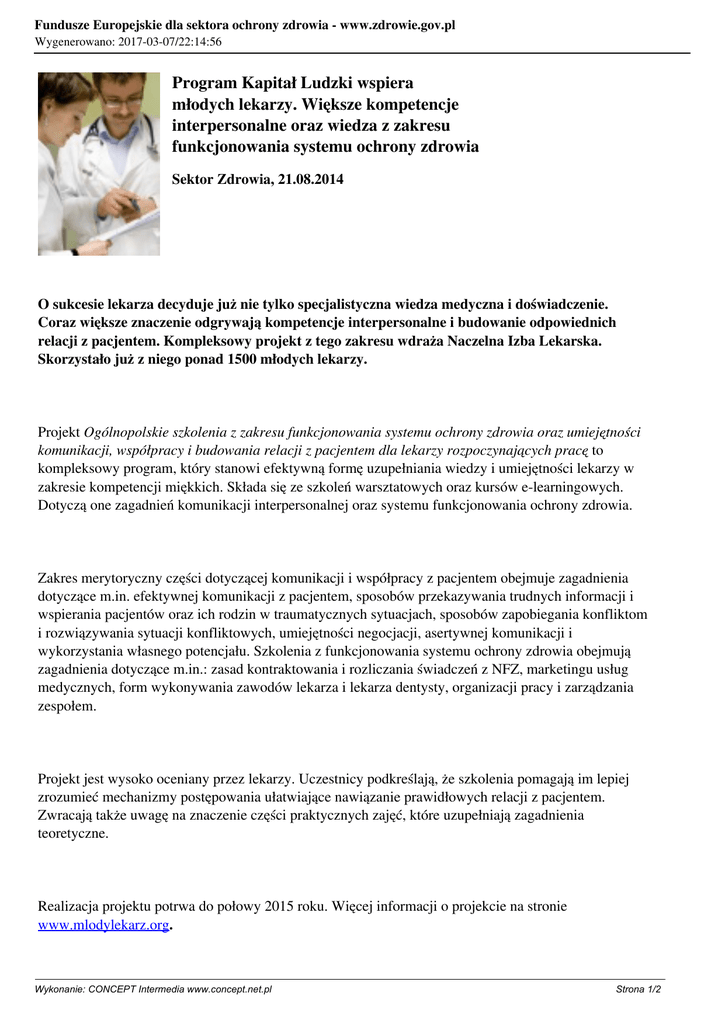 Fundusze Europejskie dla sektora ochrony zdrowia - www.zdrowie.gov.pl Wygenerowano: 2017-03-07/22:14:56 Program Kapitał Ludzki wspiera młodych lekarzy. Większe kompetencje interpersonalne oraz wiedza z zakresu funkcjonowania systemu ochrony zdrowia Sektor Zdrowia, 21.08.2014 O sukcesie lekarza decyduje już nie tylko specjalistyczna wiedza medyczna i doświadczenie. Coraz większe znaczenie odgrywają kompetencje interpersonalne i budowanie odpowiednich relacji z pacjentem. Kompleksowy projekt z tego zakresu wdraża Naczelna Izba Lekarska. Skorzystało już z niego ponad 1500 młodych lekarzy. Projekt Ogólnopolskie szkolenia z zakresu funkcjonowania systemu ochrony zdrowia oraz umiejętności komunikacji, współpracy i budowania relacji z pacjentem dla lekarzy rozpoczynających pracę to kompleksowy program, który stanowi efektywną formę uzupełniania wiedzy i umiejętności lekarzy w zakresie kompetencji miękkich. Składa się ze szkoleń warsztatowych oraz kursów e-learningowych. Dotyczą one zagadnień komunikacji interpersonalnej oraz systemu funkcjonowania ochrony zdrowia. Zakres merytoryczny części dotyczącej komunikacji i współpracy z pacjentem obejmuje zagadnienia dotyczące m.in. efektywnej komunikacji z pacjentem, sposobów przekazywania trudnych informacji i wspierania pacjentów oraz ich rodzin w traumatycznych sytuacjach, sposobów zapobiegania konfliktom i rozwiązywania sytuacji konfliktowych, umiejętności negocjacji, asertywnej komunikacji i wykorzystania własnego potencjału. Szkolenia z funkcjonowania systemu ochrony zdrowia obejmują zagadnienia dotyczące m.in.: zasad kontraktowania i rozliczania świadczeń z NFZ, marketingu usług medycznych, form wykonywania zawodów lekarza i lekarza dentysty, organizacji pracy i zarządzania zespołem. Projekt jest wysoko oceniany przez lekarzy. Uczestnicy podkreślają, że szkolenia pomagają im lepiej zrozumieć mechanizmy postępowania ułatwiające nawiązanie prawidłowych relacji z pacjentem. Zwracają także uwagę na znaczenie części praktycznych zajęć, które uzupełniają zagadnienia teoretyczne. Realizacja projektu potrwa do połowy 2015 roku. Więcej informacji o projekcie na stronie www.mlodylekarz.org. Wykonanie: CONCEPT Intermedia www.concept.net.pl Strona 1/2 Fundusze Europejskie dla sektora ochrony zdrowia - www.zdrowie.gov.pl Wygenerowano: 2017-03-07/22:14:56 Wykonanie: CONCEPT Intermedia www.concept.net.pl Strona 2/2