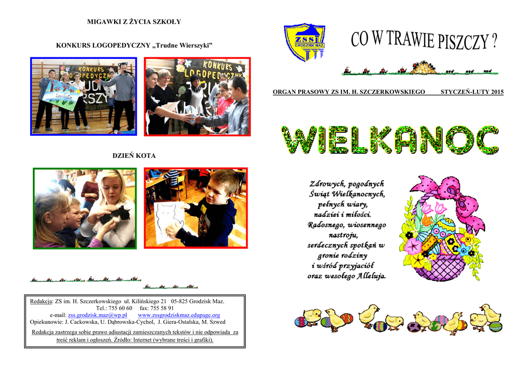 MIGAWKI Z ŻYCIA SZKOŁY KONKURS LOGOPEDYCZNY „Trudne Wierszyki” ORGAN PRASOWY ZS IM. H. SZCZERKOWSKIEGO___ DZIEŃ KOTA Redakcja: ZS im. H. Szczerkowskiego ul. Kilińskiego 21 05-825 Grodzisk Maz. Tel.: 755 60 60 fax: 755 58 91 www.zssgrodziskmaz.edupage.org e-mail: [email protected] Opiekunowie: J. Cackowska, U. Dąbrowska-Cychol, J. Giera-Ostalska, M. Szwed Redakcja zastrzega sobie prawo adiustacji zamieszczanych tekstów i nie odpowiada za treść reklam i ogłoszeń. Źródło: Internet (wybrane treści i grafiki). STYCZEŃ-LUTY 2015 ZWYCZAJE WIELKANOCNE MIGAWKI Z ŻYCIA SZKOŁY POWITANIE WIOSNY Świąteczne porządki i kraszenie jajek Na Święta Wielkiej Nocy wymiatano ze wszystkich kątów zimę, a razem z nią wszystkie choroby, zło i niegodziwości. Ozdabiano jajka, które symbolizowały siłę życiową, płodność, moc działającą na złe duchy, a przede wszystkim początek nowego życia. Palemki na szczęście Niedziela Palmowa rozpoczyna Wielki Tydzień. Dawniej wierzono, że smagnięcie poświęconą palmą zapewni szczęście, a połknięcie bazi przyniesie zdrowie i bogactwo. Topienie Judasza i kołatanie W Wielką Środę młodzież wykonywała słomianą kukłę Judasza. Niesiono ją przez wieś, a stojący przy drodze ludzie szturchali „zdrajcę” kijami. Na koniec topiono Judasza w rzece. Kołatki i grzechotki służyły młodzieży do urządzania psot – hałasowania i straszenia przechodniów. Pogrzeb żuru i wieszanie śledzia Na zakończenie postu wylewano sagany żuru na ziemię. Ludzie mięli dość zupy, którą jedli przez cały post. Teraz chcieli zakosztować lepszych smakołyków. Podobnie „pozbywano się” innej postnej potrawy – śledzia. Przybijano go do drzewa, aby zrobił miejsce w kuchni dla dań mięsnych. Święconka W Wielką Sobotę święcono pokarmy – wędliny zapewniające zdrowie, chrzan na pamiątkę goryczy Męki Pańskiej, masło jako znak dobrobytu, sól - ochronę przed złem, jaja symbolizujące zwycięstwo życia nad śmiercią. W koszyczku nie mogło zabraknąć baranka – Chrystusa Zmartwychwstałego. Wielka Niedziela Śpiochów budziło bicie dzwonów i wybuchy petard głoszące Zmartwychwstanie Pana i wzywające na Rezurekcję. Po nabożeństwie zasiadano do uroczystego śniadania, dzielono się jajkiem i składano sobie życzenia. Na stole nie mogło zabraknąć baby i dziada, czyli babki wielkanocnej i mazurka. Lany poniedziałek Śmigus-dyngus, czyli święto lejka polegało na oblewaniu wszystkich wodą. Każda panna chciała być oblana, ponieważ wróżyło to jej szybkie wyjście za mąż. Obdarowywanie się pisankami i szukanie zajączka Młodzi ludzie dawali sobie w prezencie własnoręcznie zrobione pisanki. Było to znakiem, że lubi się daną osobę. Inny zwyczaj to szukanie zajączka, czyli ukrytego upominku dla każdego z domowników. KIERMASZ WIELKANOCNY