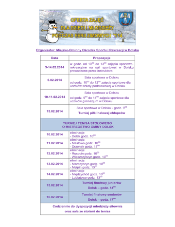 Organizator: Miejsko-Gminny Ośrodek Sportu i Rekreacji w Dolsku Data Propozycje 3-14.02.2014 w godz. od 1000 do 1300 zajęcia sportoworekreacyjne na sali sportowej w Dolsku prowadzone przez instruktora Sala sportowa w Dolsku 6.02.2014 od godz. 1000 do 1200 zajęcia sportowe dla uczniów szkoły podstawowej w Dolsku Sala sportowa w Dolsku 10-11.02.2014 od godz. 900 do 1400 zajęcia sportowe dla uczniów gimnazjum w Dolsku Sala sportowa w Dolsku - godz. 900 15.02.2014 Turniej piłki halowej chłopców TURNIEJ TENISA STOŁOWEGO O MISTRZOSTWO GMINY DOLSK 10.02.2014 11.02.2014 12.02.2014 13.02.2014 14.02.2014 15.02.2014 16.02.2014 eliminacje: - Dolsk godz. 1000 eliminacje: - Masłowo godz. 1000 - Drzonek godz. 1300 eliminacje: - Rusocin godz. 1000 - Wieszczyczyn godz. 1300 eliminacje: - Mszczyczyn godz. 1000 - Mełpin godz. 1300 eliminacje - Międzychód godz. 1000 - Lubiatowo godz. 1300 Turniej finałowy juniorów Dolsk – godz. 1400 Turniej finałowy seniorów Dolsk – godz. 1700 Codziennie do dyspozycji młodzieŜy siłownia oraz sala ze stołami do tenisa Organizator: Szkoła Podstawowa im. Janusza Kusocińskiego w Dolsku Data Propozycje 03.02.2014 Wyjazd do Śremu do kina Słonko dla uczniów z klas I-III 04.02.2014 Wyjazd na basen Oaza do Kórnika dla uczniów z klas I-VI 05.02.2014 Warsztaty decoupage dla uczniów klas I-VI Szkoła Podstawowa w Dolsku 06.02.2014 Ferie na sportowo - sala MGOSiR w Dolsku 07.02.2014 Wycieczka do Gniezna (w programie m.in. zwiedzanie katedry, wizyta muzeum i teatrze), wyjazd dla uczniów klas IV-VI Organizator: Gimnazjum im. Powstańców Wielkopolskich w Dolsku Data Propozycje 06.02.2014 Dyskoteka szkolna godz. 1700 - 2100 07.02.2014 Zajęcia w sali komputerowej gimnazjum – druŜynowy turniej Counter-Strike 10.02.2014 Ferie na sportowo - sala MGOSiR w Dolsku: godz.900-1400 – zawody sportowe - turniej piłki siatkowej 4x4 (druŜyny mieszane) 11.02.2014 Ferie na sportowo - sala MGOSiR w Dolsku: godz.900-1400 – Walentynkowy Turniej w piłkę siatkową chłopców i dziewcząt 12.02.2014 Wyjazd do kina KINEPOLIS do Poznania Organizator: Szkoła Podstawowa w Masłowie Data Propozycje 05.02.2014 Wycieczka do Poznania (kino. muzeum, katedra) 06.02.2014 Balik karnawałowy 11.02.2014 Wyjazd na bowling do Śremu Organizator: Biblioteka Publiczna Miasta i Gminy Dolsk Data Propozycje w godz. od 1100 do 1300 zajęcia plastyczne (m.in. 03-07.02.2014 papier-mâché, origami), głośne czytanie bajek 10-14.02.2014 wybranych przez dzieci; zajęcia z wolontariuszami Sala widowiskowa w Dolsku – 04.02.2014 godz. 1200 przedstawienie teatralne: „Grymasy Królewny Kasi” Ostatnia aktualizacja: 28 stycznia 2014 r.