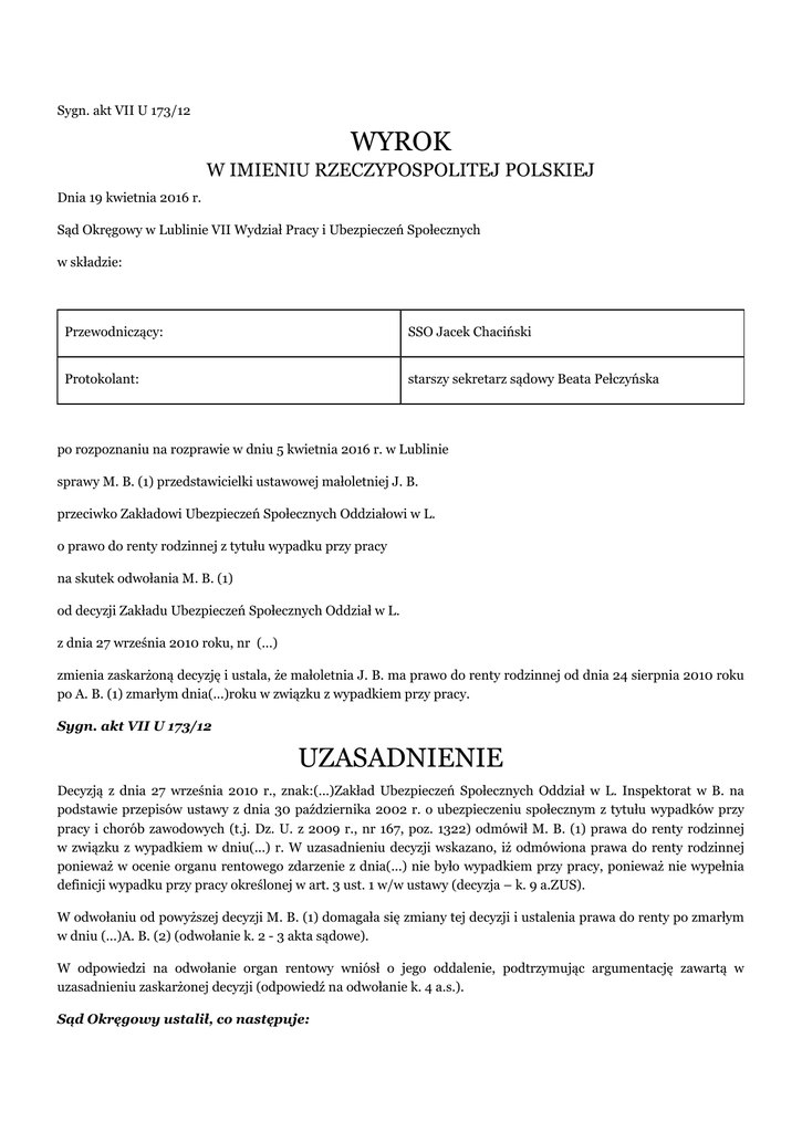 Sygn. akt VII U 173/12 WYROK W IMIENIU RZECZYPOSPOLITEJ POLSKIEJ Dnia 19 kwietnia 2016 r. Sąd Okręgowy w Lublinie VII Wydział Pracy i Ubezpieczeń Społecznych w składzie: Przewodniczący: SSO Jacek Chaciński Protokolant: starszy sekretarz sądowy Beata Pełczyńska po rozpoznaniu na rozprawie w dniu 5 kwietnia 2016 r. w Lublinie sprawy M. B. (1) przedstawicielki ustawowej małoletniej J. B. przeciwko Zakładowi Ubezpieczeń Społecznych Oddziałowi w L. o prawo do renty rodzinnej z tytułu wypadku przy pracy na skutek odwołania M. B. (1) od decyzji Zakładu Ubezpieczeń Społecznych Oddział w L. z dnia 27 września 2010 roku, nr (...) zmienia zaskarżoną decyzję i ustala, że małoletnia J. B. ma prawo do renty rodzinnej od dnia 24 sierpnia 2010 roku po A. B. (1) zmarłym dnia(...)roku w związku z wypadkiem przy pracy. Sygn. akt VII U 173/12 UZASADNIENIE Decyzją z dnia 27 września 2010 r., znak:(...)Zakład Ubezpieczeń Społecznych Oddział w L. Inspektorat w B. na podstawie przepisów ustawy z dnia 30 października 2002 r. o ubezpieczeniu społecznym z tytułu wypadków przy pracy i chorób zawodowych (t.j. Dz. U. z 2009 r., nr 167, poz. 1322) odmówił M. B. (1) prawa do renty rodzinnej w związku z wypadkiem w dniu(...) r. W uzasadnieniu decyzji wskazano, iż odmówiona prawa do renty rodzinnej ponieważ w ocenie organu rentowego zdarzenie z dnia(...) nie było wypadkiem przy pracy, ponieważ nie wypełnia definicji wypadku przy pracy określonej w art. 3 ust. 1 w/w ustawy (decyzja – k. 9 a.ZUS). W odwołaniu od powyższej decyzji M. B. (1) domagała się zmiany tej decyzji i ustalenia prawa do renty po zmarłym w dniu (...)A. B. (2) (odwołanie k. 2 - 3 akta sądowe). W odpowiedzi na odwołanie organ rentowy wniósł o jego oddalenie, podtrzymując argumentację zawartą w uzasadnieniu zaskarżonej decyzji (odpowiedź na odwołanie k. 4 a.s.). Sąd Okręgowy ustalił, co następuje: W dniu 24 sierpnia 2010 r. M. B. (1), jako przedstawiciel ustawowy małoletniej J. B., złożyła do Zakładu Ubezpieczeń Społecznych wniosek o rentę rodzinną w związku z wypadkiem przy pracy jej męża z dnia(...)oraz wniosek o przyznanie jednorazowego odszkodowania dla niej i małoletniej córki w związku ze śmiertelnym wypadkiem w w/w dniu A. B. (1). Wobec powyższego organ rentowy w dniu 27 września 2010 r. wydał dwie decyzje, na podstawie których odmówił skarżącej prawa do renty rodzinnej w związku wypadkiem jej męża w dniu (...) oraz prawa do jednorazowego odszkodowania dla wnioskodawczyni i jej małoletniej córki. Od w/w decyzji M. B. (1) złożyła odwołania. Na podstawie postanowienia z dnia 19 kwietnia 2011 r. Sąd zawiesił postępowanie na zgodny wniosek stron, które zostało podjęte w dniu 23 kwietnia 2012 r. Następnie na podstawie postanowienia z dnia 3 lipca 2012 r. Sąd zawiesił postępowanie do czasu zakończenia sprawy VII U 366/12 Sądu Rejonowego Lublin-Zachód w Lublinie dotyczącej prawa do jednorazowego odszkodowania z tytułu śmiertelnego wypadku przy pracy (postanowienia – k. 32 i 47 a.s.). W celu dokonania niezbędnych ustaleń Sąd dopuścił dowody z dokumentów znajdujących się w aktach sprawy i aktach ZUS oraz dowody z dokumentów znajdujących się w aktach sprawy o sygn. VII U 366/12 Sądu Rejonowego LublinZachód w Lublinie w postaci protokołu ustalenia okoliczności i przyczyn wypadku przy pracy, z zakresu obowiązków A. B. (1), protokołu kontroli PIP, opinii biegłego sądowego z zakresu medycyny sądowej wywołanej w sprawie VII K 1801/11, karty medycznych czynności ratunkowych, wyniku badania krwi, protokołów zawierających zeznania świadków P. P., T. G., M. S., K. S., M. P., W. B., H. N.. A. B. (1) w dniu(...) rozpoczął pracę o godz. 7:00 . Do pracy przybył swoim samochodem osobowym jednocześnie przywożąc współpracowników: W. B., M. S., M. P. i K. S.. A. B. (1) był zatrudniony na stanowisku ładowacz gazu. W związku z tym, że przedmiotowego dnia nie było przeładunku parafiny został on skierowany przez mistrza zmianowego K. S. do przeładunku gazu. K. S. ok. godz. 7:00 w dniu zdarzenia rozdzielił pracę między pracowników. Warunki pracy były trudne, gdyż panowała temperatura ok. -20oC. A. B. (1) wraz z T. G. i M. S. od czasu przydzielenia obowiązków wykonywali czynności przy przeładunku gazu z wagonów szerokotorowych do wagonów normalnotorowych tj. nadzorowali przeładunek gazu, na estakadzie odłączali instalację technologiczną od wagonów szerokotorowych oraz od wagonów normalnotorowych z poziomu torowiska, dokonywali zabezpieczenia wagonów normalnotorowych po załadunku gazem, plombowali wagony. Każdy z pracowników wykonywał pojedynczo, samodzielnie swoje czynności przy wagonie. Pomiędzy godz. 10.00 a godz.11.00 A. B. (1) pomógł W. B. zepchnąć wagony drugim ciągnikiem. W ciągu dnia, około godz. 11.00 A. B. (1) był w budynku „majstrówki” w pomieszczeniu socjalnym, gdzie pracownicy podczas przerwy mogli skorzystać z toalety, ogrzać się, zjeść, napić się kawy, herbaty. A. B. (1), K. S. i T. G. zakończyli pracę przy wagonach szerokotorowych przed południem. Po odłączeniu instalacji technologicznej i oddesaniu gazu z wagonów szerokotorowych na torach zeszli z wagonów szerokotorowych na pomost estakady i później na plac udając się do wagonów normalnotorowych też odłączyć instalację technologiczną. Następnie majster K. S. polecił im sprawdzenie wagonów oraz zabezpieczenie zaworów załadunkowych i zaplombowanie ich. Do zaworów są wcześniej podłączone węże, a po zakończeniu prac zawory są plombowane na plomby plastikowe, zaciskowe. Każdy z trzech pracujących wykonywał tę pracę przy innym wagonie. T. G. sprawdzał wagony ze składu od pierwszego stanowiska, natomiast A. B. (1) był na drugim końcu składu. Gdy około godz. 13 kierownik zmiany P. P. udał się na estakadę A. B. (1) dokręcał zaślepkę po zdjęciu węża. Około g