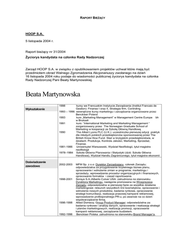 RAPORT BIEŻĄCY HOOP S.A. 5 listopada 2004 r. Raport bieżący nr 31/2004 Życiorys kandydata na członka Rady Nadzorczej Zarząd HOOP S.A. w związku z opublikowaniem projektów uchwał które mają być przedmiotem obrad Walnego Zgromadzenia Akcjonariuszy zwołanego na dzień 16 listopada 2004 roku podaje do wiadomości publicznej życiorys kandydata na członka Rady Nadzorczej Pani Beaty Martynowskiej. Beata Martynowska 1998 Wykształcenie Doświadczenie zawodowe kursy we Francuskim Instytucie Zarządzania (Institut Francais de Gestion): Finanse I oraz II, Strategia firm, Controling 1993 – 1996 wewnętrzne kursy marketingu i zarządzania organizowane przez Benckiser Poland 1993 kurs „Marketing Management” w Management Centre Europe bh w Brukseli 1991 kurs: “International Marketing and Marketing Management “ zorganizowany przez The Norwegian Graduate School of Marketing w kooperacji ze Szkołą Główną Handlową 1990 The Allied Lyons PLC (U.K.): uczestniczka pierwszej edycji praktyk dla młodych polskich przedsiębiorców sponsorowanej przez The British Know How Fund. Staż w brytyjskim przedsiębiorstwie, w działach: Produkcja, Kontrola Jakości, Marketing, Sprzedaż, Finanse. 1981-1986 Uniwersytet Warszawski, Wydział Neofilologii, tytuł magistra neofilologii 1978–1984 Szkoła Główna Planowania i Statystyki (dziś: Szkoła Główna Handlowa), Wydział Handlu Zagranicznego, tytuł magistra ekonomii 2002-2003 1998-2001 1996-1998 1992-1996 MFM Sp. z o.o: Dyrektor Zarządzający, członek Zarządu; odpowiedzialna za przygotowanie trzyletniego biznes planu, opracowanie i wdrożenie zmian w programie, marketingu i sprzedaży, wprowadzenie procedur organizacyjnych i finansowych, opracowanie formatów i zasad raportowania. Soraya S.A./Alberto Culver USA: zatrudniona na stanowisku Dyrektora Marketingu, następnie promowana na Wiceprezesa Zarządu; odpowiedzialna w pierwszej fazie za wszelkie działania marketingowe: relaunch wszystkich linii kosmetyków, opracowanie i wdrożenie nowych produktów, badania rynkowe, opracowanie strategii komunikacji, realizacja prasowej kampanii reklamowej, wprowadzenie profesjonalnego PR-u; po awansie na co dzień współzarządzanie firmą. Allied Domecq: Group Product Manager; odpowiedzialna za: badania rynkowe i analizę danych, opracowanie i realizację strategii i planów marketingowych, realizację promocji, opracowanie kampanii reklamowej, zarządzanie budżetem. Benckiser Polska: zatrudniona na stanowisku Brand Manager’a, awansowana na pozycję Senior Brand Manager’a; bezpośrednio odpowiedzialna za sektor proszków do prania (5 marek): badania rynkowe, rozwój produktu w kooperacji z międzynarodową sekcją rozwoju proszków – Benckiser International, opracowywanie we współpracy z agencjami reklamowymi komunikacji do konsumenta (reklama telewizyjna, prasowa, outdoor, POSM), opracowywanie i wdrażanie promocji konsumenckich i handlowych, zarządzanie budżetem. Języki angielski – biegle francuski – dobrze rosyjski – dobrze niemiecki – podstawowo Podstawa prawna: Pkt. 2 oraz 19 zasad ładu korporacyjnego, wynikającego z "Dobrych Praktyk w spółkach publicznych" w związku z § 27 Regulaminu Giełdy