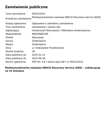 Zamówienie publiczne Tytuł zamówienia Przedmiot zamówienia 05/51/2014 Multiwyszukiwarka naukowa EBSCO Discovery Service (EDS) Rodzaj ogłoszenia Ogłoszenie o udzieleniu zamówienia Tryb zamówienia zamówienie z wolnej ręki Ogłaszający Uniwersytet Warszawski / Biblioteka Uniwersytecka Województwo MAZOWIECKIE Powiat Warszawa Gmina Śródmieście Miasto Śródmieście Ulica ul. Krakowskie Przedmieście Numer budynku 26 Data publikacji od 2015-01-15 Data publikacji do 2015-04-29 Numer zgłoszenia PZP Art. 4.8 / wolna ręka UW / nr 05/51/2014 Multiwyszukiwarka naukowa EBSCO Discovery Service (EDS) – subskrypcja na 24 miesiące