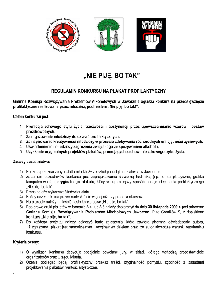 „NIE PIJĘ, BO TAK” REGULAMIN KONKURSU NA PLAKAT PROFILAKTYCZNY Gminna Komisja Rozwiązywania Problemów Alkoholowych w Jaworznie ogłasza konkurs na przedsięwzięcie profilaktyczne realizowane przez młodzież, pod hasłem „Nie piję, bo tak!”. Celem konkursu jest: 1. Promocja zdrowego stylu życia, trzeźwości i abstynencji przez upowszechnianie wzorów i postaw prozdrowotnych. 2. Zaangażowanie młodzieży do działań profilaktycznych. 3. Zainspirowanie kreatywności młodzieży w procesie zdobywania różnorodnych umiejętności życiowych. 4. Uświadomienie i młodzieży zagrożenia związanego ze spożywaniem alkoholu. 5. Uzyskanie oryginalnych projektów plakatów, promujących zachowanie zdrowego trybu życia. Zasady uczestnictwa: 1) Konkurs przeznaczony jest dla młodzieży ze szkół ponadgimnazjalnych w Jaworznie. 2) Zadaniem uczestników konkursu jest zaprojektowanie dowolną techniką (np. forma plastyczna, grafika komputerowa itp.) oryginalnego plakatu, który w najpełniejszy sposób oddaje ideę hasła profilaktycznego „Nie piję, bo tak”. 3) Prace należy wykonywać indywidualnie. 4) Każdy uczestnik ma prawo nadesłać nie więcej niż trzy prace konkursowe. 5) Na plakacie należy umieścić hasło konkursowe „Nie piję, bo tak”. 6) Papierowe druki plakatów w formacie A 4 lub A 3 należy dostarczyć do dnia 30 listopada 2009 r. pod adresem: Gminna Komisja Rozwiązywania Problemów Alkoholowych Jaworzno, Plac Górników 9, z dopiskiem: konkurs „Nie pije, bo tak”. 7) Do każdego projektu należy dołączyć kartę zgłoszenia, która zawiera pisemne oświadczenie autora, iż zgłaszany plakat jest samodzielnym i oryginalnym dziełem oraz, że autor akceptuje warunki regulaminu konkursu. Kryteria oceny: 1) O wynikach konkursu decyduje specjalnie powołane jury, w skład, którego wchodzą przedstawiciele organizatorów oraz Urzędu Miasta. 2) Ocenie podlegać będą: profilaktyczny przekaz treści, oryginalność pomysłu, zgodność z zasadami projektowania plakatów, wartość artystyczna. . Postanowienia końcowe: 1) Laureaci konkursu otrzymują dyplomy i nagrody ufundowane przez organizatorów. 2) Rozstrzygnięcie konkursu nastąpi do dnia 11 grudnia 2009 r. po uprzednim poinformowaniu wyłonionych finalistów. 3) Postanowienia niniejszego regulaminu są wyłączną podstawą prowadzenia konkursu, ich wykładnia i interpretacja należy do organizatora. 4) Dostarczenie karty zgłoszeniowej jest jednoznaczne z akceptacją regulaminu konkursu. 5) Organizatorzy konkursu zastrzegają sobie prawo do niekomercyjnego wykorzystywania prac konkursowych. KARTA ZGŁOSZENIA „Nie Piję, bo tak” Konkurs na plakat profilaktyczny Imię i nazwisko uczestnika, wiek ……………………………………………………………………………………………………............…………………………….. Nazwa instytucji reprezentowanej - szkoła, placówka …………………………………………………………………............……………………………………………………………….. ………………………............………………………………………………………………………………………………………….. Adres kontaktowy/ telefon kontaktowy ..………………………………………………………………………………………… ………………………………….........................................................................................................................................…… Oświadczenie autora/autorów Niniejszym, oświadczam, iż zgłaszany przeze mnie plakat jest samodzielnym i oryginalnym dziełem oraz, że akceptuję przedstawione warunki regulaminu konkursu. Jaworzno, dn. …………………… ……………………………………………………. ( podpis autora projektu plakatu) *Wyrażam zgodę na udział ……………………………………….w konkursie profilaktycznym „Nie pije, bo tak”. imię i nazwisko dziecko …………………………………………….. czytelny podpis rodzica/opiekuna *wypełnić w przypadku osoby niepełnoletniej