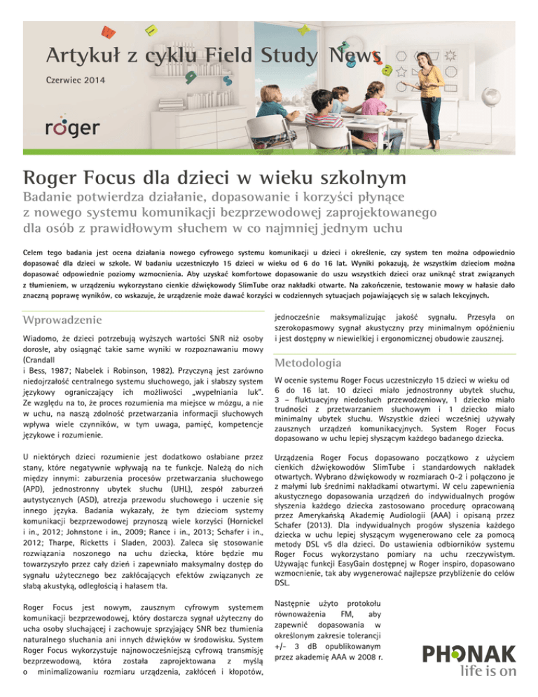 Artykuł z cyklu Field Study News Czerwiec 2014 Roger Focus dla dzieci w wieku szkolnym Badanie potwierdza działanie, dopasowanie i korzyści płynące z nowego systemu komunikacji bezprzewodowej zaprojektowanego dla osób z prawidłowym słuchem w co najmniej jednym uchu Celem tego badania jest ocena działania nowego cyfrowego systemu komunikacji u dzieci i określenie, czy system ten można odpowiednio dopasować dla dzieci w szkole. W badaniu uczestniczyło 15 dzieci w wieku od 6 do 16 lat. Wyniki pokazują, że wszystkim dzieciom można dopasować odpowiednie poziomy wzmocnienia. Aby uzyskać komfortowe dopasowanie do uszu wszystkich dzieci oraz uniknąć strat związanych z tłumieniem, w urządzeniu wykorzystano cienkie dźwiękowody SlimTube oraz nakładki otwarte. Na zakończenie, testowanie mowy w hałasie dało znaczną poprawę wyników, co wskazuje, że urządzenie może dawać korzyści w codziennych sytuacjach pojawiających się w salach lekcyjnych. Wprowadzenie Wiadomo, że dzieci potrzebują wyższych wartości SNR niż osoby dorosłe, aby osiągnąć takie same wyniki w rozpoznawaniu mowy (Crandall i Bess, 1987; Nabelek i Robinson, 1982). Przyczyną jest zarówno niedojrzałość centralnego systemu słuchowego, jak i słabszy system językowy ograniczający ich możliwości „wypełniania luk”. Ze względu na to, że proces rozumienia ma miejsce w mózgu, a nie w uchu, na naszą zdolność przetwarzania informacji słuchowych wpływa wiele czynników, w tym uwaga, pamięć, kompetencje językowe i rozumienie. jednocześnie maksymalizując jakość sygnału. Przesyła on szerokopasmowy sygnał akustyczny przy minimalnym opóźnieniu i jest dostępny w niewielkiej i ergonomicznej obudowie zausznej. Metodologia W ocenie systemu Roger Focus uczestniczyło 15 dzieci w wieku od 6 do 16 lat. 10 dzieci miało jednostronny ubytek słuchu, 3 – fluktuacyjny niedosłuch przewodzeniowy, 1 dziecko miało trudności z przetwarzaniem słuchowym i 1 dziecko miało minimalny ubytek słuchu. Wszystkie dzieci wcześniej używały zausznych urządzeń komunikacyjnych. System Roger Focus dopasowano w uchu lepiej słyszącym każdego badanego dziecka. U niektórych dzieci rozumienie jest dodatkowo osłabiane przez stany, które negatywnie wpływają na te funkcje. Należą do nich między innymi: zaburzenia procesów przetwarzania słuchowego (APD), jednostronny ubytek słuchu (UHL), zespół zaburzeń autystycznych (ASD), atrezja przewodu słuchowego i uczenie się innego języka. Badania wykazały, że tym dzieciom systemy komunikacji bezprzewodowej przynoszą wiele korzyści (Hornickel i in., 2012; Johnstone i in., 2009; Rance i in., 2013; Schafer i in., 2012; Tharpe, Ricketts i Sladen, 2003). Zaleca się stosowanie rozwiązania noszonego na uchu dziecka, które będzie mu towarzyszyło przez cały dzień i zapewniało maksymalny dostęp do sygnału użytecznego bez zakłócających efektów związanych ze słabą akustyką, odległością i hałasem tła. Urządzenia Roger Focus dopasowano początkowo z użyciem cienkich dźwiękowodów SlimTube i standardowych nakładek otwartych. Wybrano dźwiękowody w rozmiarach 0-2 i połączono je z małymi lub średnimi nakładkami otwartymi. W celu zapewnienia akustycznego dopasowania urządzeń do indywidualnych progów słyszenia każdego dziecka zastosowano procedurę opracowaną przez Amerykańską Akademię Audiologii (AAA) i opisaną przez Schafer (2013). Dla indywidualnych progów słyszenia każdego dziecka w uchu lepiej słyszącym wygenerowano cele za pomocą metody DSL v5 dla dzieci. Do ustawienia odbiorników systemu Roger Focus wykorzystano pomiary na uchu rzeczywistym. Używając funkcji EasyGain dostępnej w Roger inspiro, dopasowano wzmocnienie, tak aby wygenerować najlepsze przybliżenie do celów DSL. Roger Focus jest nowym, zausznym cyfrowym systemem komunikacji bezprzewodowej, który dostarcza sygnał użyteczny do ucha osoby słuchającej i zachowuje sprzyjający SNR bez tłumienia naturalnego słuchania ani innych dźwięków w środowisku. System Roger Focus wykorzystuje najnowocześniejszą cyfrową transmisję bezprzewodową, która została zaprojektowana z myślą o minimalizowaniu rozmiaru urządzenia, zakłóceń i kłopotów, Następnie użyto protokołu równoważenia FM, aby zapewnić dopasowania w określonym zakresie tolerancji +/- 3 dB opublikowanym przez akademię AAA w 2008 r. Dalsze testy przeprowadzono w wyciszonej kabinie. Badane osoby znajdowały się w zasięgu systemu nagłośnienia, a głośniki były umieszczone pod kątem +/- 450 w stosunku do nich. Mikrofon Roger inspiro został zawieszony 15 cm poniżej centralnej membrany głośnika po stronie ze słabszym słuchem. Sygnał był generowany po tej właśnie stronie, a hałas - po stronie z lepszym słuchem u każdego dziecka. Najpierw użyto procedury z 7punktową skalą głośności, aby sprawdzić, czy poziomy docelowe były komfortowe dla dziecka. Jeśli poziom nie był komfortowy, użyto funkcji EasyGain do dopasowania odbiornika, a test powtarzano do czasu, gdy dziecko określiło poziom jako komfortowy. Użyto SNR +5 do oceny komfortu przy sygnale na poziomie 60 dB HL i gwarze w tle na poziomie 55 dB HL. Do oceny rozumienia mowy w hałasie przy SNR -5 użyto testu BKB (Bamford-Kowal-Bench). Dla tego testu użyto sygnału na poziomie 60 dB HL przy gwarze w tle na poziomie 65 dB HL. Po tych testach dzieci używały odbiorników Roger Focus podczas zwykłych codziennych zajęć lekcyjnych przez następne 3 tygodnie. Po tym okresie próbnym przeprowadzono badanie każdego dziecka w jego klasie za pomocą kwestionariusza w celu uzyskania subiektywnej oceny jakości sygnału, komfortu i stylistyki urządzenia. Wyniki i omówienie Wszystkie urządzenia można było dopasować z tolerancją równą +/- 3 dB, która jest określona przez protokół równoważenia FM. Pomiary dla ucha rzeczywistego potwierdziły, że urządzenia nie przekroczył
