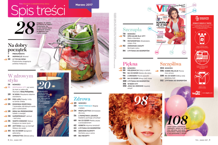 Spis treści 28 Marzec 2017 78 Uważasz, że sałatką nie można się najeść? Przekonamy cię, że jest inaczej! Nasze propozycje sprawią, że będziesz syta i pełna energii. Na dobry początek 7 8 10 PRENUMERATA INSPIRACJE Wiosna! O TYM SIĘ MÓWI Przełomowe osiągnięcia polskiej medycyny W zdrowym stylu 14 16 NOWOŚCI SPOTKANIA VITY Już wiem, że mam w sobie siłę Wywiad z Iloną Felicjańską 20 W DOMU Mieszkanie idealnie oświetlone 24 POD LUPĄ Prawdy i mity na temat chleba 26 RODZINNA ROZRYWKA 7 powodów, dla których warto grać w planszówki 20 Odpowiednie lampy dodają wnętrzom uroku i przytulności, ale też wpływają na twój wzrok i samopoczucie. Jak prawidłowo oświetlić mieszkanie? Zdrowa 48 50 NOWOŚCI TEMAT MIESIĄCA Wygraj z bólem 28 MENU NA PRZEDWIOŚNE Sałatki z energią! 54 PROFILAKTYKA Gimnastyka dla oczu 34 SUPERPRODUKT Jarmuż – król zimy 56 Z PAMIĘTNIKA LEKARZA Każdemu pomogę schudnąć! 36 WARTO WIEDZIEĆ Wpływ Księżyca na nasze życie 60 NA CO DZIEŃ Między grypą a przeziębieniem 40 AKTYWNA Czas na trening? Wskocz do wody! 62 64 66 KOBIETA Intymna świeżość! 44 NA CO DZIEŃ Spragnieni adrenaliny 46 GIMNASTYKA Zdrowe plecy 4 _ Vita _ marzec 2017 28 ZDJĘCIE NA OKŁADCE: ZDJĘCIE: PIOTR RATAJSKI; STYLIZACJA: ANNA MIETELSKA; MAKIJAŻ: DARIA SIKORSKA; FRYZURA: RAFAŁ ŻUREK/METALUNA; KURTKA: SINSAY, SPODNIE: C&A, TRAMPKI: RESERVED Vita Magazyn o zdrowym stylu życia 68 2 PYTANIA DO EKSPERTÓW SERCOWE KŁOPOTY Świńskie uszy a serce Szczupła 54 50 70 72 NOWOŚCI SPECJALNIE DLA VITY Dieta z blendera 78 METAMORFOZA Wiedziałam, czego chcę 82 ZDROWSZE ZAKUPY Na tropie cukru 84 3 PYTANIA DO EKSPERTÓW 88 36 Szczęśliwa Piękna 86 88 94 96 98 100 101 102 72 NOWOŚCI PIELĘGNACJA Celuj w cellulit 104 106 NA CO DZIEŃ Detoks dla skóry Z DROGERII Mocne pazurki! 108 NA CO DZIEŃ Odkryj swój językowy kod 112 2 PYTANIA DO EKSPERTÓW NA CO DZIEŃ Włosy (od) nowa 2 PYTANIA DO EKSPERTÓW NOWOŚCI DOBRE RELACJE Poczuj moc emocji WYBÓR VITY JOGA NA ZDROWIE Uspokój umysł! 98 Podpowiadamy, jakie zabiegi domowe i profesjonalne najlepiej zregenerują twoje włosy po zimie. 108 Jesteś typem czerwonym, niebieskim, żołtym czy białym? Gdy odkryjesz swój język komunikacji, łatwiej będzie ci się porozumieć z innymi. BEZ RECEPTY Vita _ marzec 2017 _ 5