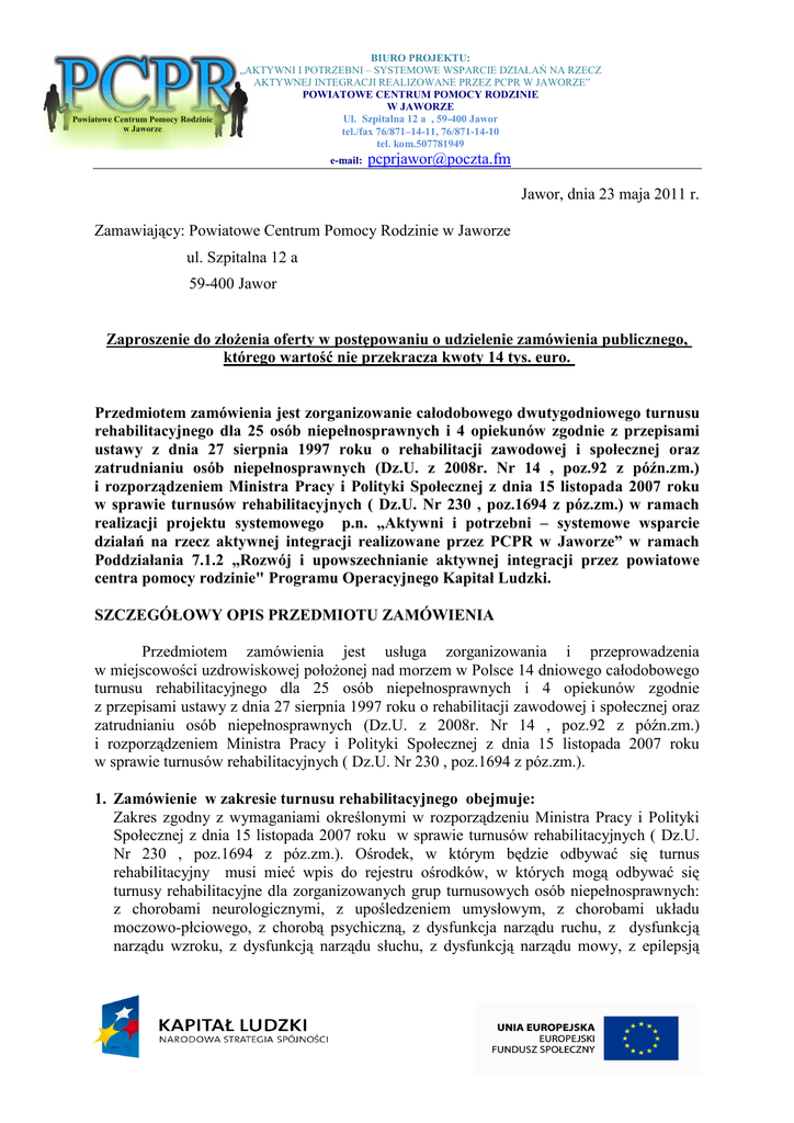 BIURO PROJEKTU: „AKTYWNI I POTRZEBNI – SYSTEMOWE WSPARCIE DZIAŁAŃ NA RZECZ AKTYWNEJ INTEGRACJI REALIZOWANE PRZEZ PCPR W JAWORZE” POWIATOWE CENTRUM POMOCY RODZINIE W JAWORZE Ul. Szpitalna 12 a , 59-400 Jawor tel./fax 76/871–14-11, 76/871-14-10 tel. kom.507781949 e-mail: [email protected] Jawor, dnia 23 maja 2011 r. Zamawiający: Powiatowe Centrum Pomocy Rodzinie w Jaworze ul. Szpitalna 12 a 59-400 Jawor Zaproszenie do złożenia oferty w postępowaniu o udzielenie zamówienia publicznego, którego wartość nie przekracza kwoty 14 tys. euro. Przedmiotem zamówienia jest zorganizowanie całodobowego dwutygodniowego turnusu rehabilitacyjnego dla 25 osób niepełnosprawnych i 4 opiekunów zgodnie z przepisami ustawy z dnia 27 sierpnia 1997 roku o rehabilitacji zawodowej i społecznej oraz zatrudnianiu osób niepełnosprawnych (Dz.U. z 2008r. Nr 14 , poz.92 z późn.zm.) i rozporządzeniem Ministra Pracy i Polityki Społecznej z dnia 15 listopada 2007 roku w sprawie turnusów rehabilitacyjnych ( Dz.U. Nr 230 , poz.1694 z póz.zm.) w ramach realizacji projektu systemowego p.n. „Aktywni i potrzebni – systemowe wsparcie działań na rzecz aktywnej integracji realizowane przez PCPR w Jaworze” w ramach Poddziałania 7.1.2 „Rozwój i upowszechnianie aktywnej integracji przez powiatowe centra pomocy rodzinie" Programu Operacyjnego Kapitał Ludzki. SZCZEGÓŁOWY OPIS PRZEDMIOTU ZAMÓWIENIA Przedmiotem zamówienia jest usługa zorganizowania i przeprowadzenia w miejscowości uzdrowiskowej położonej nad morzem w Polsce 14 dniowego całodobowego turnusu rehabilitacyjnego dla 25 osób niepełnosprawnych i 4 opiekunów zgodnie z przepisami ustawy z dnia 27 sierpnia 1997 roku o rehabilitacji zawodowej i społecznej oraz zatrudnianiu osób niepełnosprawnych (Dz.U. z 2008r. Nr 14 , poz.92 z późn.zm.) i rozporządzeniem Ministra Pracy i Polityki Społecznej z dnia 15 listopada 2007 roku w sprawie turnusów rehabilitacyjnych ( Dz.U. Nr 230 , poz.1694 z póz.zm.). 1. Zamówienie w zakresie turnusu rehabilitacyjnego obejmuje: Zakres zgodny z wymaganiami określonymi w rozporządzeniu Ministra Pracy i Polityki Społecznej z dnia 15 listopada 2007 roku w sprawie turnusów rehabilitacyjnych ( Dz.U. Nr 230 , poz.1694 z póz.zm.). Ośrodek, w którym będzie odbywać się turnus rehabilitacyjny musi mieć wpis do rejestru ośrodków, w których mogą odbywać się turnusy rehabilitacyjne dla zorganizowanych grup turnusowych osób niepełnosprawnych: z chorobami neurologicznymi, z upośledzeniem umysłowym, z chorobami układu moczowo-płciowego, z chorobą psychiczną, z dysfunkcja narządu ruchu, z dysfunkcją narządu wzroku, z dysfunkcją narządu słuchu, z dysfunkcją narządu mowy, z epilepsją BIURO PROJEKTU: „AKTYWNI I POTRZEBNI – SYSTEMOWE WSPARCIE DZIAŁAŃ NA RZECZ AKTYWNEJ INTEGRACJI REALIZOWANE PRZEZ PCPR W JAWORZE” POWIATOWE CENTRUM POMOCY RODZINIE W JAWORZE Ul. Szpitalna 12 a , 59-400 Jawor tel./fax 76/871–14-11, 76/871-14-10 tel. kom.507781949 e-mail: [email protected] i inne. 2. Wymogi Zamawiającego dotyczące realizacji przedmiotu zamówienia: a) Zamawiający wymaga, aby zajęcia były prowadzone przez osoby posiadające odpowiednie kwalifikacje. Wymagania kadrowe dotyczące organizacji turnusu rehabilitacyjnego zawarte są w rozporządzeniem Ministra Pracy i Polityki Społecznej z dnia 15 listopada 2007 roku w sprawie turnusów rehabilitacyjnych ( Dz.U. Nr 230 , poz.1694 z póz.zm.). b) Zamawiający wymaga, aby Wykonawca zabezpieczył dla uczestników: bazę rehabilitacyjną wraz ze sprzętem niezbędnym do realizacji rehabilitacji. c) Dojazd wszystkim uczestnikom turnusu z Jawora do ośrodka organizującego turnus zapewnia Wykonawca. d) Wykonawca zapewni uczestnikom turnusu wyżywienie 3 razy dziennie z uwzględnieniem odpowiednich diet dostosowanych do ich stanu zdrowia. e) Uczestnicy turnusu i opiekunowie będą zakwaterowani w pokojach 2-3 osobowych z łazienkami z pełnym węzłem sanitarnym. f) Wykonawca zapewni uczestnikom w trakcie turnusu co najmniej 20 zabiegów rehabilitacyjnych zleconych przez lekarza. g) Wykonawca zapewni uczestnikom turnusu zajęcia integracyjne o charakterze kulturalno-rozrywkowym , w tym co najmniej jedną wycieczkę krajoznawczą. h) Ośrodek realizujący turnus rehabilitacyjny zapewni osobę odpowiadającą za przebieg turnusu oraz kontakty z Zamawiającym. i) Wykonawca zapewni animatora dla uczestników turnusu odpowiedzialnego za koordynację pobytu grupy na turnusie. j) Wykonawca poniesie koszty opłaty uzdrowiskowej/klimatycznej za wszystkich uczestników turnusu i opiekunów, jeśli wymagać będzie tego lokalizacja ośrodka. k) Wykonawca opłaci ubezpieczenie NNW dla każdego uczestnika turnusu i opiekuna obejmujące dojazd uczestników turnusu z miejsca zamieszkania do miejsca odbywania się turnusu oraz dojazd z miejsca odbywania się turnusu do miejsca zamieszkania uczestników turnusu, całodobowy 14 dniowy pobyt na turnusie rehabilitacyjnym, na kwotę nie niższą niż 10 000 zł na jedną osobę. l) Usługi są świadczone w ramach projektu współfinansowanego ze środków Unii Europejskiej w ramach Europejskiego Funduszu Społecznego. Informacja o wsparciu z EFS musi być widoczna dla wszystkich innych osób, które stykają się z projektem, dlatego Wykonawca ma obowiązek dopilnować, aby : • w pomieszczeniach, w których będzie realizował usługi w ramach przedmiotu zamówienia, zostały umieszczone materiały promocyjne (plakaty, ulotki itp.) dostarczone przez Zamawiającego, BIURO PROJEKTU: „AKTYWNI I POTRZEBNI – SYSTEMOWE WSPARCIE DZIAŁAŃ NA RZECZ AKTYWNEJ INTEGRACJI REALIZOWANE PRZEZ PCPR W JAWORZE” POWIATOWE CENTRUM POMOCY RODZINIE W JAWORZE Ul. Szpitalna 12 a , 59-400 Jawor tel./fax 76/871–14-11, 76/871-14-10 tel. kom.507781949 e-mail: • [email protected] sporządzane przez niego dokumenty związane z realizacją przedmiotu zamówienia (listy obecności, programy, itp.) zostały opatrzone logo: