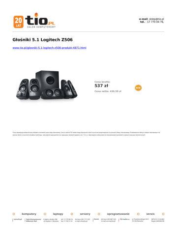 e-mail: [email protected] tel. : 17 770 04 76, Głośniki 5.1 Logitech Z506 www.tio.pl/glosniki-5.1-logitech-z506-produkt-4871.html Cena brutto: 537 zł Cena netto: 436.59 zł *Ceny obowiązują wyłącznie przy składaniu zamówień przez sklep internetowy. Ceny w salonie TiO media mogą nieznacznie różnić się od cen prezentowanych na stronach sklepu internetowego. Przedstawiona oferta w sklepie internetowym nie stanowi oferty w rozumieniu Kodeksu Cywilnego, i jest jedynie zaproszeniem do rozpoczęcia rokowań (zgodnie z art. 71 k.c.). Zastrzegamy sobie prawo do niezrealizowania zamówień z ważnych przyczyn ekonomicznych.