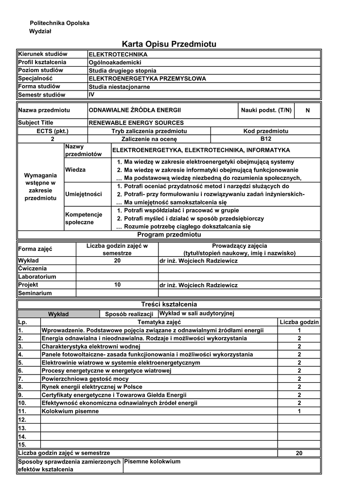 Politechnika Opolska Wydział Karta Opisu Przedmiotu Kierunek studiów Profil kształcenia Poziom studiów Specjalność Forma studiów Semestr studiów ELEKTROTECHNIKA Ogólnoakademicki Studia drugiego stopnia ELEKTROENERGETYKA PRZEMYSŁOWA Studia niestacjonarne IV Nazwa przedmiotu ODNAWIALNE ŹRÓDŁA ENERGII Nauki podst. (T/N) N Subject Title RENEWABLE ENERGY SOURCES ECTS (pkt.) Tryb zaliczenia przedmiotu Kod przedmiotu B12 2 Zaliczenie na ocenę Nazwy ELEKTROENERGETYKA, ELEKTROTECHNIKA, INFORMATYKA przedmiotów 1. Ma wiedzę w zakresie elektroenergetyki obejmującą systemy Wiedza 2. Ma wiedzę w zakresie informatyki obejmującą funkcjonowanie Wymagania … Ma podstawową wiedzę niezbedną do rozumienia społecznych, wstępne w 1. Potrafi oceniać przydatność metod i narzędzi służących do zakresie Umiejętności 2. Potrafi- przy formułowaniu i rozwiązywaniu zadań inżynierskichprzedmiotu … Ma umiejętność samokształcenia się 1. Potrafi współdziałać i pracować w grupie Kompetencje 2. Potrafi myśleć i działać w sposób przedsiębiorczy społeczne … Rozumie potrzebę ciągłego dokształcania się Program przedmiotu Forma zajęć Wykład Ćwiczenia Laboratorium Projekt Seminarium Liczba godzin zajęć w semestrze 20 10 Prowadzący zajęcia (tytuł/stopień naukowy, imię i nazwisko) dr inż. Wojciech Radziewicz dr inż. Wojciech Radziewicz Treści kształcenia Sposób realizacji Wykład w sali audytoryjnej Tematyka zajęć Wprowadzenie. Podstawowe pojęcia związane z odnawialnymi źródłami energii Energia odnawialna i nieodnawialna. Rodzaje i możliwości wykorzystania Charakterystyka elektrowni wodnej Panele fotowoltaiczne- zasada funkcjionowania i możliwości wykorzystania Elektrowinie wiatrowe w systemie elektroenergetycznym Procesy energetyczne w energetyce wiatrowej Powierzchniowa gęstość mocy Rynek energii elektrycznej w Polsce Certyfikaty energetyczne i Towarowa Giełda Energii Efektywność ekonomiczna odnawialnych źródeł energii Kolokwium pisemne Wykład Lp. 1. 2. 3. 4. 5. 6. 7. 8. 9. 10. 11. 12. 13. 14. 15. Liczba godzin zajęć w semestrze Sposoby sprawdzenia zamierzonych Pisemne kolokwium efektów kształcenia Liczba godzin 1 2 2 2 2 2 2 2 2 2 1 20 Ćwiczenia Sposób realizacji Lp. Tematyka zajęć Liczba godzin 1. 2. 3. 4. 5. 6. 7. 8. 9. 10. 11. 12. 13. 14. 15. Liczba godzin zajęć w semestrze Sposoby sprawdzenia zamierzonych efektów kształcenia Laboratorium Sposób realizacji Ćwiczenia praktyczne w labolatorium Tematyka zajęć Lp. Liczba godzin 1. 2. 3. 4. 5. 6. 7. 8. 9. 10. 11. 12. 13. 14. 15. Liczba godzin zajęć w semestrze Sposoby sprawdzenia zamierzonych Pisemne sprawozdanie z wykonanych prac laboratoryjnych efektów kształcenia Projekt Sposób realizacji Projekt w sali audytoryjnej w grupach Lp. 1. 2. 3. 4. 5. 6. 7. 8. 9. 10. 11. 12. Tematyka zajęć Rozdanie zadań projektowych i konsultacje Projekt obejmujący kalkulację produktywności i efektywność ekonomiczą odnawialnych źródeł energii realizowany za pomocą oprogramowania RetScreen Ocena wykonanych projektów Liczba godzin 1 8 1 13. 14. 15. Liczba godzin zajęć w semestrze 10 Sposoby sprawdzenia zamierzonych Ocena projektów zrealizowanych w formie pisemnej efektów kształcenia Seminarium Sposób realizacji Lp. Tematyka zajęć Liczba godzin 1. 2. 3. 4. 5. 6. 7. 8. 9. 10. 11. 12. 13. 14. 15. Liczba godzin zajęć w semestrze Sposoby sprawdzenia zamierzonych efektów kształcenia Ma uporządkowaną, podbudowaną teoretycznie wiedzę 1. obejmującą odnawialnych Ma wiedzę okluczowe trendach zagadnienia rozwojowychwi zakresie najistotniejszych 3. Ma nowych osiągnięciach zakresu odnawialnych energii podstawową wiedzęz o cyklu życia urządzeń,źródeł obiektów i Wiedza 3. systemów technicznych związanych z OZE (w, p) … Potrafi ocenić przydatność i możliwość wykorzystania 1. nowych osiągnięć (technikanalizy i technologii) w zakresie Efekty kształcenia dla Potrafi dokonać wstępnej ekonomicznej 2. podejmowanych przedmiotu - po działań inżynierskich (p) Potrafi pozyskiwać informacje z literatury, baz danych oraz Umiejętności zakończonym cyklu 3. innych właściwie dobranych źródeł, także w języku angielskim kształcenia … 1. Rozumie potrzebę uczenia się przez całe życie (w, p) 2. Potrafi współdziałać i pracować w grupie, przyjmując w niej Kompetencje społeczne 3. różne role (p) … (w, p) Metody dydaktyczne: Wykład informacyjny w formie prezentacji multimedialnych. Dyskusja dydaktyczna i konsultacje w ramach wykładu i projektu. Projekty wykonywane z wykorzystaniem oprogramowania RetScreen i Wind Farm 3.0. Materiały informacyjne na stronie internetowej. Forma i warunki zaliczenia przedmiotu: Wykład: pozytywna ocena z pisemnego kolokwium (uzyskanie co najmniej 50% punktów), uzyskanie zaliczenia z projektu. Projekt: poprawna realizacja zadania projektowego, ocena na podstawie pisemnej realizacji projektu. Literatura podstawowa: Lewandowski W.: „Proekologiczne odnawialne źródła energii”, WNT, Warszawa 2007, [1] Janiczek R., Przygrodzki M.: „Rozproszone źródła energii w systemie elektroenergetycznym”, Politechniki Śląskiej, Gliwice 2006. [2] Wydawnictwo Lubośny Z.: "Farmy wiatrowe w systemie elektroenergetycznym", Wydawnictwa Naukowo- Techniczne, [3] Warszawa 2009 [4] [5] [6] [7] [8] Literatura uzupełniająca: [1] Ackermann T.: “Wind Power in Power Systems”, Royal Institute of Technology, Stockholm 2005, [2] Boczar T.: „Energia wiatrowa. Aktualne możliwości wykorzystania”, PAK, Warszawa 2007, [3] Lewandowski W.: "Proekologiczne odnawialne źródła energii", WNT, Warszawa 2007 [4] [5] [6] [7] ______________ * niewłaściwe przekreślić ………………………………………………….. ………………………………………………………. (kierownik jednostki organizacyjnej/bezpośredni przełożony: (Dziekan Wydziału pieczęć/podpis pieczęć/podpis)