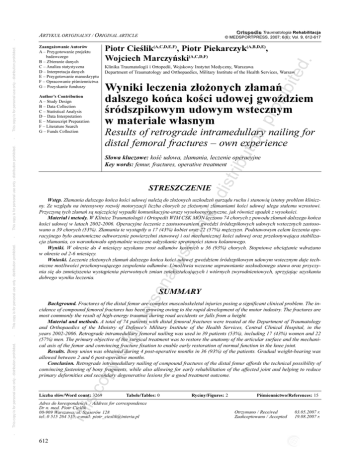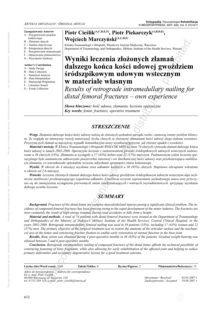 O r t o p e d i a Traumatologia Rehabilitacja © MEDSPORTPRESS, 2007; 6(6); Vol. 9, 612-617 Piotr Cieœlik(A,C,D,E,F), Piotr Piekarczyk(A,B,D,E), Wojciech Marczyñski(A,C,D,F) tio np roh ibit Klinika Traumatologii i Ortopedii, Wojskowy Instytut Medyczny, Warszawa Department of Traumatology and Orthopaedics, Military Institute of the Health Services, Warsaw Wyniki leczenia z³o¿onych z³amañ dalszego koñca koœci udowej gwoŸdziem œródszpikowym udowym wstecznym w materiale w³asnym Author’s Contribution A – Study Design B – Data Collection C – Statistical Analysis D – Data Interpretation E – Manuscript Preparation F – Literature Search G – Funds Collection Results of retrograde intramedullary nailing for distal femoral fractures – own experience ibu -d istr STRESZCZENIE on al us eo nly Wstêp. Z³amania dalszego koñca koœci udowej nale¿¹ do z³o¿onych uszkodzeñ narz¹du ruchu i stanowi¹ istotny problem kliniczny. Ze wzglêdu na intensywny rozwój motoryzacji liczba chorych ze z³o¿onymi z³amaniami koœci udowej ulega sta³emu wzrostowi. Przyczyn¹ tych z³amañ s¹ najczêœciej wypadki komunikacyjne-urazy wysokoenergetyczne, jak równie¿ upadek z wysokoœci. Materia³ i metody. W Klinice Traumatologii i Ortopedii WIM CSK MON leczono 74 chorych z powodu z³amañ dalszego koñca koœci udowej w latach 2002-2006. Operacyjne leczenie z zastosowaniem gwoŸdzi œródszpikowych udowych wstecznych zastosowano u 39 chorych (53%). Z³amania te wyst¹pi³y u 17 (43%) kobiet oraz 22 (57%) mê¿czyzn. Podstawowym celem leczenia operacyjnego by³o anatomiczne odtworzenie powierzchni stawowej i osi mechanicznej koœci udowej oraz przekonywaj¹ca stabilizacja z³amania, co warunkowa³o optymalnie wczesne odzyskanie sprawnoœci stawu kolanowego. Wyniki. W okresie do 4 miesiêcy uzyskano zrost od³amów kostnych u 36 (93%) chorych. Stopniowe obci¹¿anie wdra¿ano w okresie od 2-6 miesiêcy. Wnioski. Leczenie z³o¿onych z³amañ dalszego koñca koœci udowej gwoŸdziem œródszpikowym udowym wstecznym daje techniczne mo¿liwoœci przekonywaj¹cego zespolenia od³amów. Umo¿liwia wczesne usprawnianie uszkodzonego stawu oraz przyczynia siê do zmniejszenia wyst¹pienia pierwotnych zmian zniekszta³caj¹cych i wtórnych zwyrodnieniowych, sprzyjaj¹c uzyskaniu dobrego wyniku leczenia. pe rs SUMMARY is c op y is for Background. Fractures of the distal femur are complex musculoskeletal injuries posing a significant clinical problem. The incidence of compound femoral fractures has been growing owing to the rapid development of the motor industry. The fractures are most commonly the result of high-energy traumas during road accidents or falls from a height. Material and methods. A total of 74 patients with distal femoral fractures were treated at the Department of Traumatology and Orthopaedics of the Ministry of Defence's Military Institute of the Health Services, Central Clinical Hospital, in the years 2002-2006. Retrograde intramedullary femoral nailing was used in 39 patients (53%), including 17 (43%) women and 22 (57%) men. The primary objective of the surgical treatment was to restore the anatomy of the articular surface and the mechanical axis of the femur and convincing fracture fixation to enable early restoration of normal function in the knee joint. Results. Bony union was obtained during 4 post-operative months in 36 (93%) of the patients. Gradual weight-bearing was allowed between 2 and 6 post-operative months. Conclusion. Retrograde intramedullary nailing of compound fractures of the distal femur affords the technical possibility of convincing fastening of bony fragments, while also allowing for early rehabilitation of the affected joint and helping to reduce primary deformities and secondary degenerative lesions for a good treatment outcome. Liczba s³ów/Word count: 3269 Tabele/Tables: 0 Adres do korespondencji / Address for correspondence Dr n. med. Piotr Cieœlik 00-909 Warszawa, ul. Szaserów 128 tel:.0 515 264 515, e-mail: [email protected] Th This copy is for personal use only - distribution prohibited. This copy is for personal use only - distribution prohibited. - S³owa kluczowe: koœæ udowa, z³amania, leczenie operacyjne Key words: femur, fractures, operative treatment - This copy is for personal use only - distribution prohibited. ed . Zaanga¿owanie Autorów A – Przygotowanie projektu badawczego B – Zbieranie danych C – Analiza statystyczna D – Interpretacja danych E – Przygotowanie manuskryptu F – Opracowanie piœmiennictwa G – Pozyskanie funduszy - This copy is for personal use only - distribution prohibited. - ARTYKU£ ORYGINALNY / ORIGINAL ARTICLE 612 Ryciny/Figures: 2 Piœmiennictwo/References: 15 Otrzymano / Received Zaakceptowano / Accepted 03.05.2007 r. 19.08.2007 r. BACKGROUND Z³amania dalszego koñca koœci udowej nale¿¹ do z³o¿onych uszkodzeñ narz¹du ruchu i stanowi¹ istotny problem kliniczny. Ze wzglêdu na intensywny rozwój motoryzacji liczba chorych ze z³o¿onymi z³amaniami koœci udowej ulega sta³emu wzrostowi. Przyczyn¹ tych z³amañ s¹ najczêœciej wypadki komunikacyjne-urazy wysokoenergetyczne, jak równie¿ upadek z wysokoœci. Z³amania dalszego koñca koœci udowej stanowi¹ oko³o 3-5% wszystkich z³amañ koœci. Z³amaniom tym zwykle towarzyszy pierwotne uszkodzenie chrz¹stki stawowej ró¿nego stopnia, ubytek tkanki kostnej podchrzêstnej, niekiedy uszkodzenie wiêzade³ pobocznych, wiêzade³ krzy¿owych oraz ³¹kotek. Obra¿enia te s¹ czêsto jedn¹ ze sk³adowych urazu wielomiejscowego i wielonarz¹dowego. Badania dodatkowe takie jak: radiogramy sumacyjne, warstwowe oraz tomografia komputerowa z wykorzystaniem rekonstrukcji 2D w p³aszczyŸnie czo³owej i poziomej pozwalaj¹ zobrazowaæ rozleg³oœæ wspomnianych uszkodzeñ. Diagnostyka ta jest warunkiem wiarygodnej kwalifikacji rekonstrukcyjnej. Celem leczenia operacyjnego jest anatomiczne odtworzenie powierzchni stawowej i osi mechanicznej k