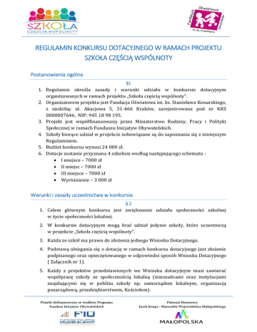 regulamin konkursu dotacyjnego w ramach projektu szkoła częścią