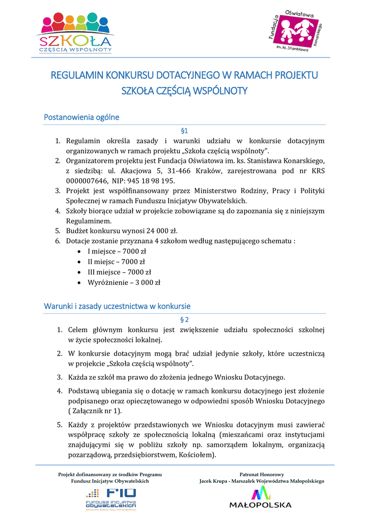 REGULAMIN KONKURSU DOTACYJNEGO W RAMACH PROJEKTU SZKOŁA CZĘŚCIĄ WSPÓLNOTY Postanowienia ogólne 1. 2. 3. 4. 5. 6. §1 Regulamin określa zasady i warunki udziału w konkursie dotacyjnym organizowanych w ramach projektu „Szkoła częścią wspólnoty”. Organizatorem projektu jest Fundacja Oświatowa im. ks. Stanisława Konarskiego, z siedzibą: ul. Akacjowa 5, 31-466 Kraków, zarejestrowana pod nr KRS 0000007646, NIP: 945 18 98 195. Projekt jest współfinansowany przez Ministerstwo Rodziny, Pracy i Polityki Społecznej w ramach Funduszu Inicjatyw Obywatelskich. Szkoły biorące udział w projekcie zobowiązane są do zapoznania się z niniejszym Regulaminem. Budżet konkursu wynosi 24 000 zł. Dotacje zostanie przyznana 4 szkołom według następującego schematu : I miejsce – 7000 zł II miejsc – 7000 zł III miejsce – 7000 zł Wyróżnienie – 3 000 zł Warunki i zasady uczestnictwa w konkursie §2 1. Celem głównym konkursu jest zwiększenie udziału społeczności szkolnej w życie społeczności lokalnej. 2. W konkursie dotacyjnym mogą brać udział jedynie szkoły, które uczestniczą w projekcie „Szkoła częścią wspólnoty”. 3. Każda ze szkół ma prawo do złożenia jednego Wniosku Dotacyjnego. 4. Podstawą ubiegania się o dotację w ramach konkursu dotacyjnego jest złożenie podpisanego oraz opieczętowanego w odpowiedni sposób Wniosku Dotacyjnego ( Załącznik nr 1). 5. Każdy z projektów przedstawionych we Wniosku dotacyjnym musi zawierać współpracę szkoły ze społecznością lokalną (mieszańcami oraz instytucjami znajdującymi się w pobliżu szkoły np. samorządem lokalnym, organizacją pozarządową, przedsiębiorstwem, Kościołem). Projekt dofinansowany ze środków Programu Fundusz Inicjatyw Obywatelskich Patronat Honorowy Jacek Krupa - Marszałek Województwa Małopolskiego 6. Wniosek Dotacyjny powinien być przygotowany przez uczniów we współpracy z nauczycielami oraz władzami szkoły. 7. Projekty dotacyjne mogą być realizowane od 01 kwietnia do 30 maja 2017 roku. 8. Wnioski Dotacyjne powinny zostać nadesłane do Fundacji Oświatowej pocztą na adres: Fundacja Oświatowa im. ks. S. Konarskiego, ul. Akacjowa 5, 31-466 Kraków oraz elektronicznie na adres: [email protected] do dnia 24 lutego 2017 roku (liczy się data wysłania pocztą tradycyjną). 9. Wysokość wnioskowanej dotacji nie może przekroczyć 7 000 zł. 10. Nie jest wymagany wkład własny finansowy. 11. Z ramienia Fundacji Oświatowej powołana zostanie osoba, której zadaniem będzie wsparcie szkół w trakcie pisania Wniosków Dotacyjnych. O powołaniu tej osoby oraz możliwości kontaktu z nią szkoły zostaną poinformowane drogą e-mailową. Procedura konkursowa i kryteria oceny wniosków §3 1. Wnioski Dotacyjne oceniane są w procedurze konkursowej, przebiegającej w II etapach: I etap – ocena formalna, II etap – ocena merytoryczna. Warunkiem dopuszczenia Wniosku do oceny merytorycznej jest pozytywna ocena Wniosku pod względem formalnym. 2. Kryteria formalne oceny Wniosku Dotacyjnego: a) wniosek złożony w terminie; b) wniosek złożony zgodnie z procedurą opisaną w §2 pkt.8; c) cele projektu dotacyjnego zgodne z celem głównym konkursu (§2pkt.1); d) podmiot uprawniony do ubiegania się o Dotację; e) harmonogram realizacji projektu zgodny z §2 pkt.7; f) kwota wnioskowanej dotacji nie przekracza 7000,00 złotych; g) nie występują koszty, które nie mogą być finansowane w ramach przyznanej dotacji. 3. Kryteria merytoryczne oceny Wniosku Dotacyjnego : I. Społeczny charakter projektu dotacyjnego a) udział społeczność szkolnej (uczniów, nauczycieli, władz szkoły) w przygotowaniu oraz realizacji projektu dotacyjnego; b) zaangażowanie społeczności lokalnej w przygotowanie projektu dotacyjnego; c) zaangażowanie społeczności lokalnej w realizację projektu dotacyjnego; Projekt dofinansowany ze środków Programu Fundusz Inicjatyw Obywatelskich Patronat Honorowy Jacek Krupa - Marszałek Województwa Małopolskiego 4. 5. 6. 7. d) wskazanie wpływu, jaki projekt ma wywrzeć na rozwój kapitału społecznego członków wspólnoty lokalnej oraz uczniów i nauczycieli; II. Logika projektu a) wykazanie potrzeb społecznych na jakie odpowiada projekt dotacyjny; b) przejrzyste sformułowanie celów, rezultatów, odbiorców oraz działań podjętych w projektu dotacyjnego; c) zgodność pomiędzy wskazanymi potrzebami, celami, rezultatami, działaniami oraz harmonogramem działań; III. Kosztorys a) kalkulacja kosztów ( zasadność kosztów mająca związek z działaniami podjętymi w ramach projektu); b) przedstawienie kosztorysu projektu w których zawarty będzie aspekt ograniczenia wydatków z nim związanych przez korzystanie z zasobów wspólnoty lokalnej; IV. Inne a) innowacyjność (na ile projekt proponuje nowatorskie lub nowe formy współpracy ze środowiskiem lokalnym); b) wskazanie w jakim stopniu projekt oddziałuje na społeczności lokalne oraz społeczność szkolną ; c) ukazanie możliwości długofalowej współpracy ze społecznością lokalną. Decyzja o przyznaniu dotacji podjęta zostanie przez grupę ekspertów powołanych przez Fundację Oświatową zgodnie z zawartymi w powyższym Regulaminie zasadami oraz w oparciu o Kartę Oceny Wniosku Dotacyjnego (Załącznik nr 3). Dotacje otrzymują projekty według punktacji, począwszy od największej liczby punktów. W konkursie zostaną przyznane 4 dotacje. Od decyzji w spawie przyznania dotacji nie przysługuje odwołanie. Wyniki konkursu zostaną ogłoszone na stronie Fundacji Oświatowej (www.oswiatowa.pjarzy.pl) do dnia 17 marca 2017 roku. O wynikach szkoły biorące udział w konkursie zostaną również powiadomione drogą e-mailową. Warunki korzystania z dotacji §4 1. Warunkiem korzystania z Dotacji jest podpisanie przez obie strony Umowy o dotację (dalej „Umowa”), która określa podstawowe warunki wykorzystania środków przekazanych w ramach Dotacji. 2. Do