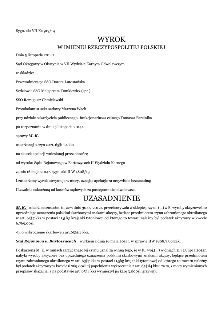 Sygn. akt VII Ka 919/14 WYROK W IMIENIU RZECZYPOSPOLITEJ POLSKIEJ Dnia 5 listopada 2014 r. Sąd Okręgowy w Olsztynie w VII Wydziale Karnym Odwoławczym w składzie: Przewodniczący: SSO Dorota Lutostańska Sędziowie SSO Małgorzata Tomkiewicz (spr.) SSO Remigiusz Chmielewski Protokolant st.sekr.sądowy Marzena Wach przy udziale oskarżyciela publicznego- funkcjonariusza celnego Tomasza Farelnika po rozpoznaniu w dniu 5 listopada 2014r. sprawy M. K. oskarżonej o czyn z art. 65§1 i 4 kks na skutek apelacji wniesionej przez obrońcę od wyroku Sądu Rejonowego w Bartoszycach II Wydziału Karnego z dnia 16 maja 2014r. sygn. akt II W 1808/13 I.zaskarżony wyrok utrzymuje w mocy, uznając apelację za oczywiście bezzasadną; II.zwalnia oskarżoną od kosztów sądowych za postępowanie odwoławcze. UZASADNIENIE M. K. oskarżona została o to, że w dniu 30.07.2012r. przechowywała w sklepie przy ul. (...) w B. wyroby akcyzowe bez uprzedniego oznaczenia polskimi skarbowymi znakami akcyzy, będące przedmiotem czynu zabronionego określonego w art. 63§7 kks w postaci 11,5 kg krajanki tytoniowej od którego to towaru należny był podatek akcyzowy w kwocie 6.769,00zł. -tj. o wykroczenie skarbowe z art.65§1i4 kks. Sąd Rejonowy w Bartoszycach wyrkiem z dnia 16 maja 2014r. w sprawie IIW 1808/13 orzekł ; I.oskarzoną M. K. w ramach zarzucanego jej czynu uznał za winną tego, że w K., woj.(...) w dniach 11 i 23 lipca 2012r. nabyła wyroby akcyzowe bez uprzedniego oznaczenia polskimi skarbowymi znakami akcyzy, będące przedmiotem czynu zabronionego określonego w art. 63§7 kks w postaci 11,5kg krajanki tytoniowej od którego to towaru należny był podatek akcyzowy w kwocie 6.769,00zł. tj.popełnienia wykroczenia z art. 65§1i4 kks i za to, z mocy wymienionych przepisów skazał ją, a na podstawie art. 65§4 kks wymierzył jej karę 3.000zł. grzywny; II.na podstawie art.49§1i2 kks w zw. z art. 29 ust.1 kks i art. 31§6 kks orzekł przepadek na rzecz Skarbu Państwa dowodów rzeczowych zabezpieczonych w sprawie, przechowywanych w magazynie depozytowym Urzedu Celnego w O. i zarządził ich zniszczenie; III.na podstawie art. 624§1 kpk w zw. z art.113§1 kks zwolnił oskarżoną od zapłaty na rzecz Skarbu Państwa kosztów sądowych w całości, w tym kosztów zniszczenia dowodów rzeczowych. Od tego wyroku apelację wniósł obrońca oskarżonej ,zaskarżając przedmiotowe orzeczenie w całości. Wyrokowi temu skarżący zarzucił obrazę przepisów postępowania, która miała wpływ na treść orzeczenia, a mianowicie : 1.przepisu art. 14 kpk poprzez przypisanie oskarżonej czynu wykraczającego poza ramy czynu zarzuconego aktem oskarżenia, a przez to naruszenie zasady skargowości; 2.przepisu art.170 §1 kpk w zw. z art. 6 kpk poprzez oddalenie wniosku dowodowego z dokumentacji z przeprowadzonych badań towaru zatrzymanego u oskarżonej oraz oględzin badanych próbek, co w konsekwencji, wobec braku informacji w sprawozdaniu co do próbobiorcy oraz daty pobrania próbki (k.62-63),co naruszyło prawo oskarżonej do obrony i uniemożliwiło poczynienie prawidłowych ustaleń w zakresie tożsamości badanych próbek z zatrzymanym towarem. Stawiając te zarzuty obrońca wniósł o zmianę zaskarżonego wyroku i uniewinnienie oskarżonej od zarzuconego jej czynu, ewentualnie o uchylenie tego wyroku i przekazanie sprawy Sądowi Rejonowemu w Bartoszycach do ponownego jej rozpoznania. Sąd Okręgowy zważył, co następuje : Apelacja nie jest zasadna, zawarte w niej zarzuty są nietrafne. Sąd Rejonowy dokonał prawidłowych ustaleń zarówno w aspekcie okoliczności stanu faktycznego, winy oskarżonej M. K. i kwalifikacji prawnej przypisanego jej czynu, jak również w aspekcie wymierzonej kary. Dokonana w tym zakresie analiza materiału dowodowego jest – wbrew twierdzeniom skarżącego- wnikliwa i jasna, w pełni odpowiada dyrektywom określonym w art. 4 kpk a przeprowadzone w oparciu o tę analizie wnioskowanie jest logiczne, zgodne z przesłankami wynikającymi z art. 7 kpk i przekonująco uzasadnione. Apelacja pomimo swej rozbudowanej treści nie wskazuje na żadne okoliczności, które nie byłyby przedmiotem uwagi Sądu Rejonowego i nie zawiera też takiej, merytorycznej argumentacji, która wnioskowanie tego Sądu mogłaby skutecznie podważyć. Odnosząc się w pierwszej kolejności do zarzutu wskazanego w pkt.2 apelacji stwierdzić należy, iż w niniejszej sprawie nie ma żadnych racjonalnych przesłanek, które mogłyby rodzić wątpliwości co do tego, że oględziny próbek zamieszczone na k.62-64 dotyczyły materiału zatrzymanego u oskarżonej. Oględziny te wprawdzie rzeczywiście – jak eksponuje to obrońca- nie wskazują próbobiorcy jednakże nie ulega wątpliwości, że odnoszą się one do postanowienia o powołaniu biegłego (k.43), które wydane zostało w odniesieniu do towaru zatrzymanego właśnie u M. K.. Tożsamość ta wynika zarówno z wyraźnego wskazania Zleceniodawcy (RKS (...) – sygnatura Urzędu Celnego w O. w sprawie dotyczącej M. K., data- 20.08.2012r. a więc data wydania postanowienia o powołaniu biegłego w sprawie M. K. ), jak również z ilości i gramatury próbek (paczek) towaru zatrzymanego u wymienionej oskarżonej. Sąd Rejonowy słusznie oddalił wniosek obrońcy o dołączenie próbek surowców badanych do innych spraw (k.299 i 341), ponieważ nie ma żadnej pewności, że owe „inne próbki” dotyczyłyby dokładnie tego samego towaru, który został zatrzymany w niniejszej sprawie, a zatem nie sposób uznać, aby analizy poczynione w oparciu o inne próbki, innych oskarżonych w innych sprawach, mogły być miarodajne dla rozstrzygnięcia kwestii odpowiedzialności M. K.. Co się zaś tyczy strony podmiotowej czynu przypisanego oskarżonej przypomnieć należy- gdyż o okoliczności tej zdaje się nie pamiętać obrońca- iż oskarżona nie tylko sprzedawała zakwestionowany towar w sklepie, w którym poza papierosami, tytoniem 