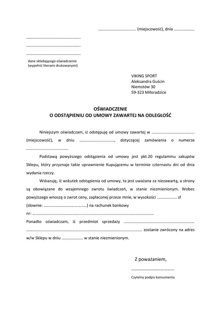 ………………………………. (miejscowość), dnia ……………….. …………………………………………….. …………………………………………….. …………………………………………….. dane składającego oświadczenie (wypełnić literami drukowanymi) VIKING SPORT Aleksandra Guścin Niemstów 30 59‐323 Miłoradzice OŚWIADCZENIE O ODSTĄPIENIU OD UMOWY ZAWARTEJ NA ODLEGŁOŚĆ Niniejszym oświadczam, iż odstępuję od umowy zawartej w …………………………………… (miejscowość), w dniu ……………………………., dotyczącej zamówienia o numerze ………………………………….. Podstawą powyższego odstąpienia od umowy jest pkt.20 regulaminu zakupów Sklepu, który przyznaje takie uprawnienie Kupującemu w terminie czternastu dni od dnia wydania rzeczy. Wskazuję, iż wskutek odstąpienia od umowy, ta jest uważana za niezawartą, a strony są obowiązane do wzajemnego zwrotu świadczeń, w stanie niezmienionym. Wobec powyższego wnoszę o zwrot ceny, zapłaconej przeze mnie, w wysokości .....………….. zł (słownie: ……………………………………) na rachunek bankowy nr: ……………………………………….....................................…………………………… Ponadto oświadczam, iż przedmiot sprzedaży …………………………………………………………… ………………………………………………………………………………………………….. zostanie zwrócony na adres w/w Sklepu w dniu ………………… w stanie niezmienionym. Z poważaniem, ……………………………… Czytelny podpis konsumenta