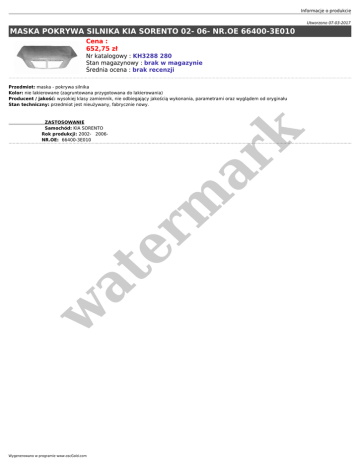 Informacje o produkcie Utworzono 07-03-2017 MASKA POKRYWA SILNIKA KIA SORENTO 02- 06- NR.OE 66400-3E010 Cena : 652,75 zł Nr katalogowy : KH3288 280 Stan magazynowy : brak w magazynie Średnia ocena : brak recenzji Przedmiot: maska - pokrywa silnika Kolor: nie lakierowane (zagruntowana przygotowana do lakierowania) Producent / jakość: wysokiej klasy zamiennik, nie odbiegający jakością wykonania, parametrami oraz wyglądem od oryginału Stan techniczny: przedmiot jest nieużywany, fabrycznie nowy. w at er m ar k ZASTOSOWANIE Samochód: KIA SORENTO Rok produkcji: 2002- 2006NR.OE: 66400-3E010 Wygenerowano w programie www.oscGold.com