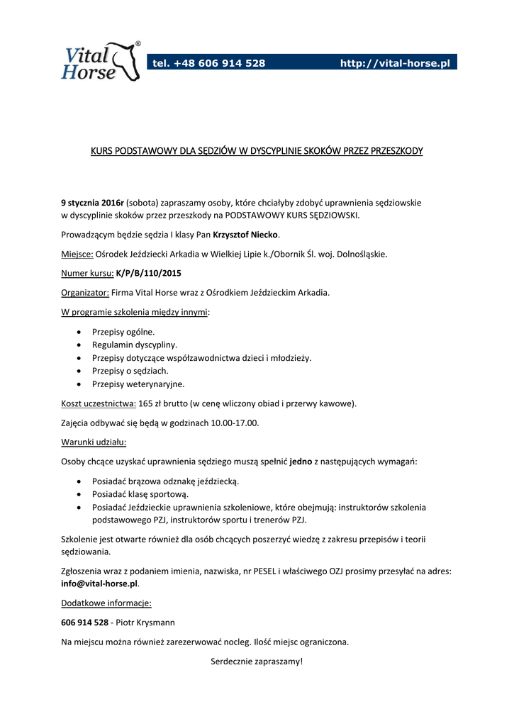 tel. +48 606 914 528 http://vital-horse.pl KURS PODSTAWOWY DLA SĘDZIÓW W DYSCYPLINIE SKOKÓW PRZEZ PRZESZKODY 9 stycznia 2016r (sobota) zapraszamy osoby, które chciałyby zdobyć uprawnienia sędziowskie w dyscyplinie skoków przez przeszkody na PODSTAWOWY KURS SĘDZIOWSKI. Prowadzącym będzie sędzia I klasy Pan Krzysztof Niecko. Miejsce: Ośrodek Jeździecki Arkadia w Wielkiej Lipie k./Obornik Śl. woj. Dolnośląskie. Numer kursu: K/P/B/110/2015 Organizator: Firma Vital Horse wraz z Ośrodkiem Jeździeckim Arkadia. W programie szkolenia między innymi: Przepisy ogólne. Regulamin dyscypliny. Przepisy dotyczące współzawodnictwa dzieci i młodzieży. Przepisy o sędziach. Przepisy weterynaryjne. Koszt uczestnictwa: 165 zł brutto (w cenę wliczony obiad i przerwy kawowe). Zajęcia odbywać się będą w godzinach 10.00-17.00. Warunki udziału: Osoby chcące uzyskać uprawnienia sędziego muszą spełnić jedno z następujących wymagań: Posiadać brązowa odznakę jeździecką. Posiadać klasę sportową. Posiadać Jeździeckie uprawnienia szkoleniowe, które obejmują: instruktorów szkolenia podstawowego PZJ, instruktorów sportu i trenerów PZJ. Szkolenie jest otwarte również dla osób chcących poszerzyć wiedzę z zakresu przepisów i teorii sędziowania. Zgłoszenia wraz z podaniem imienia, nazwiska, nr PESEL i właściwego OZJ prosimy przesyłać na adres: [email protected]. Dodatkowe informacje: 606 914 528 - Piotr Krysmann Na miejscu można również zarezerwować nocleg. Ilość miejsc ograniczona. Serdecznie zapraszamy!