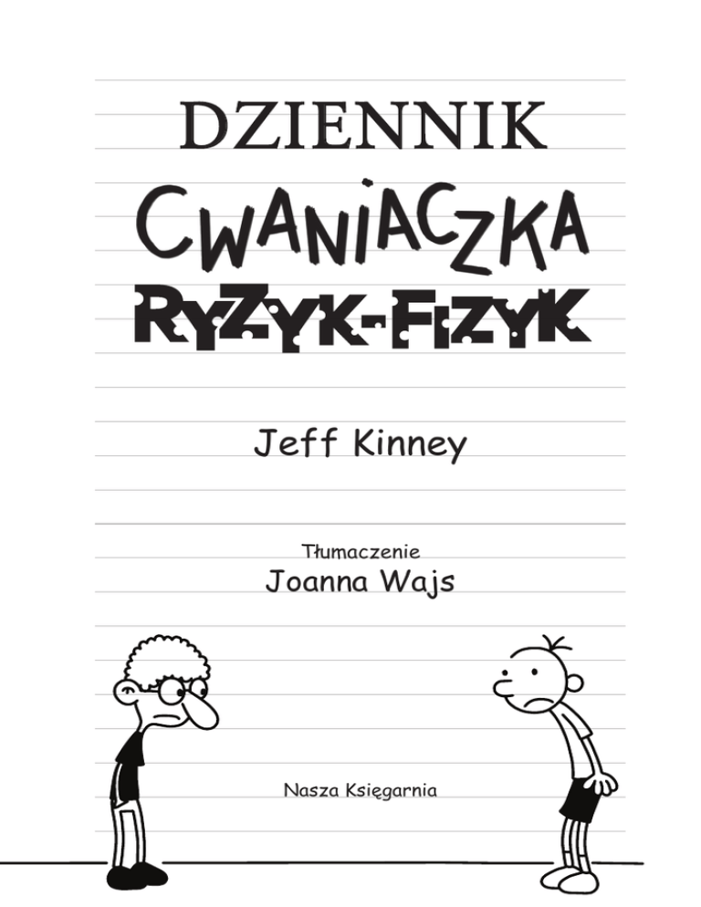 DZIENNIK Jeff Kinney Tłumaczenie Joanna Wajs Nasza Księgarnia Tytuł oryginału angielskiego: Diary of a Wimpy Kid: Double Down Wimpy Kid text and illustrations copyright © 2016 Wimpy Kid, Inc. DIARY OF A WIMPY KID®, WIMPY KID™, and the Greg Heffley design™ are trademarks of Wimpy Kid, Inc. All rights reserved. First published in the English language in 2016 by Harry N. Abrams, Incorporated, New York. Original English title: Diary of a Wimpy Kid: Double Down (All rights reserved in all countries by Harry N. Abrams, Inc.) © Copyright for the Polish edition by Wydawnictwo „Nasza Księgarnia”, Warszawa 2017 © Copyright for the Polish translation by Joanna Wajs, Warszawa 2017 DLA DORIANA Środa Mama próbuje zarazić Rodricka swoim entuzjazmem w kwestii wyższego wykształcenia. Mówi, że już najwyższy czas, aby mój brat zaczął rozglądać się za jakąś uczelnią. Ale Rodrick nadal jest przekonany, że jego kapela stanie się megapopularna i że studia to strata czasu dla kogoś takiego jak on. Mama chyba zaczyna się tym trochę martwić, bo zwolniła Rodricka z obowiązków domowych i kazała mu spędzać pół godziny dziennie na szukaniu szkoły. Rodrick napisał już w kilka miejsc z pytaniem o rekrutację i mama niesamowicie się ucieszyła, kiedy dostał odpowiedzi. Ale większość tych listów przyszła ze szkół dla PSÓW, co oznacza, że albo mój brat nie czytał ze zrozumieniem, albo tak właśnie ocenia swoje szanse dostania się na studia. 138 ET T UNIWERSY HAU KATEDRA TRESURY AKADEM IA HAU Rodrick nie okazuje zainteresowania tematem, więc mama skupia swoje wysiłki na MNIE. W poniedziałek pojechaliśmy na jej uczelnię, żebym zobaczył, jak wygląda kampus, no i muszę przyznać, że byłem pod wrażeniem. Wydawnictwo NASZA KSIĘGARNIA Sp. z o.o. 02-868 Warszawa, ul. Sarabandy 24c tel. 22 643 93 89, 22 331 91 49 faks 22 643 70 28 e-mail: [email protected] Dział Handlowy tel. 22 331 91 55, tel./faks 22 643 64 42 Sprzedaż wysyłkowa tel. 22 641 56 32 e-mail: [email protected] www.nk.com.pl Książkę wydrukowano na papierze Ecco-Book Cream 70 g/m2 wol. 2,0. Redaktor prowadzący Joanna Wajs Opieka redakcyjna Magdalena Korobkiewicz Korekta Ewa Mościcka, Małgorzata Ruszkowska Redakcja techniczna Joanna Piotrowska Skład i łamanie Mariusz Brusiewicz ISBN 978-83-10-13132-4 PRINTED IN POLAND Wydawnictwo „Nasza Księgarnia”, Warszawa 2017 Wydanie pierwsze Druk: POZKAL, Inowrocław
