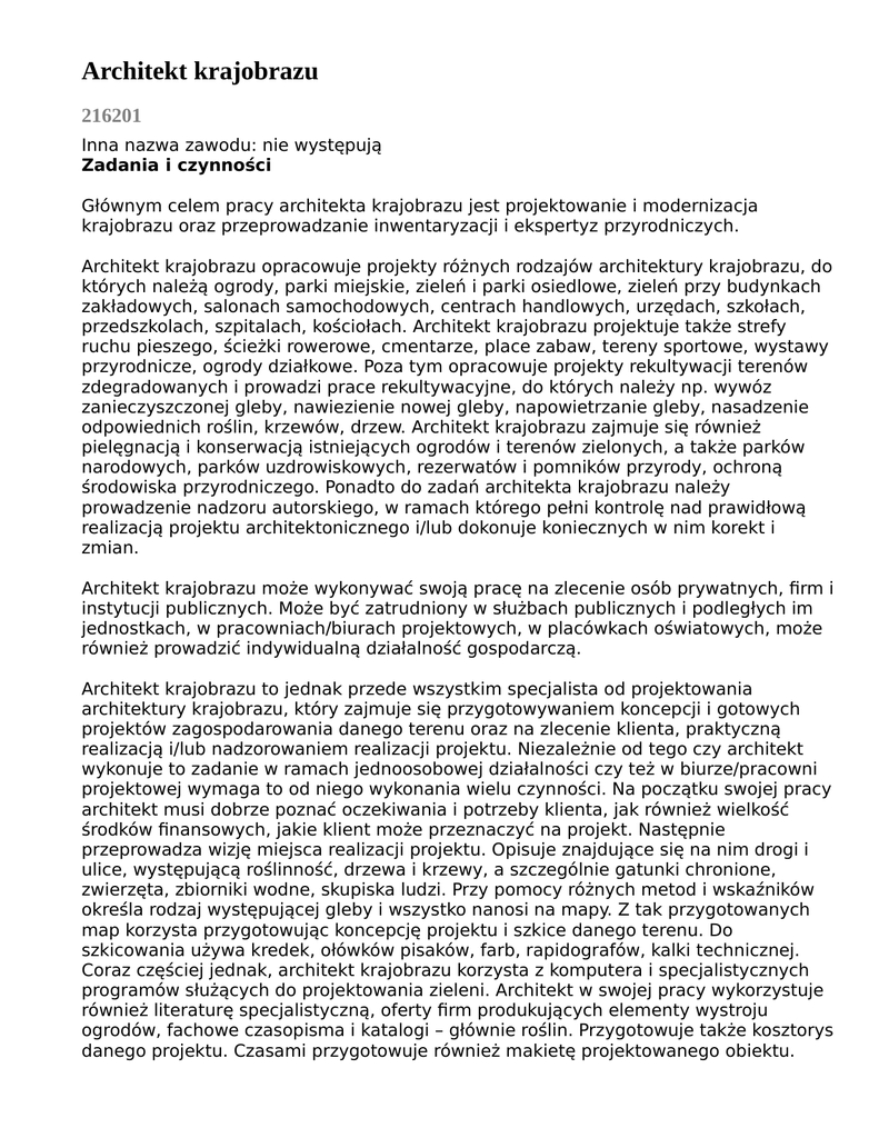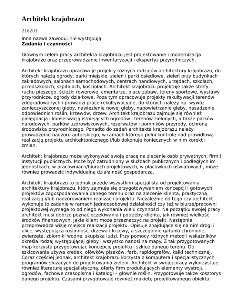 Architekt krajobrazu 216201 Inna nazwa zawodu: nie występują Zadania i czynności Głównym celem pracy architekta krajobrazu jest projektowanie i modernizacja krajobrazu oraz przeprowadzanie inwentaryzacji i ekspertyz przyrodniczych. Architekt krajobrazu opracowuje projekty różnych rodzajów architektury krajobrazu, do których należą ogrody, parki miejskie, zieleń i parki osiedlowe, zieleń przy budynkach zakładowych, salonach samochodowych, centrach handlowych, urzędach, szkołach, przedszkolach, szpitalach, kościołach. Architekt krajobrazu projektuje także strefy ruchu pieszego, ścieżki rowerowe, cmentarze, place zabaw, tereny sportowe, wystawy przyrodnicze, ogrody działkowe. Poza tym opracowuje projekty rekultywacji terenów zdegradowanych i prowadzi prace rekultywacyjne, do których należy np. wywóz zanieczyszczonej gleby, nawiezienie nowej gleby, napowietrzanie gleby, nasadzenie odpowiednich roślin, krzewów, drzew. Architekt krajobrazu zajmuje się również pielęgnacją i konserwacją istniejących ogrodów i terenów zielonych, a także parków narodowych, parków uzdrowiskowych, rezerwatów i pomników przyrody, ochroną środowiska przyrodniczego. Ponadto do zadań architekta krajobrazu należy prowadzenie nadzoru autorskiego, w ramach którego pełni kontrolę nad prawidłową realizacją projektu architektonicznego i/lub dokonuje koniecznych w nim korekt i zmian. Architekt krajobrazu może wykonywać swoją pracę na zlecenie osób prywatnych, firm i instytucji publicznych. Może być zatrudniony w służbach publicznych i podległych im jednostkach, w pracowniach/biurach projektowych, w placówkach oświatowych, może również prowadzić indywidualną działalność gospodarczą. Architekt krajobrazu to jednak przede wszystkim specjalista od projektowania architektury krajobrazu, który zajmuje się przygotowywaniem koncepcji i gotowych projektów zagospodarowania danego terenu oraz na zlecenie klienta, praktyczną realizacją i/lub nadzorowaniem realizacji projektu. Niezależnie od tego czy architekt wykonuje to zadanie w ramach jednoosobowej działalności czy też w biurze/pracowni projektowej wymaga to od niego wykonania wielu czynności. Na początku swojej pracy architekt musi dobrze poznać oczekiwania i potrzeby klienta, jak również wielkość środków finansowych, jakie klient może przeznaczyć na projekt. Następnie przeprowadza wizję miejsca realizacji projektu. Opisuje znajdujące się na nim drogi i ulice, występującą roślinność, drzewa i krzewy, a szczególnie gatunki chronione, zwierzęta, zbiorniki wodne, skupiska ludzi. Przy pomocy różnych metod i wskaźników określa rodzaj występującej gleby i wszystko nanosi na mapy. Z tak przygotowanych map korzysta przygotowując koncepcję projektu i szkice danego terenu. Do szkicowania używa kredek, ołówków pisaków, farb, rapidografów, kalki technicznej. Coraz częściej jednak, architekt krajobrazu korzysta z komputera i specjalistycznych programów służących do projektowania zieleni. Architekt w swojej pracy wykorzystuje również literaturę specjalistyczną, oferty firm produkujących elementy wystroju ogrodów, fachowe czasopisma i katalogi – głównie roślin. Przygotowuje także kosztorys danego projektu. Czasami przygotowuje również makietę projektowanego obiektu. Architekt krajobrazu zajmuje się także wykonawstwem, czyli praktycznym wykonaniem projektu na podstawie umowy zawartej z klientem. Podczas realizacji projektu bądź pielęgnacji obiektów architektury krajobrazu wykorzystywane są różne narzędzia, np. szpadel, młotek, graca, sekator, przyrządy kontrolno-pomiarowe oraz pojazdy i maszyny, np. do transportu roślin, koparka, glebogryzarka. Jeśli architekt krajobrazu sam zajmuje się wykonawstwem, musi umieć posługiwać się narzędziami, przyrządami i maszynami. Sam dobiera, kupuje i sadzi rośliny, krzewy, drzewa, buduje oczka wodne, fontanny, źródełka, ścieżki ogrodowe, tarasy, zakłada trawniki i systemy oświetlenia ogrodu i nawadniania. Zazwyczaj jednak przy realizacji projektów zatrudnia pracowników, którzy potrafią obsługiwać niezbędne maszyny, wykonują prace fizyczne, wtedy architekt krajobrazu nadzoruje ich pracę. Jeśli wymaga tego projekt, architekt korzysta także z pomocy specjalistów innych dziedzin, np. architektów, urbanistów, geodetów, elektryków. Ponadto architekt krajobrazu może świadczyć jedynie usługi doradcze, jeśli klient sam chce realizować projekt lub świadczyć tylko usługi pielęgnacyjne. Wykonuje wówczas takie prace, jak koszenie, napowietrzanie i podlewanie trawników, odchwaszczanie, nawożenie, cięcia pielęgnacyjne i odmładzające, zwalczanie szkodników, oczyszczanie obiektów wodnych, przesadzanie roślin, zabezpieczanie roślin na zimę. Nieco inne zadania ma architekt krajobrazu zatrudniony w służbach publicznych (urzędy miast). Tu jego praca nie polega na opracowywaniu projektów architektury krajobrazu, ale bardziej związana jest z zarządzaniem terenami zielonymi. Architekt zajmuje się wówczas organizacją konkursów i przetargów na wykonawstwo projektów terenów zieleni, a także nadzorem nad ich wykonawstwem. Architekt krajobrazu może także pracować w przedsiębiorstwach usług komunalnych, przedsiębiorstwach robót ogrodniczych. W tych pierwszych, nadzoruje prace pielęgnacyjne i konserwatorskie terenów zieleni dla miasta, np. cięcia sanitarne i pielęgnacyjne, nasadzenia roślin, krzewów, drzew, wycinkę drzew, koszenie traw. Natomiast w przedsiębiorstwach robót ogrodniczych prowadzi inwentaryzację, czyli spis roślinności na danym terenie, projektuje tereny zieleni (ogrody, klomby, rabaty, trawniki), zakłada i/lub nadzoruje zakładanie i pielęgnację zieleni. Architekt krajobrazu może również zajmować się dydaktyką w placówkach oświatowych. Zajmuję się wówczas przekazywaniem uczniom i studentom wiedzy o projektowaniu ogrodów, historii 