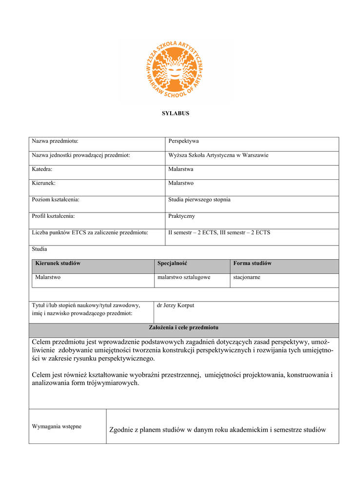SYLABUS Nazwa przedmiotu: Perspektywa Nazwa jednostki prowadzącej przedmiot: Wyższa Szkoła Artystyczna w Warszawie Katedra: Malarstwa Kierunek: Malarstwo Poziom kształcenia: Studia pierwszego stopnia Profil kształcenia: Praktyczny Liczba punktów ETCS za zaliczenie przedmiotu: II semestr – 2 ECTS, III semestr – 2 ECTS Studia Kierunek studiów Specjalność Forma studiów Malarstwo malarstwo sztalugowe stacjonarne Tytuł i/lub stopień naukowy/tytuł zawodowy, imię i nazwisko prowadzącego przedmiot: dr Jerzy Korput Założenia i cele przedmiotu Celem przedmiotu jest wprowadzenie podstawowych zagadnień dotyczących zasad perspektywy, umożliwienie zdobywanie umiejętności tworzenia konstrukcji perspektywicznych i rozwijania tych umiejętności w zakresie rysunku perspektywicznego. Celem jest również kształtowanie wyobraźni przestrzennej, umiejętności projektowania, konstruowania i analizowania form trójwymiarowych. Wymagania wstępne Zgodnie z planem studiów w danym roku akademickim i semestrze studiów Zamierzony efekt kształcenia Symbol efektu kształcenia na poziomie kierunku K_W01 K_W03 Opis efektów kształcenia na poziomie przedmiotu Umie dostosować technologie i materiały malarskie do zaplanowanego projektu. Rozumie znaczenie fachowej terminologii posiada podstawową wiedzę dotyczącą zasad perspektywy, zna rodzaje perspektywy linearnej. K_W16 Jest zdolny świadomie wykorzystywać wzajemne relację zachodzące pomiędzy teoretycznymi a praktycznymi zagadnieniami dotyczącymi perspektywy oraz aspektami studiowania. K_U01 Posiada świadomą umiejętność projektowania, konstruowania i analizowania form zarówno płaskich jak i trój-wymiarowych. K_U03 Potrafi zrozumieć wzajemne relacje zachodzące pomiędzy formą dzieła plastycznego a niesionym przez nie komunikatem. K_U04 Jest zdolny samodzielnie przewidywać efekty własnej pracy i tworzonych projektów pod kątem estetycznym, społecznym i kulturowym. K_U05 Umie świadomie i swobodnie poruszać się w obszarze malarstwa i rysunku , potrafi poprawnie tworzyć konstrukcje perspektywiczne i wykorzystać tę wiedzę w rysunku i pracach projektowych. K_U13 Posiada umiejętność świadomego wykorzystania poznanych rodzajów perspektywy w twórczości własnej, oraz w realizacji projektów o charakterze interdyscyplinarnym Potrafi tworzyć syntetyczne kompozycje plastyczne, w oparciu o poznaną wiedzę. K_U16 Posiada umiejętność świadomego rozwoju własnej osobowości twórczej poprzez właściwe i kreatywne wykorzystanie indywidualnych umiejętności warsztatowych 2 Weryfikacja efektu kształcenia Egzamin / zaliczenie na ocenę Przegląd prac K_U18 Potrafi wykorzystywać własną intuicję i wyobraźnię w procesie konstruowania projektów perspektywy o wysokich walorach artystycznych. K_K03 Jest zdolny do uczenia i pogłębiania swojej wiedzy dotyczących dotyczącej kompozycji i budowy obrazu, swobodnego łączenia różnych technik w jednym obrazie oraz wykorzystania jej w promocji swoich pracach i projektach artystycznych. K_K04 Potrafi efektywnie wykorzystać wyobraźnię, intuicję, twórczą postawę i samodzielne myślenie w celu samodzielnej promocji własnych osiągnięć artystycznych, znajomość terminologii w dziedzinie sztuk pięknych. Liczba godzin dydaktycznych i formy zajęć i punkty ECTS: Liczba godzin dydaktycznych (w tym): Przedmioty Forma zajęć: (W - wykład, Ć - ćwiczenia, K konwersatorium) Razem W Ć W+Ć 60 20 40 Perspektywa Rok I Semestr I W Ć K ECT S Rok II Semestr II R K W Ć 10 20 K Rok III Semestr III ECT S R W Ć 2 Zo 10 20 EC K TS 2 Semestr IV R W Ć K ECT S Semestr V R W Ć K ECT S Rok IV Semestr VI R W Ć K ECT S R Semestr VII E C W Ć K TS R E R – rygor (egzamin – E, zaliczenie z oceną – Zo, zaliczenie – Z) Treści programowe nauczania [ treść zajęć] Semestr II Wykład 1 [ 4 h] Spotkanie organizacyjne. Omówienie wiadomości teoretycznych: Co to jest perspektywa malarska? Wykład 2 [ 4h] Omówienie perspektyw. Perspektywa linearna; zbieżna (czołowa, boczna, ukośna, żabia (punkt widzenia położony nisko) i ptasia (punkt widzenia położony wysoko) Wykład 3 [ 2h] Perspektywa odwrócona stosowana w pisaniu ikon. Perspektywa odwrócona ukazująca sposób oddania trójwymiarowych przedmiotów na płaszczyźnie. Ćwiczenia 1 – 5 Studium form podstawowych. Ćwiczenie 6 – 10 Kreślenie perspektyw linearnych. Kreślenie perspektywy charakterystycznej dla malarstwa ikon. Ćwiczenie 11 – 15 Obserwacja perspektywy powietrznej i tworzenie malarstwa z zastosowaniem prespektywy powietrznej. Ćwiczenie 16 – 20 Obserwacja perspektywy powietrznej i tworzenie malarstwa z zastosowaniem prespektywy powietrznej c.d. Malarstwo w 3 plenerze. Semestr III Wykład 1 [ 2h] Spotkanie organizacyjne. Omówienie pespektyw. Perspektywa topograficzna ukazana na przykładach ze starożytności, jako przedstawienie krajobrazu na płaszczyźnie z góry przy jednoczesnym zaznaczeniu w nim obiektów widzianych z boku (np. domy, drzewa). Piero della Francesca brąz pt: Hieronima dawniej Biczowanie Chrystusa i Idealne miasto - "na dnie studni" - ''schody na strych" - "drabina Jakubowa" Wykład 2 [ 2h] Omówienie perspektyw: Perspektywa rzędowa jako najstarszy znanym człowiekowi sposób oddawania głębi, w niej elementy bardziej oddalone są umieszczone wyżej. Perspektywa kulisowa czyli jak formy zachodzące w obrazie jedna na drugą wywołującą wrażenie, że ta, która ukazana jest w całości, znajduje się bliżej patrzącego, a ta, która pokazana jest tylko częściowo dalej. Wykład 3 [ 2h] Omówienie perspektyw: Perspektywa intencjonalna, hieratyczna, która pokazuje jak osoba najważniejsza na obrazie przedstawiona jest w skali większej niż otoczenie np.: Malarstwo Egiptu. Perspektywa powietrzna i jej obserwacja, jak w miarę oddalania się w kierunku horyzontu zwiększa się warstwa powietrza między obiektem a obserwującym nabierając koloru jasno niebieskie